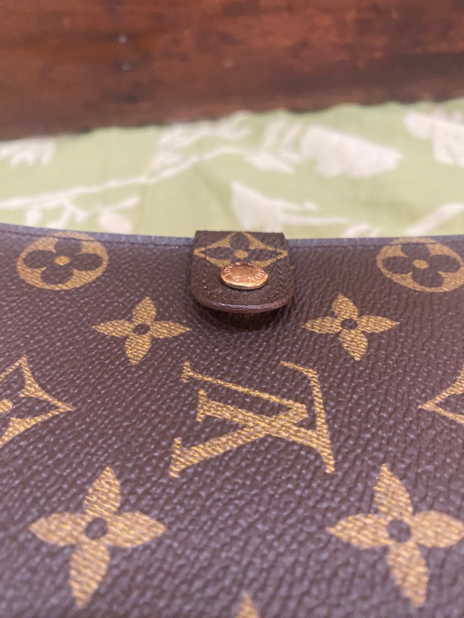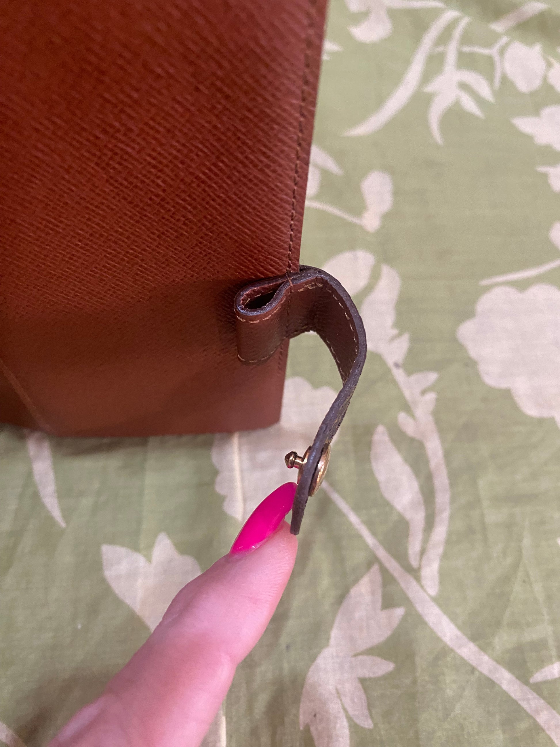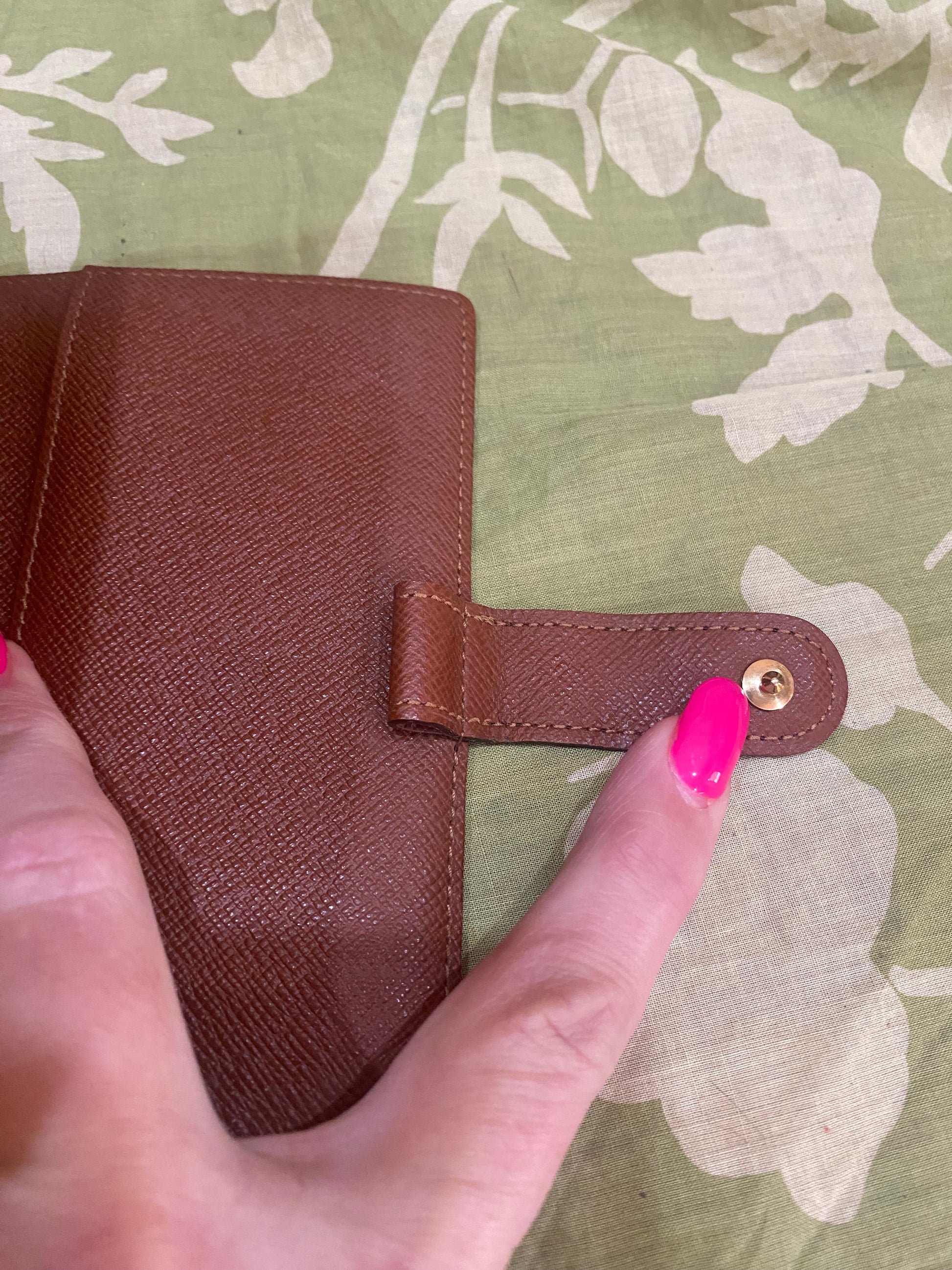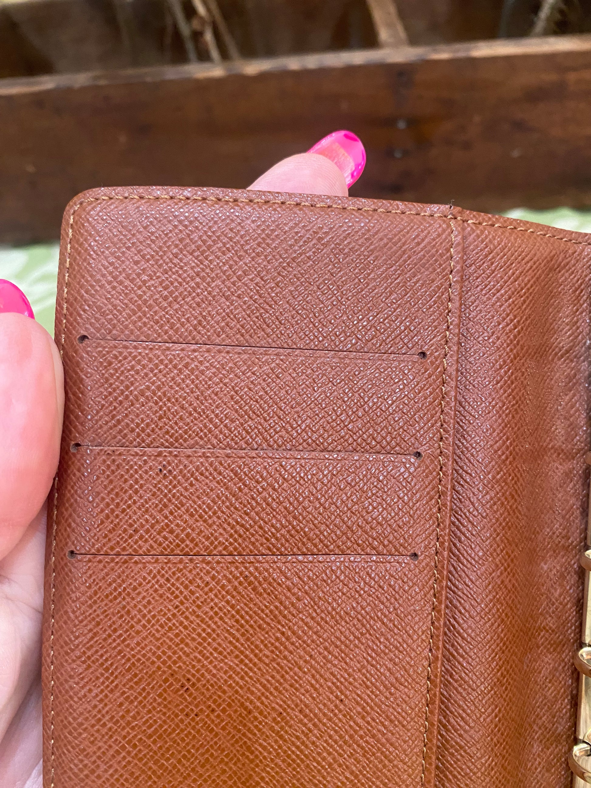 Canvas is free of cracking or tears, print is vibrant, snap is shiny and secure, glazing is intact, metal rings are tight, no stretching of credo card slots, left pocket only has some light peeling-no stickiness, right pocket is good, no foul smells. Comes with stickers and box.