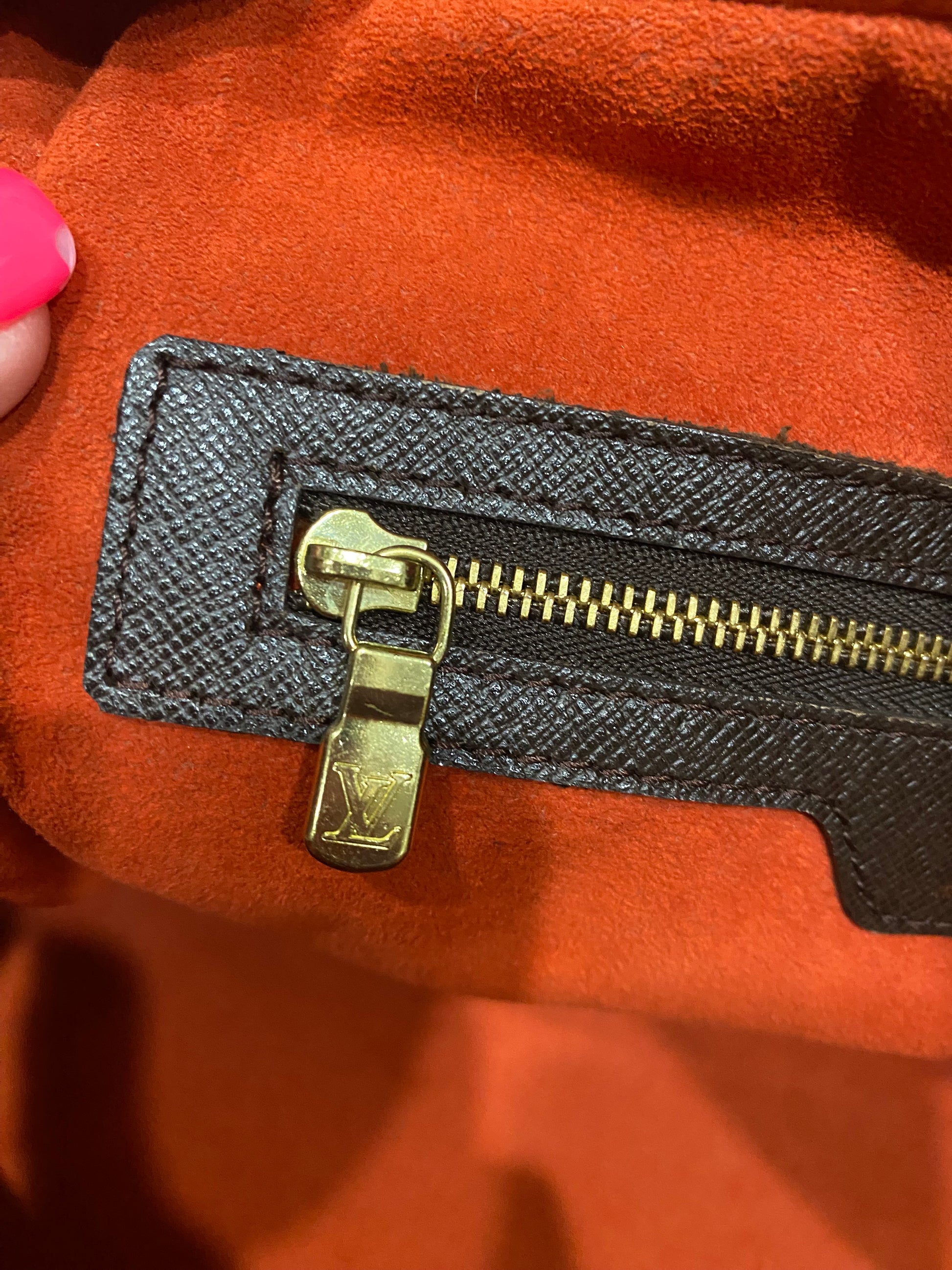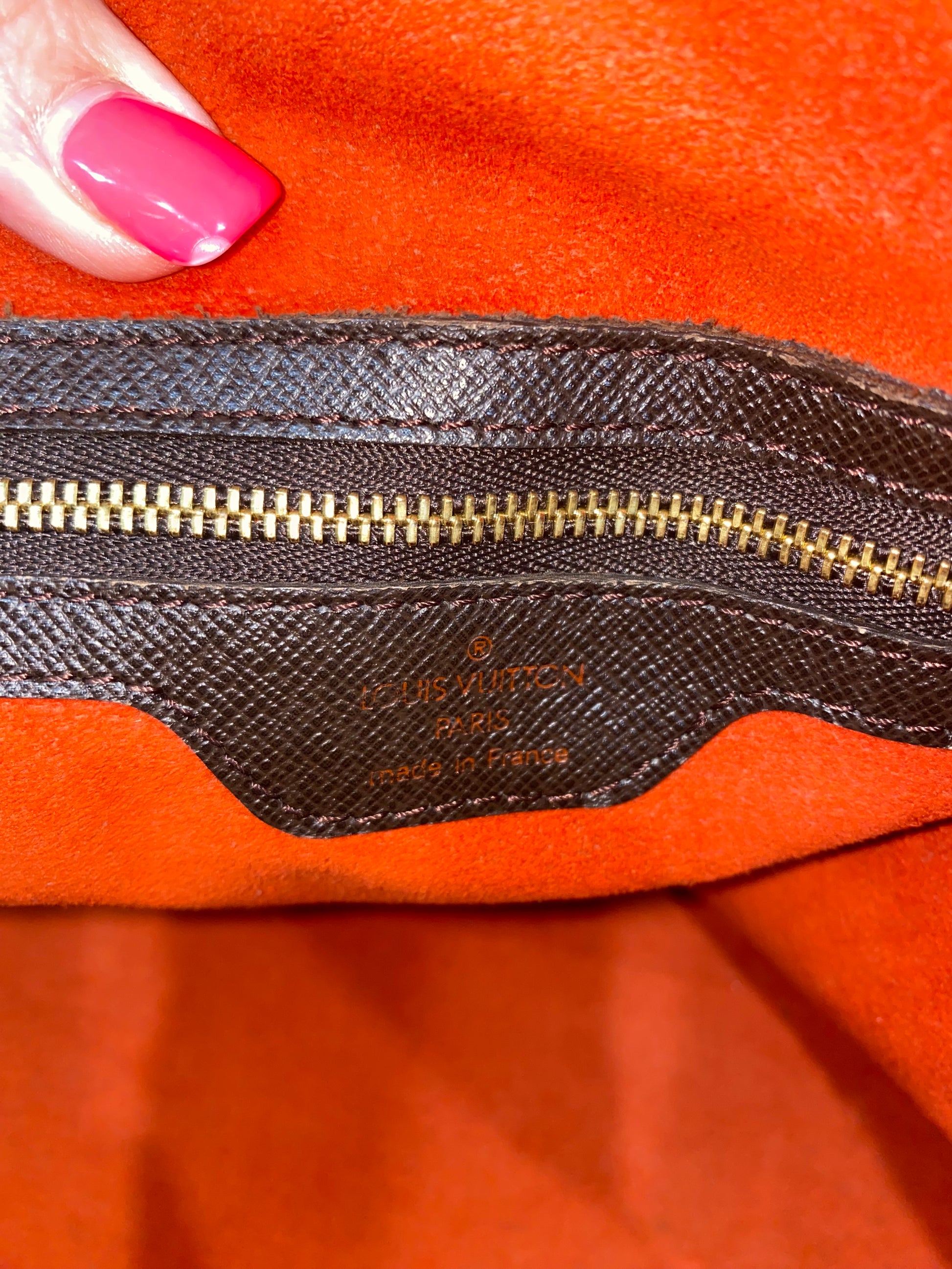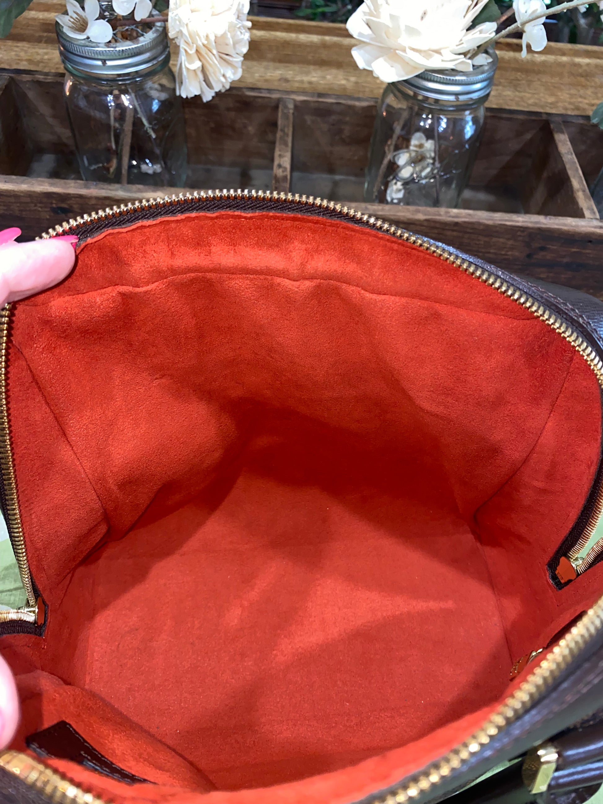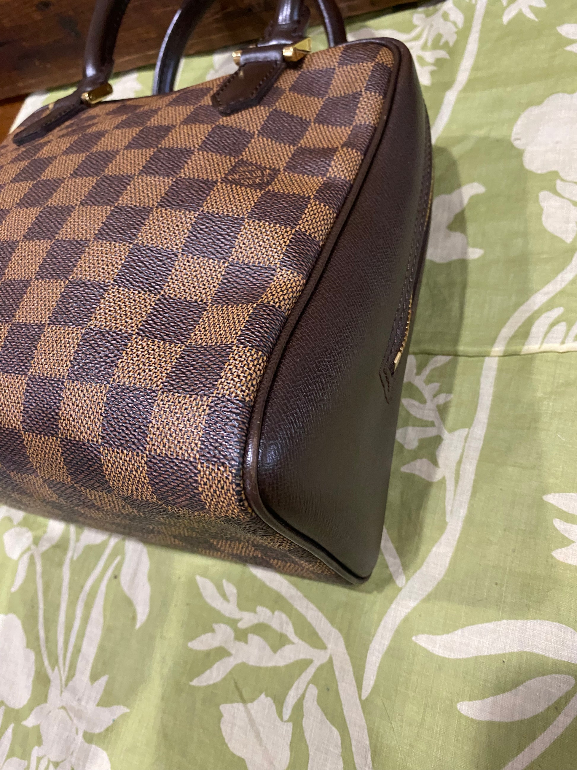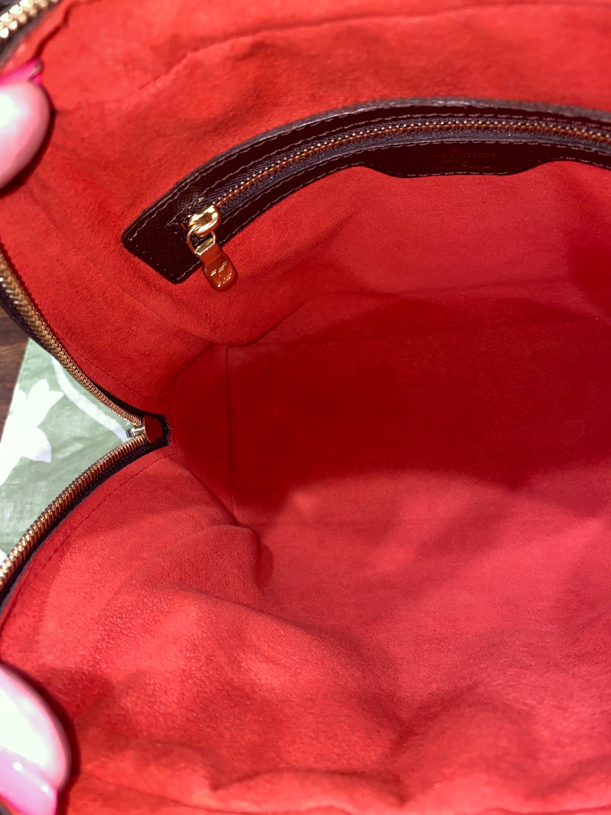 Beautiful condition❤️ Canvas is free of cracking or tears, print is vibrant, handles are clean and look amazing, leather piping has minimal rubs, interior shows signs of normal light use, has pen mark inside the zippered pocket, zippers run smooth, hardware is shiny, no foul smells.