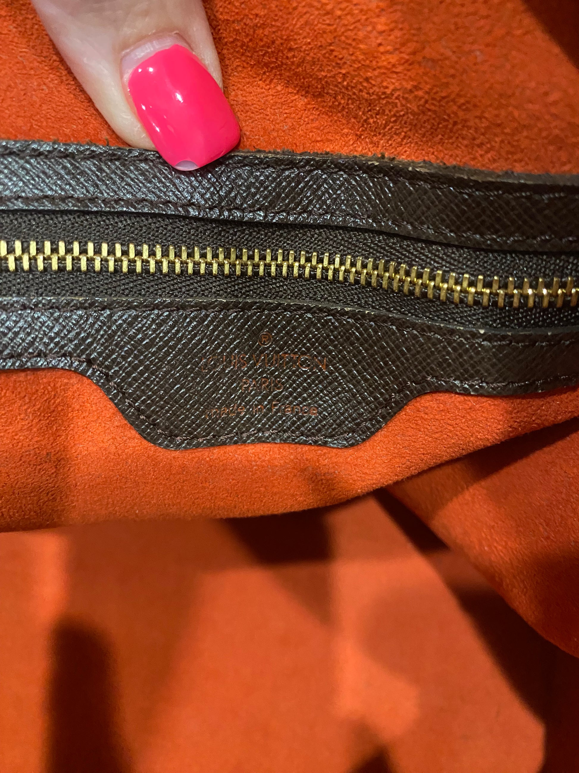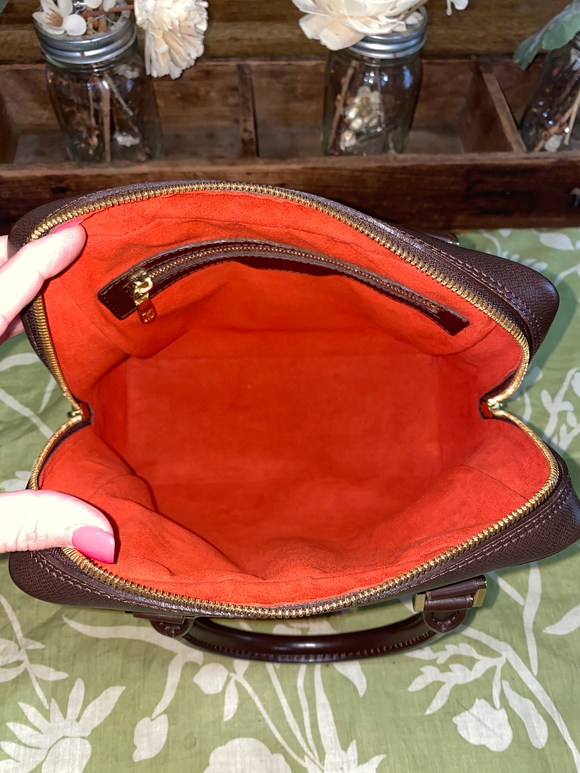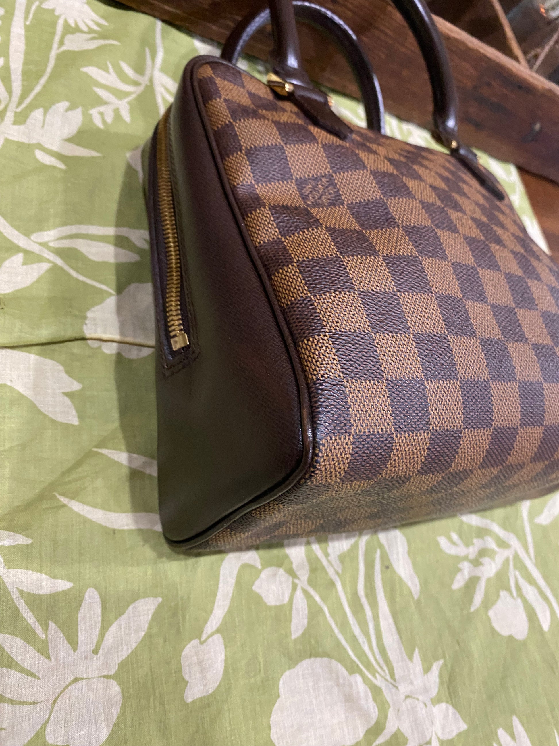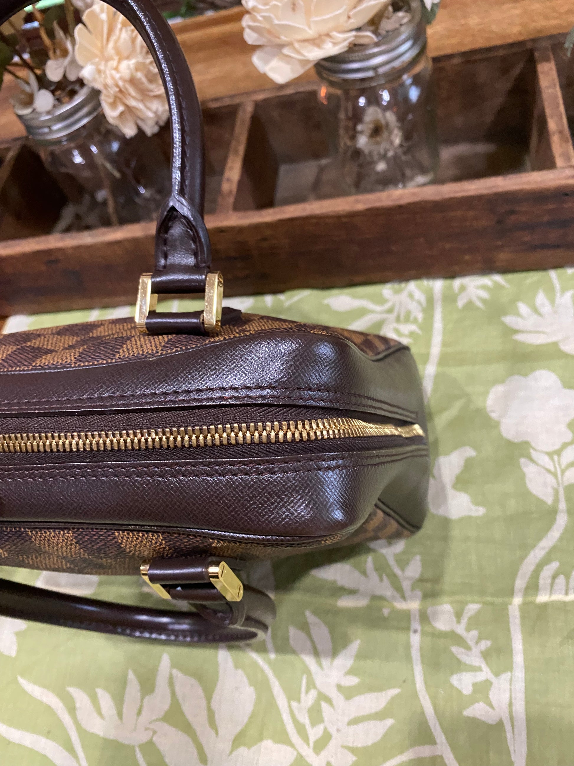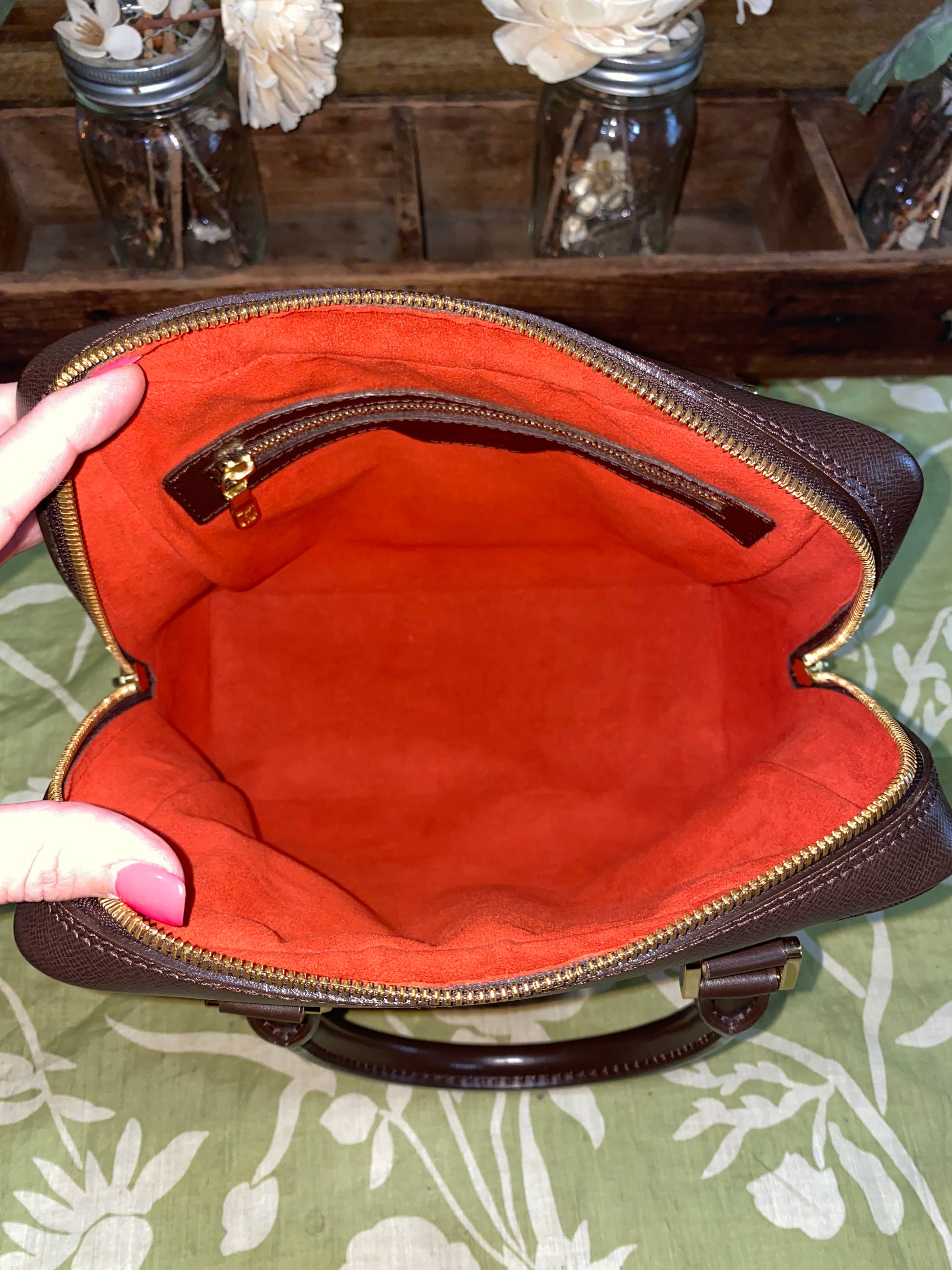 Beautiful condition❤️ Canvas is free of cracking or tears, print is vibrant, handles are clean and look amazing, leather piping has minimal rubs, interior shows signs of normal light use, has pen mark inside the zippered pocket, zippers run smooth, hardware is shiny, no foul smells.