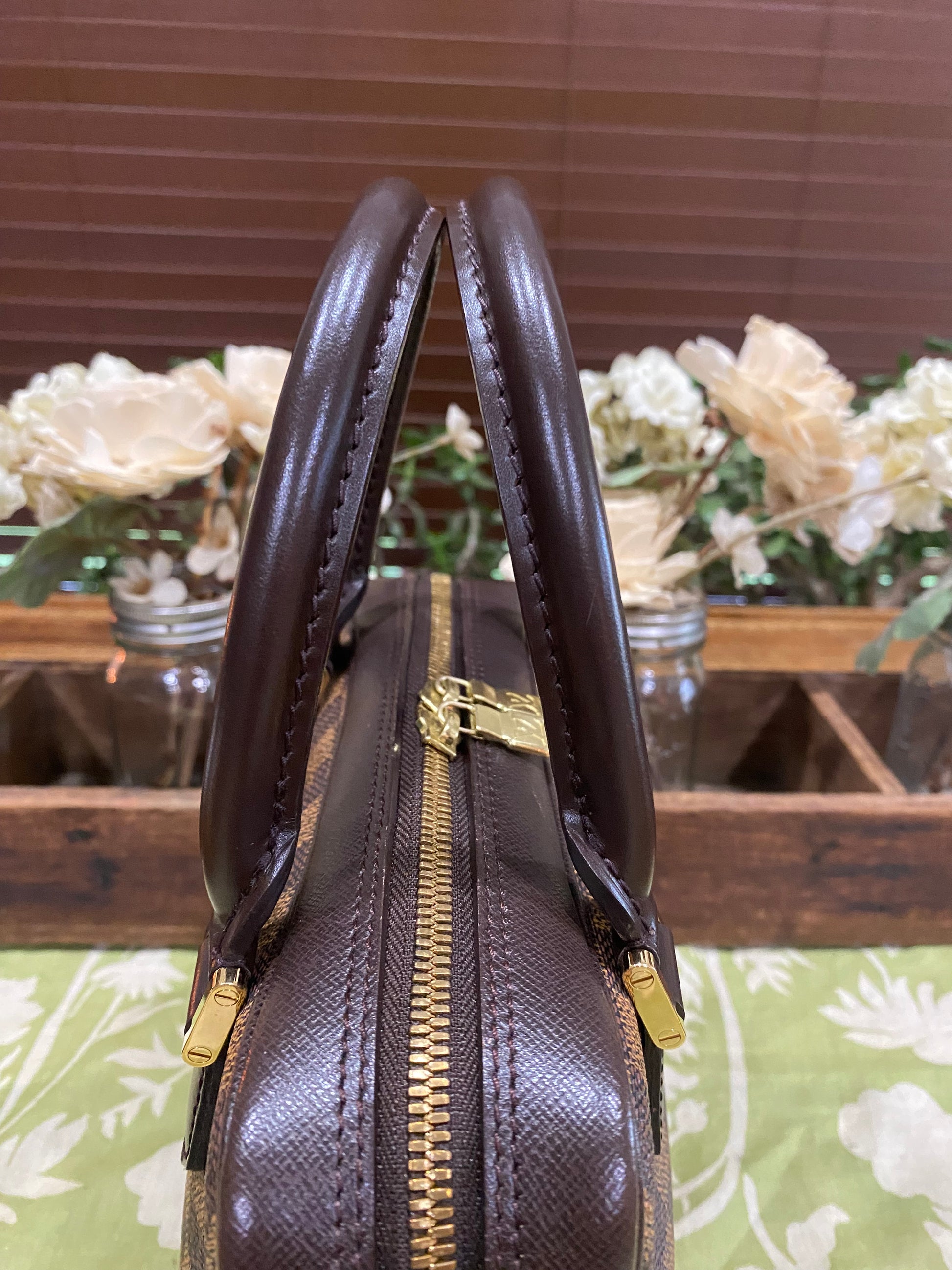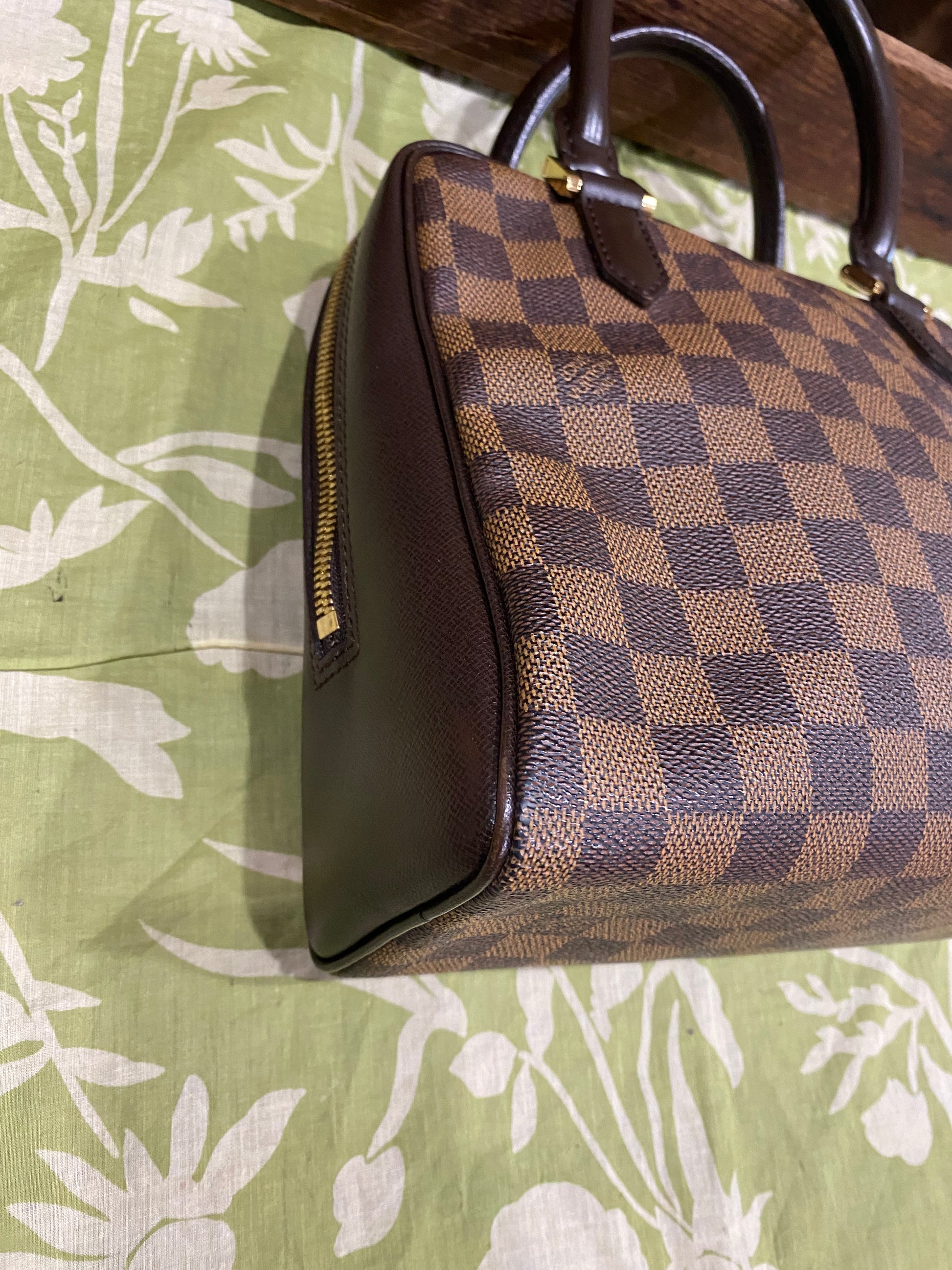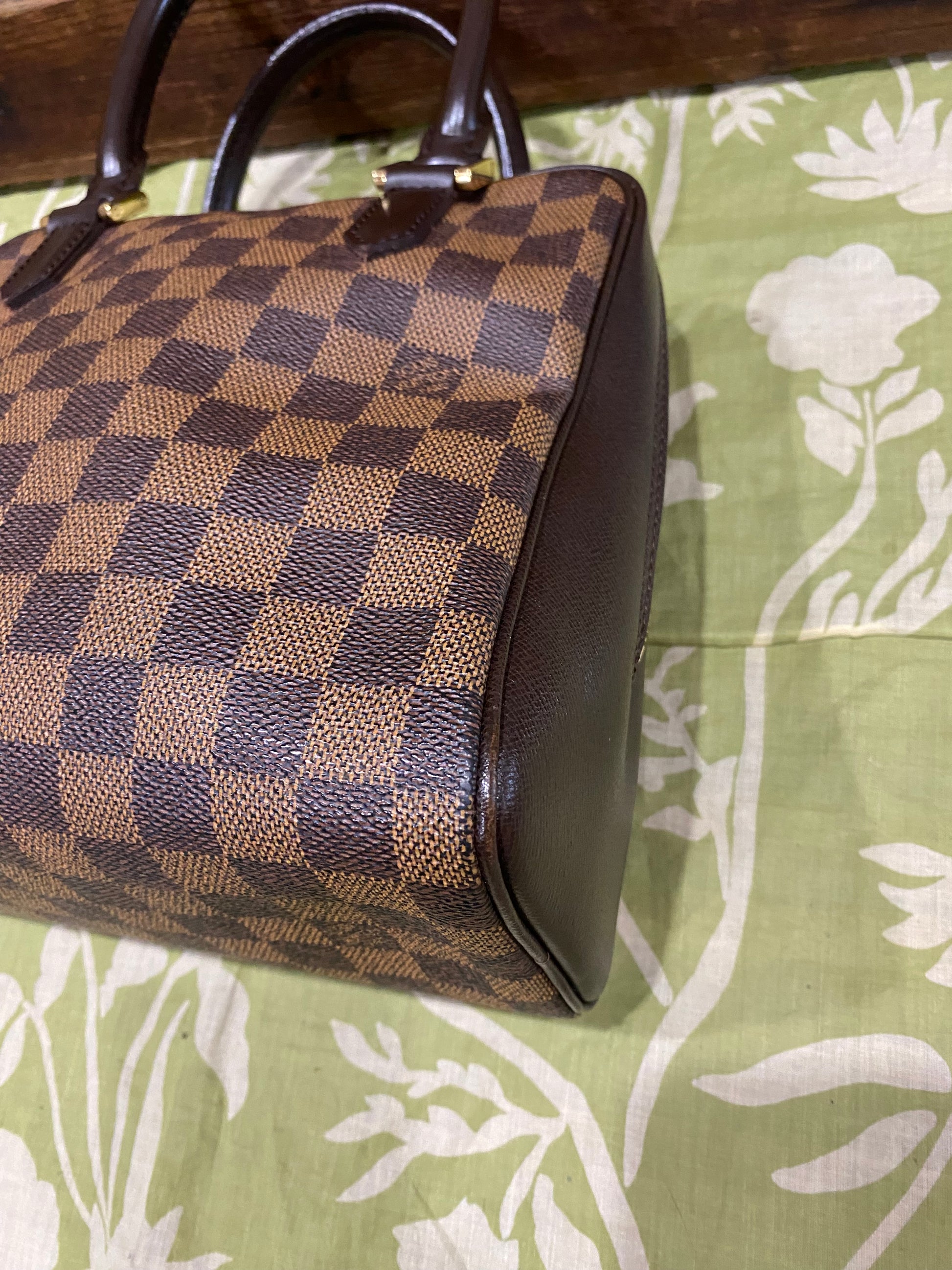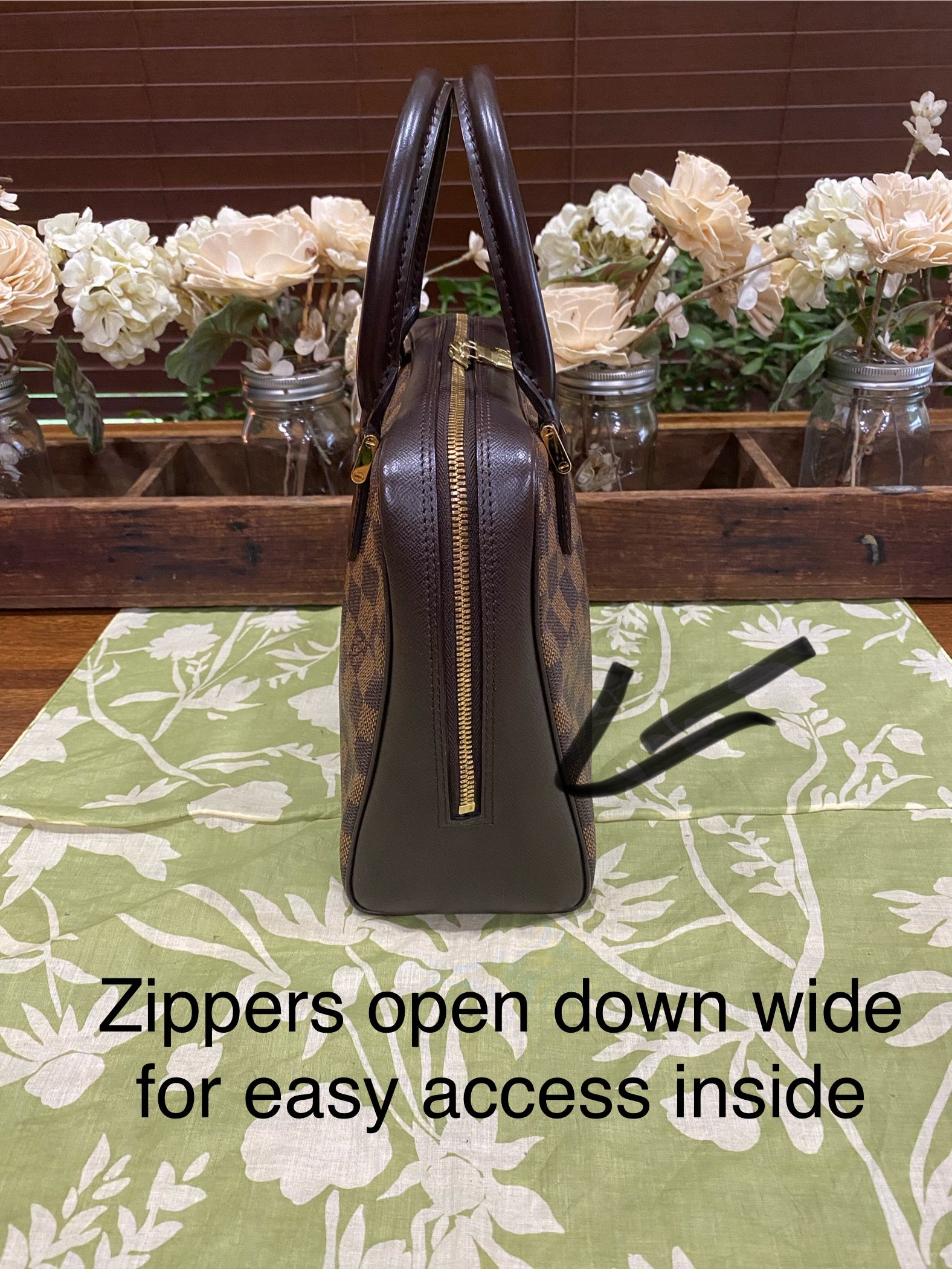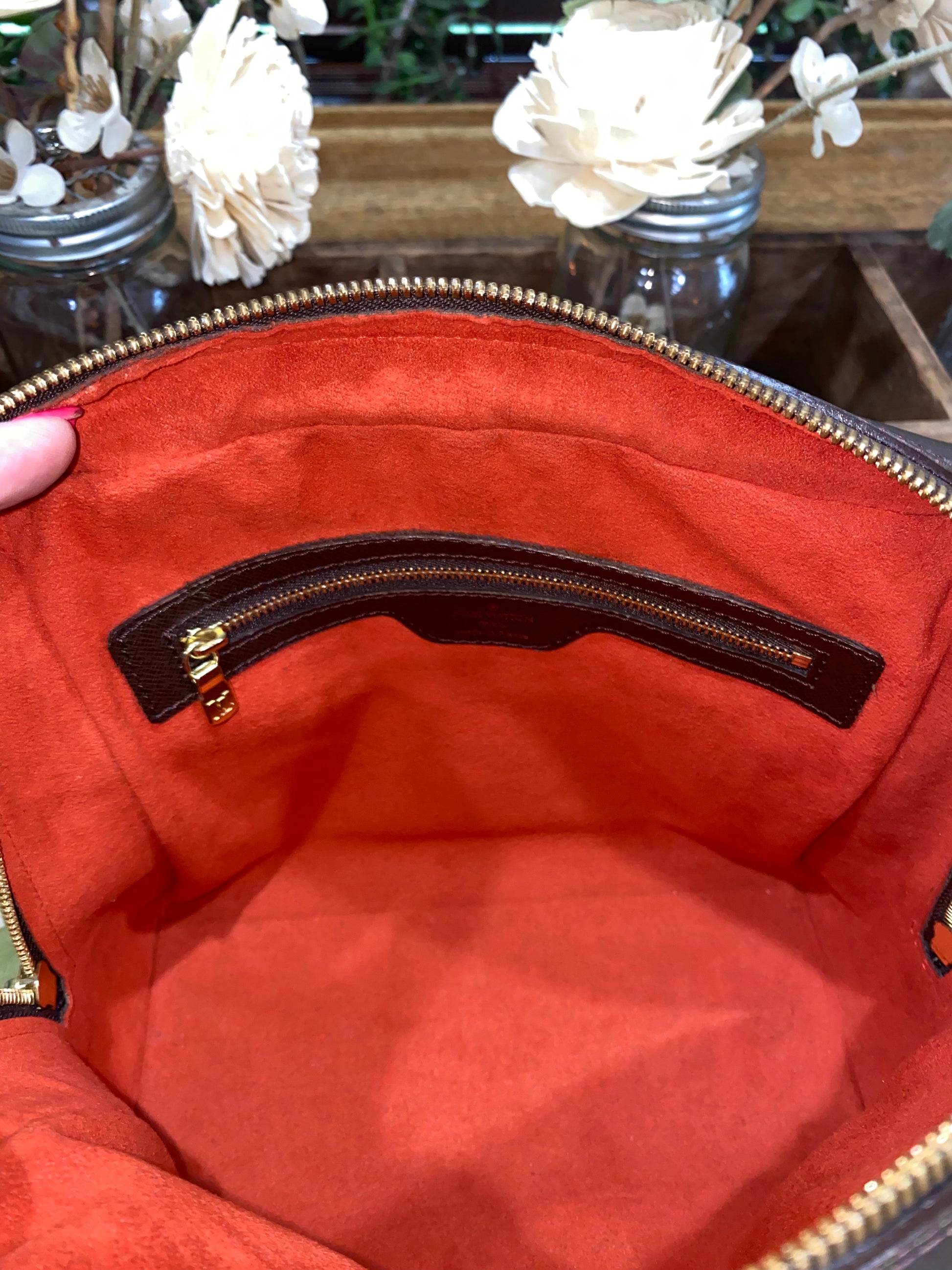 Beautiful condition❤️ Canvas is free of cracking or tears, print is vibrant, handles are clean and look amazing, leather piping has minimal rubs, interior shows signs of normal light use, has pen mark inside the zippered pocket, zippers run smooth, hardware is shiny, no foul smells.