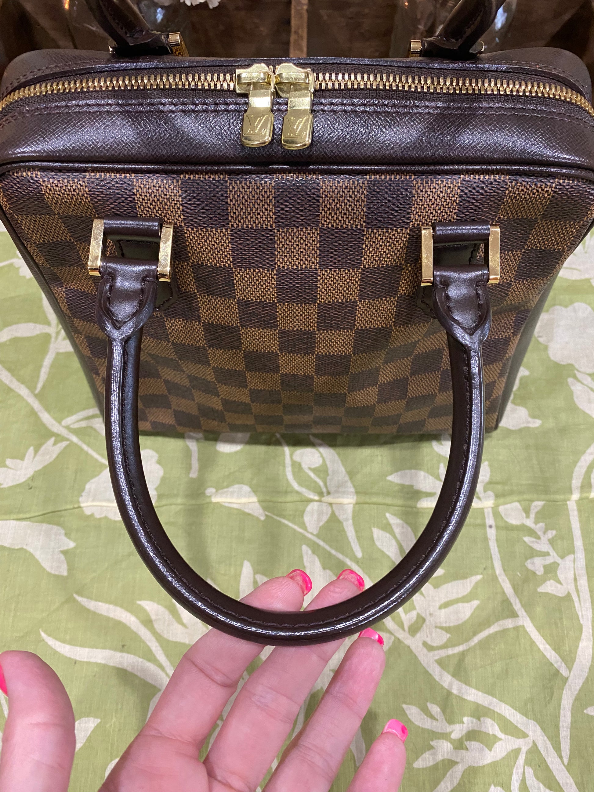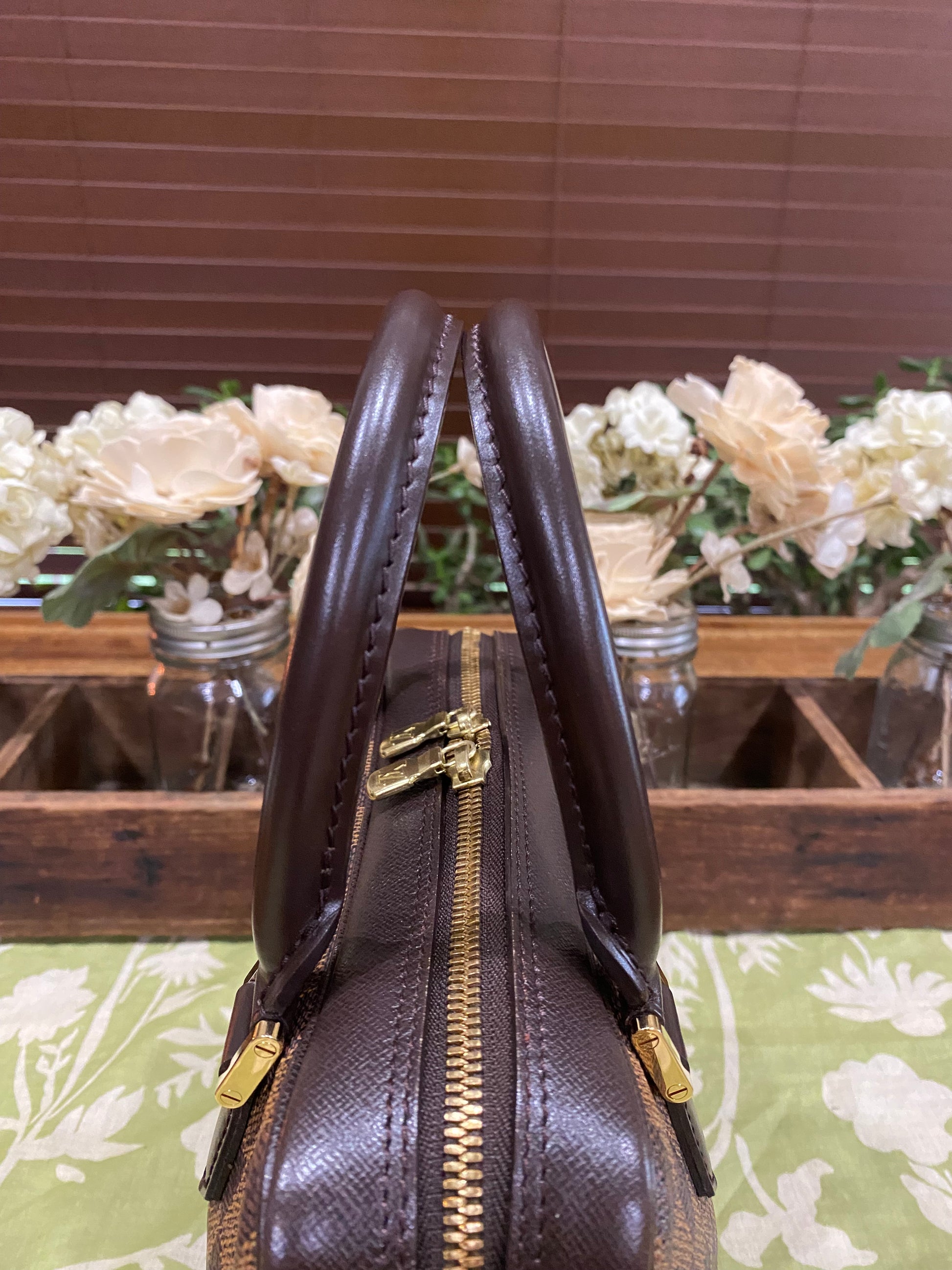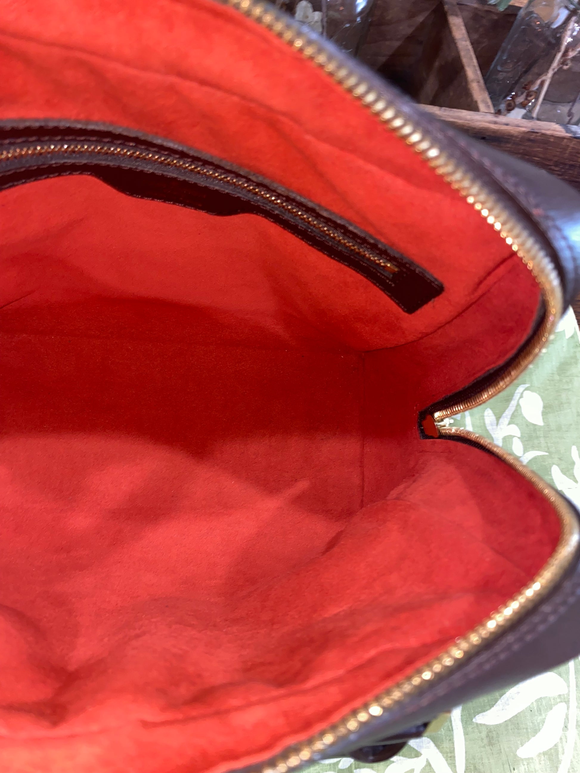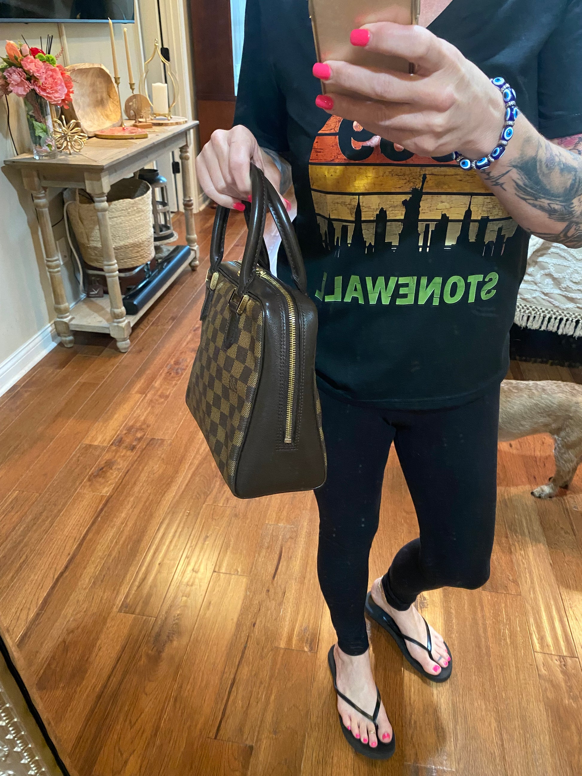 Beautiful condition❤️ Canvas is free of cracking or tears, print is vibrant, handles are clean and look amazing, leather piping has minimal rubs, interior shows signs of normal light use, has pen mark inside the zippered pocket, zippers run smooth, hardware is shiny, no foul smells.