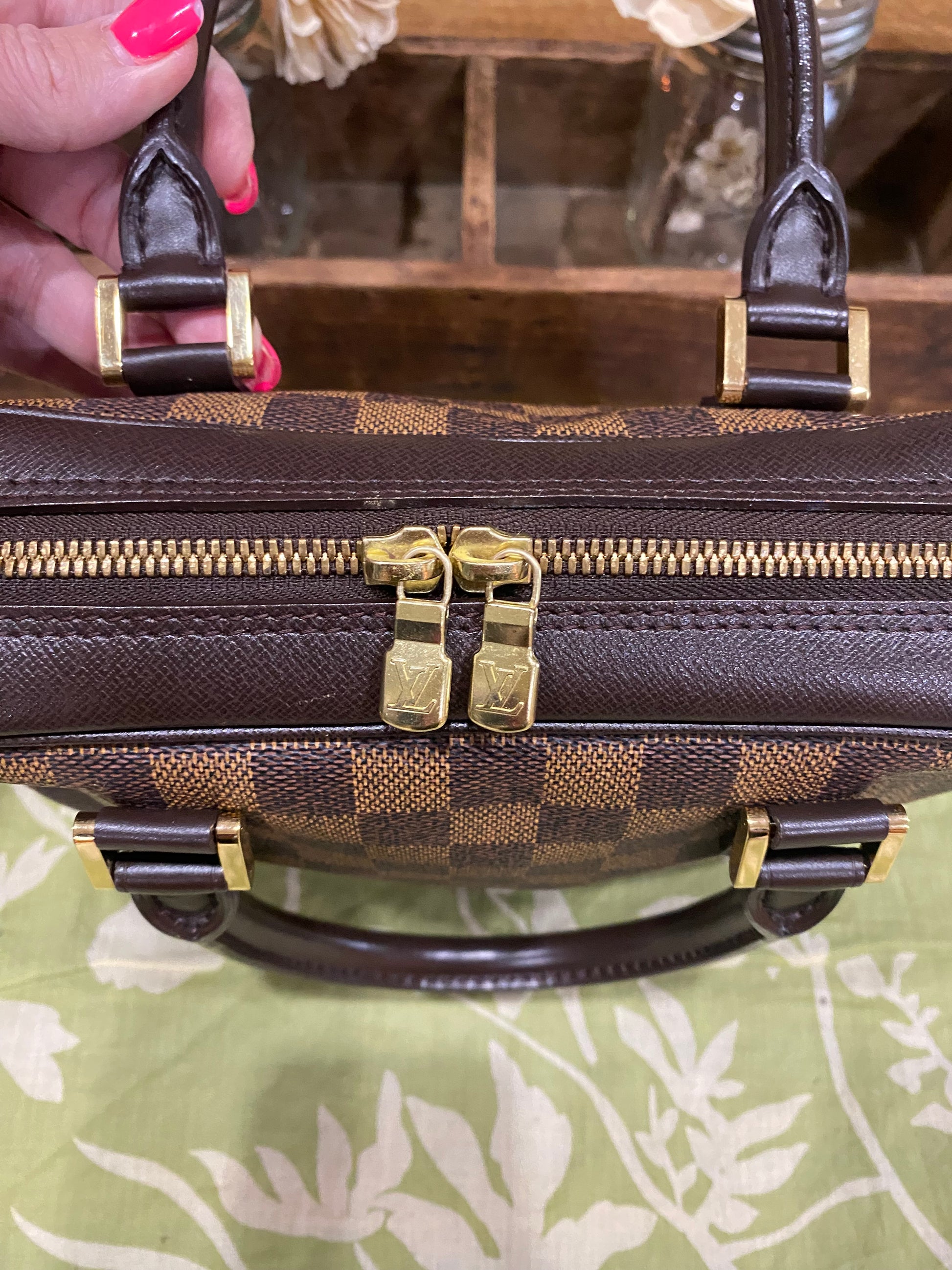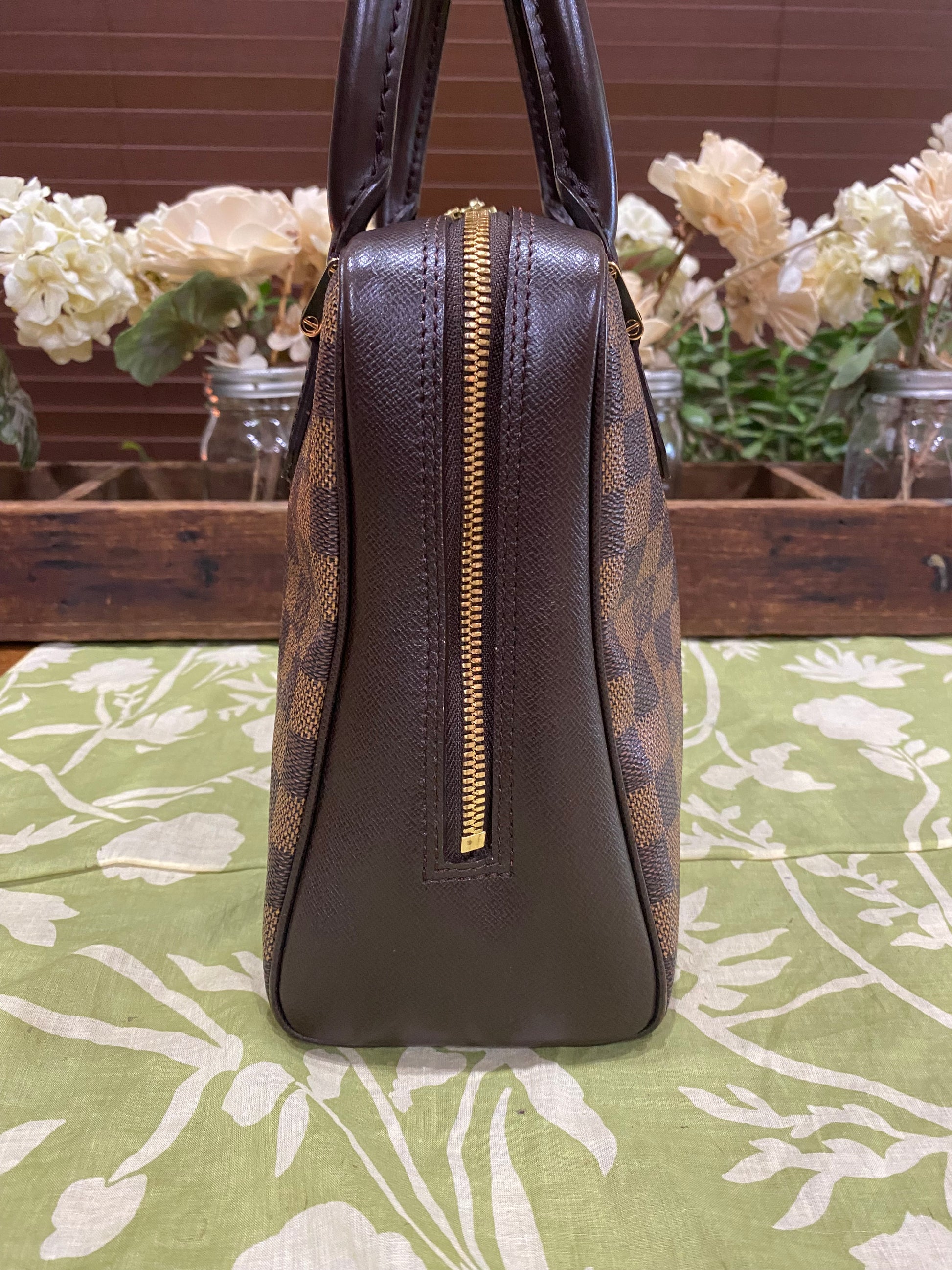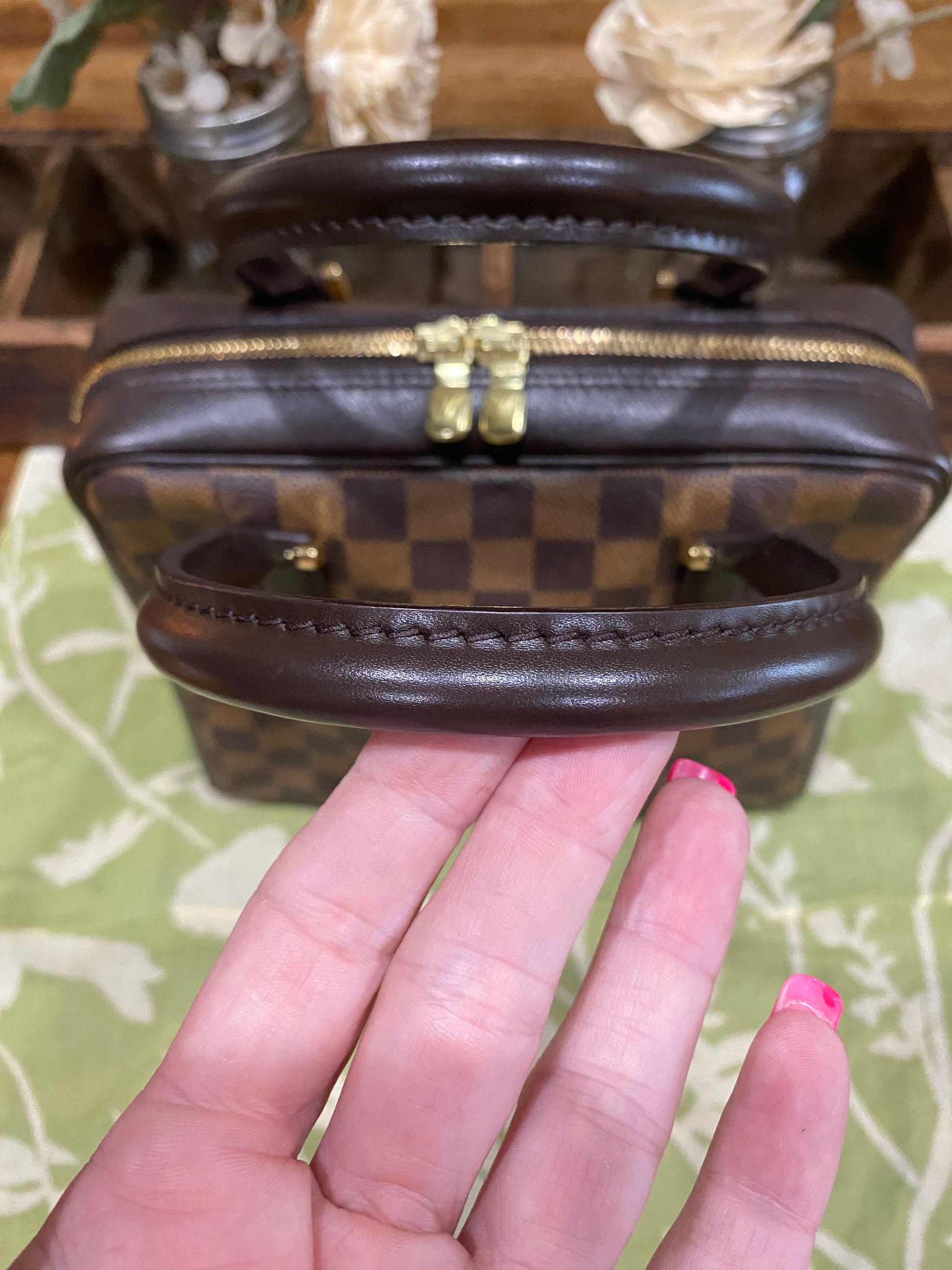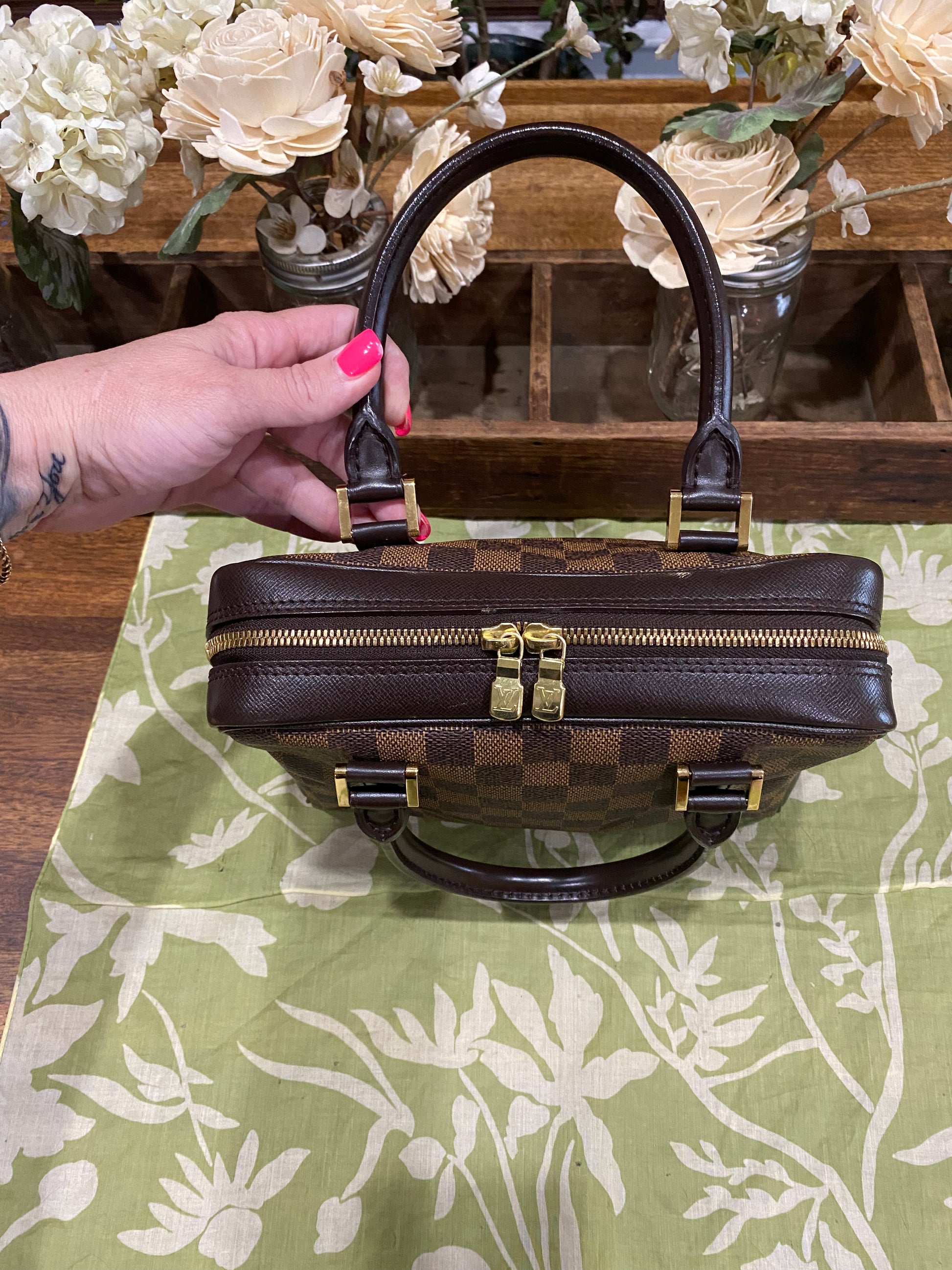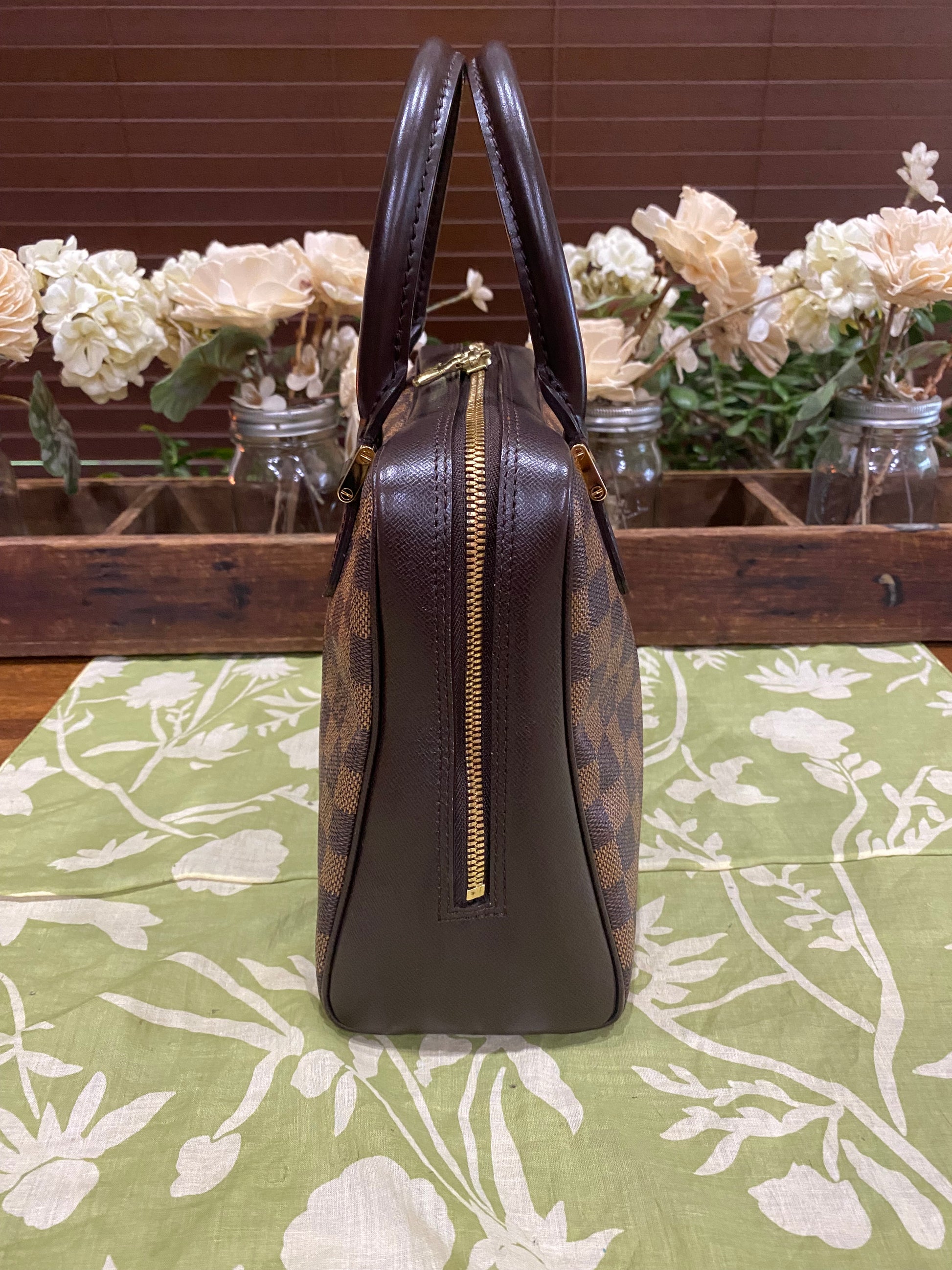 Beautiful condition❤️ Canvas is free of cracking or tears, print is vibrant, handles are clean and look amazing, leather piping has minimal rubs, interior shows signs of normal light use, has pen mark inside the zippered pocket, zippers run smooth, hardware is shiny, no foul smells.
