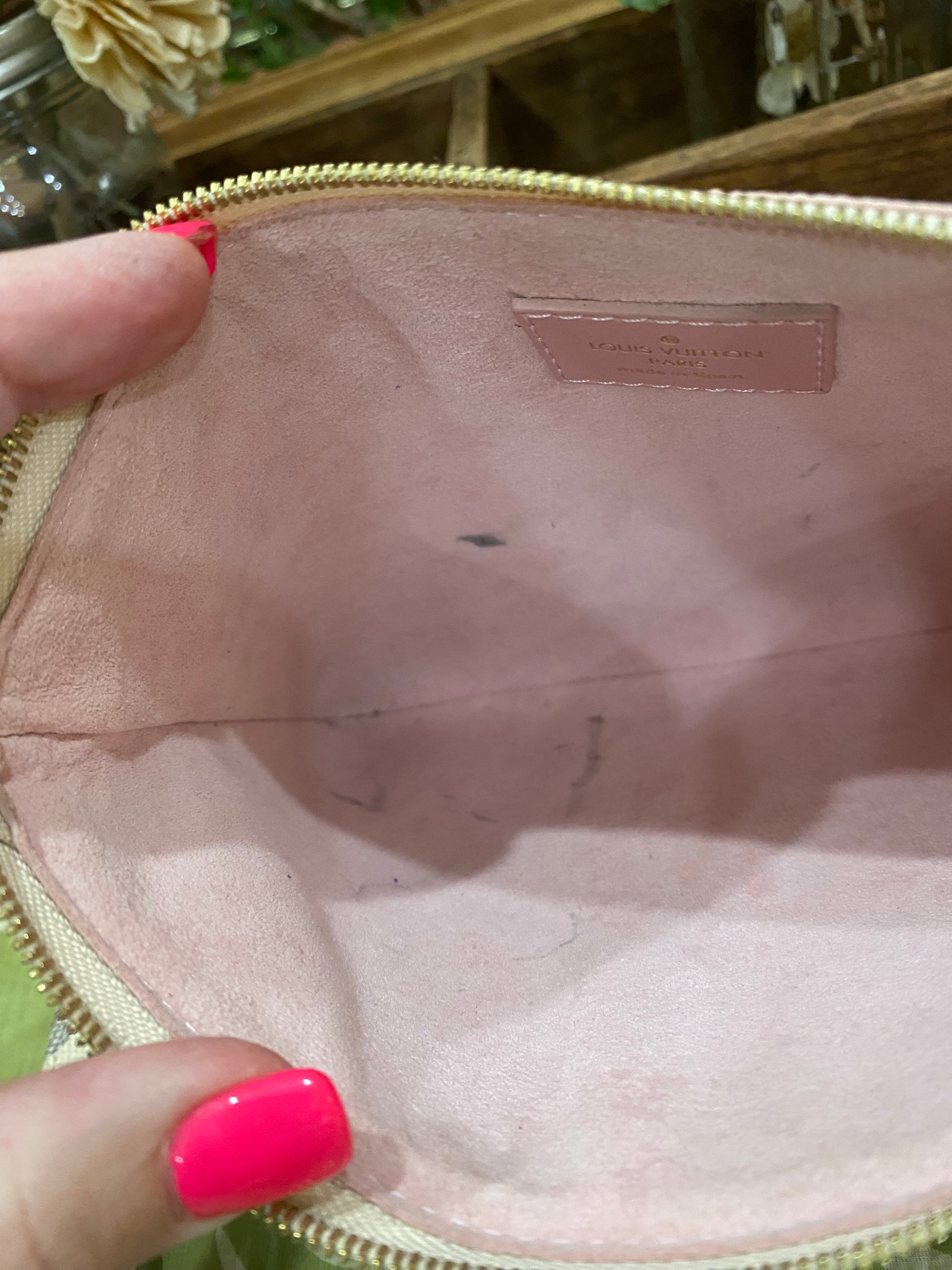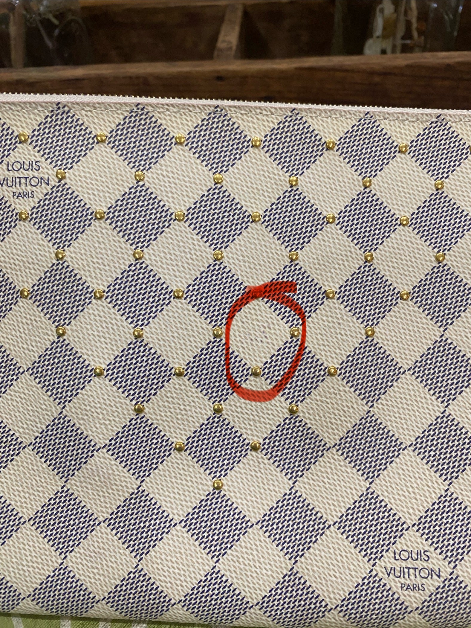 Canvas is free of cracking or tears, canvas has some light marks-see photos, hardware has light metal discoloration, zipper run smooth, zipper cloth has a stain, interior has untreated black marks/dust/debree, no foul smells.
