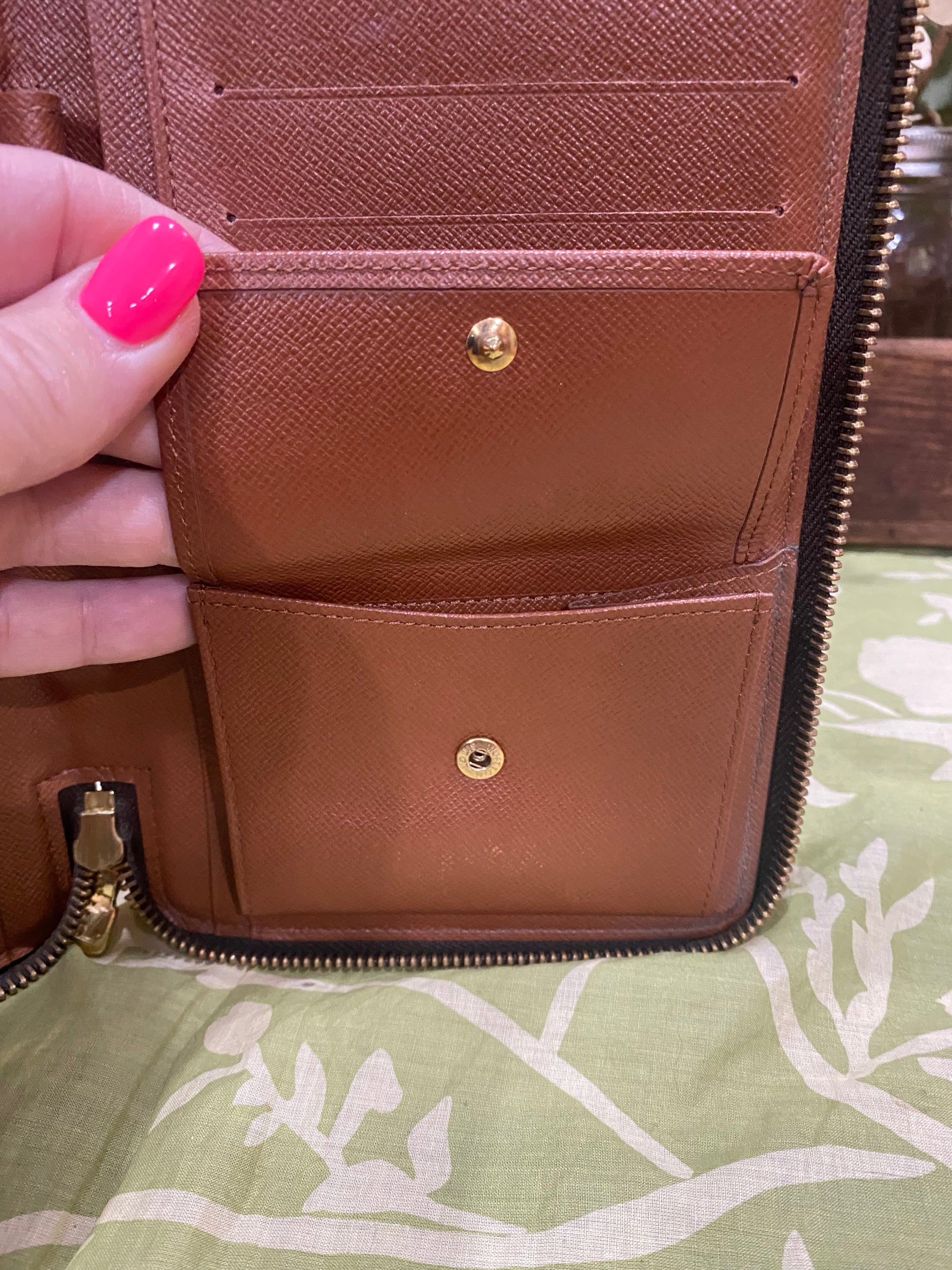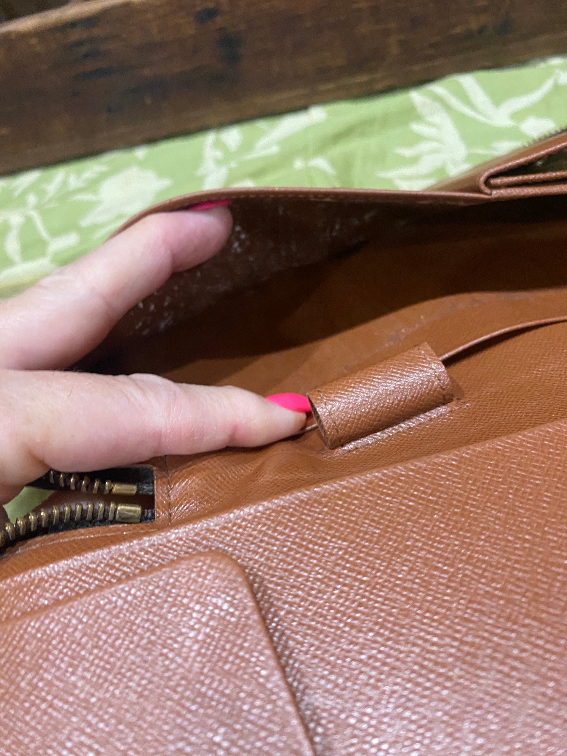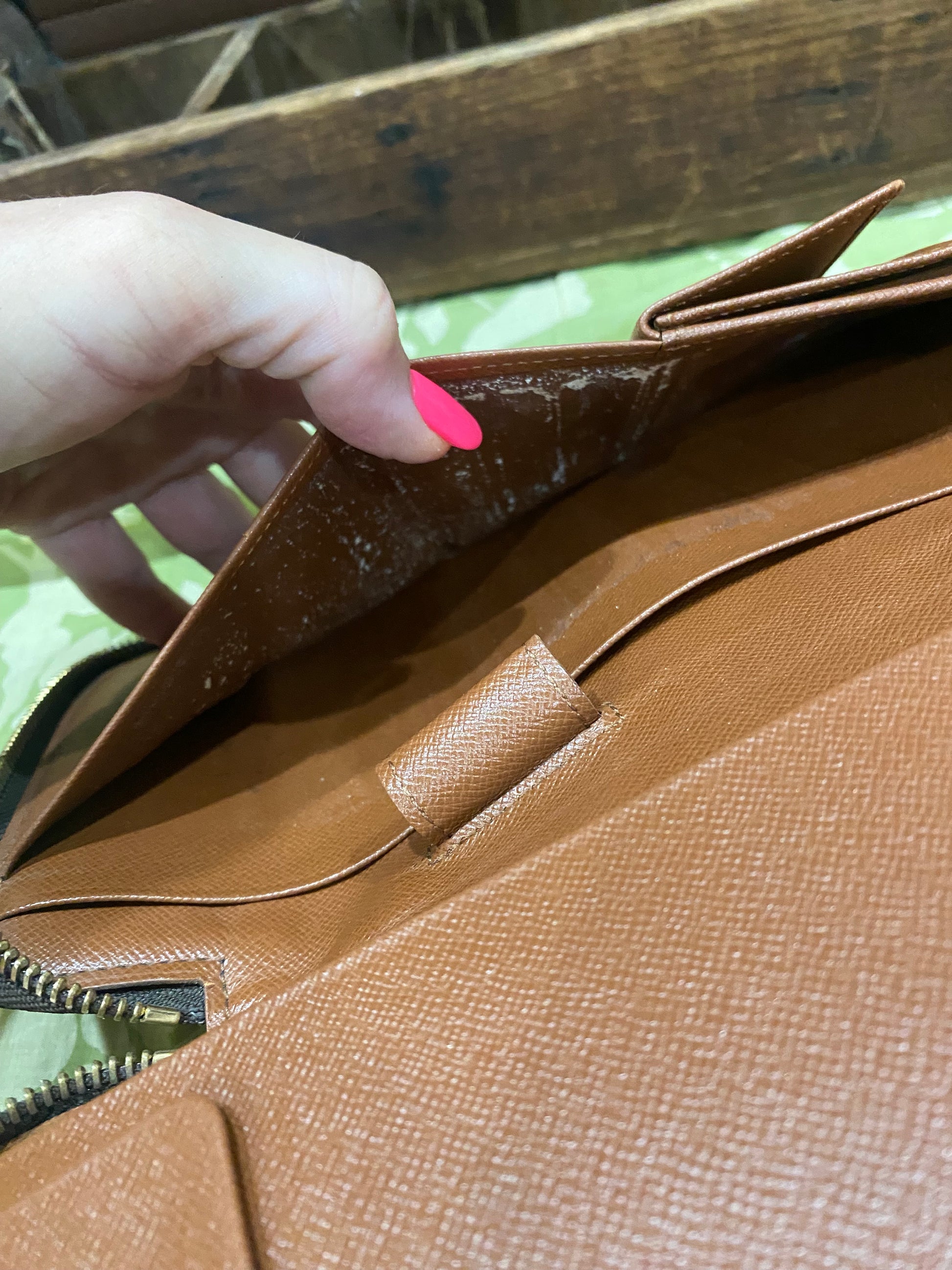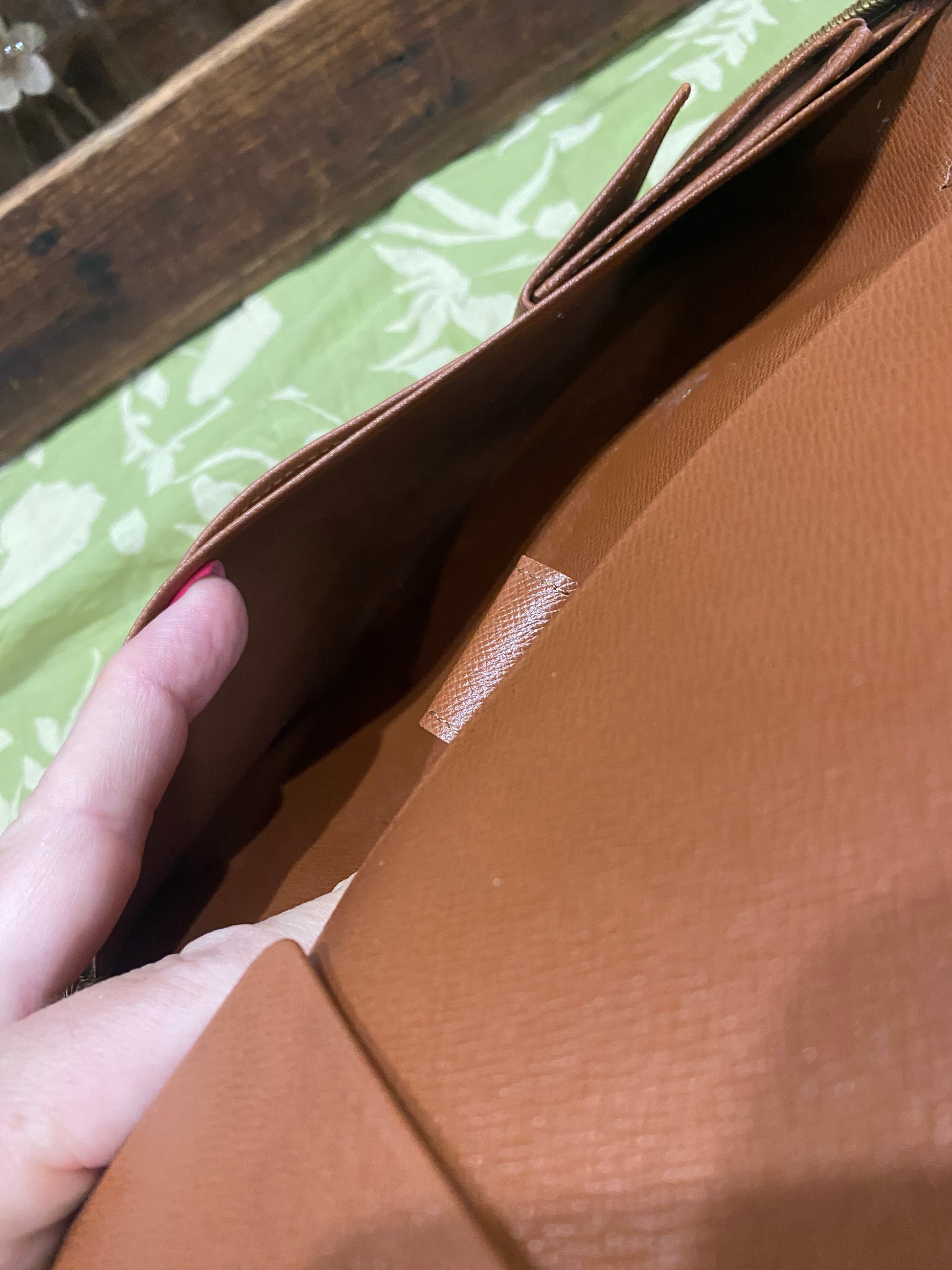 Canvas is free of cracking or tears, print is vibrant, zipper runs smooth, zipper has tarnish/metal discoloration, leather handle has dirt/marks, interior is clean, coin compartment snap is secure, credit card slots are good, the backside of one pocket has dry peeling/no tackiness, no foul smells.