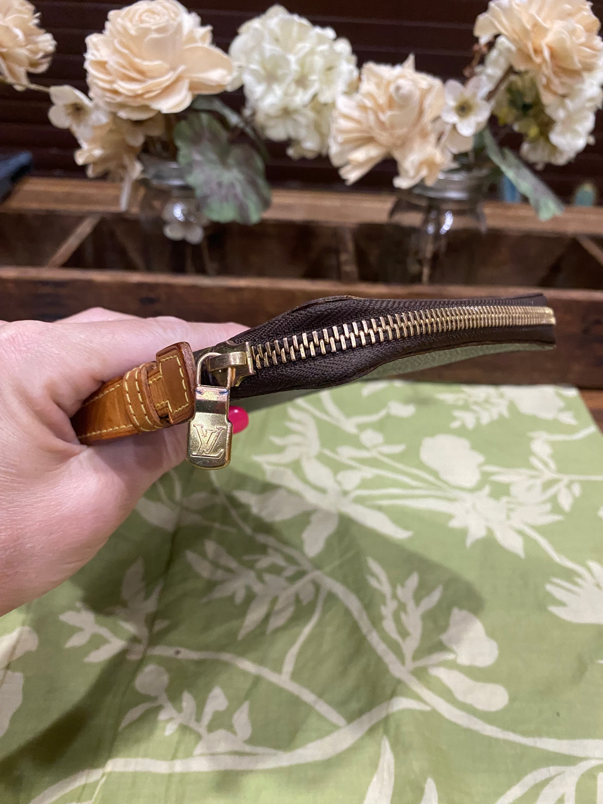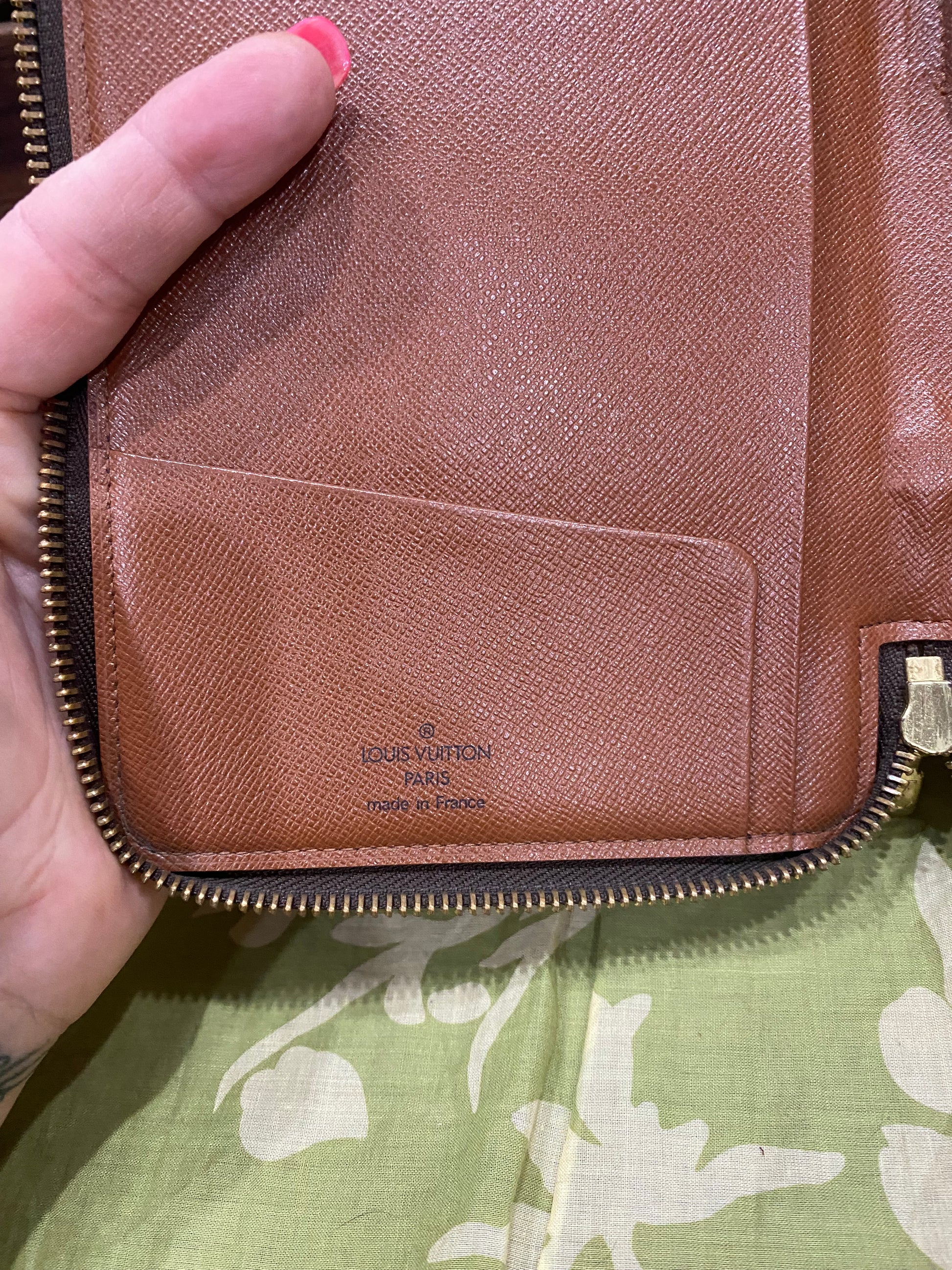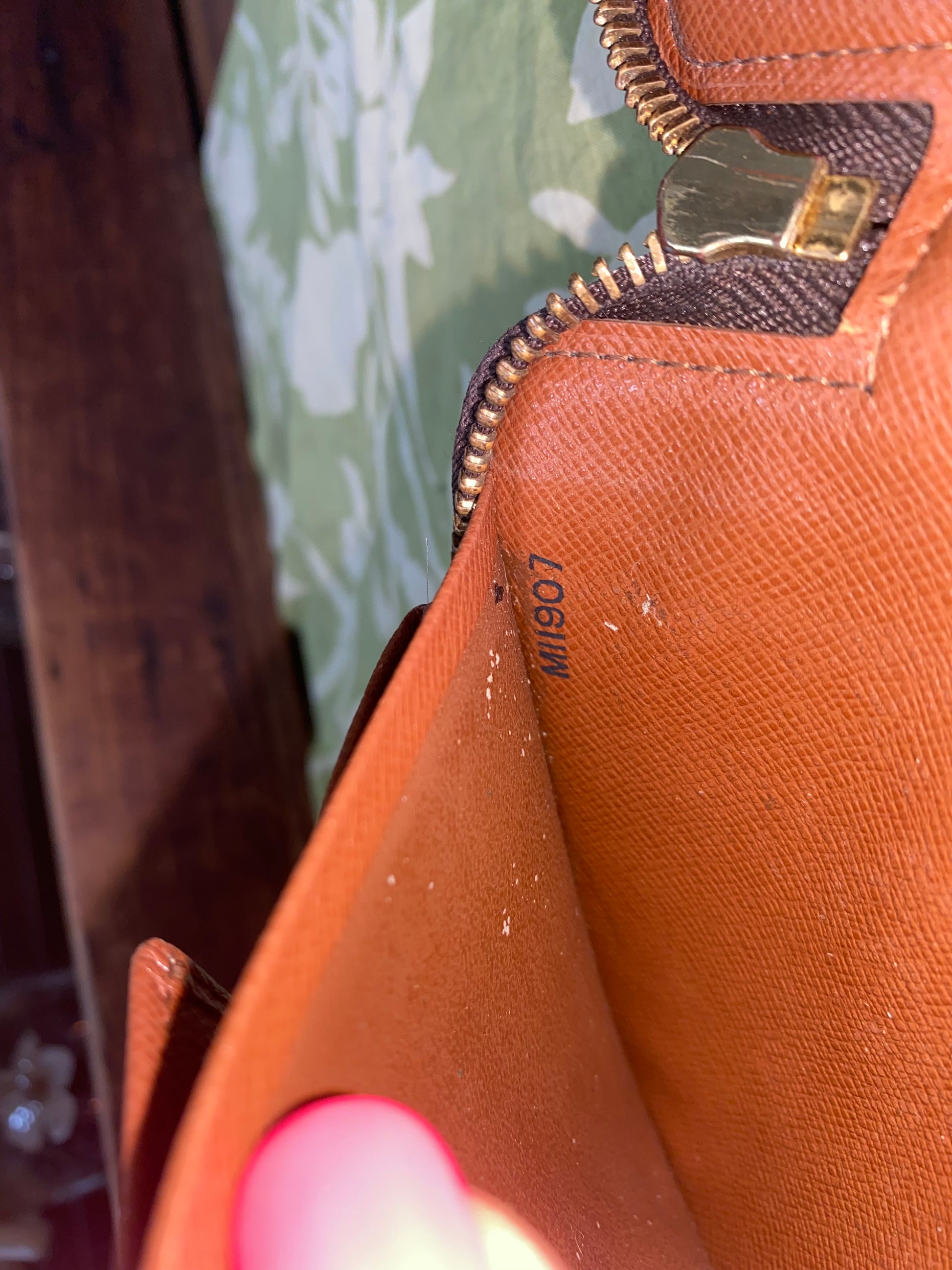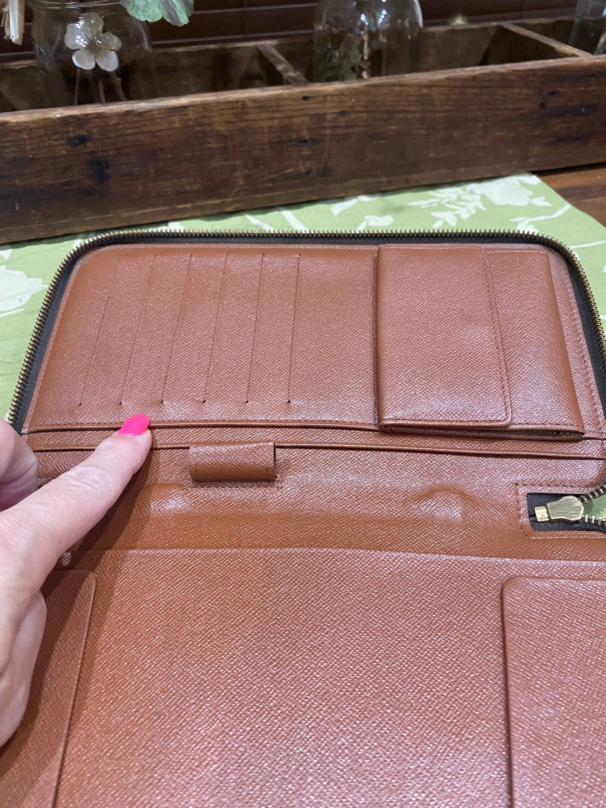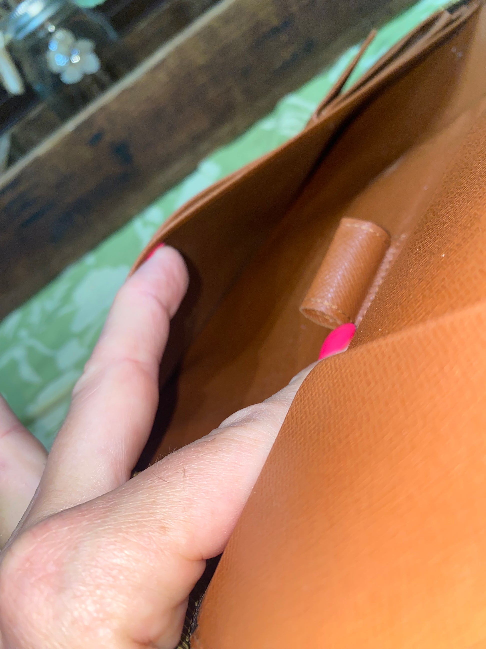 Canvas is free of cracking or tears, print is vibrant, zipper runs smooth, zipper has tarnish/metal discoloration, leather handle has dirt/marks, interior is clean, coin compartment snap is secure, credit card slots are good, the backside of one pocket has dry peeling/no tackiness, no foul smells.