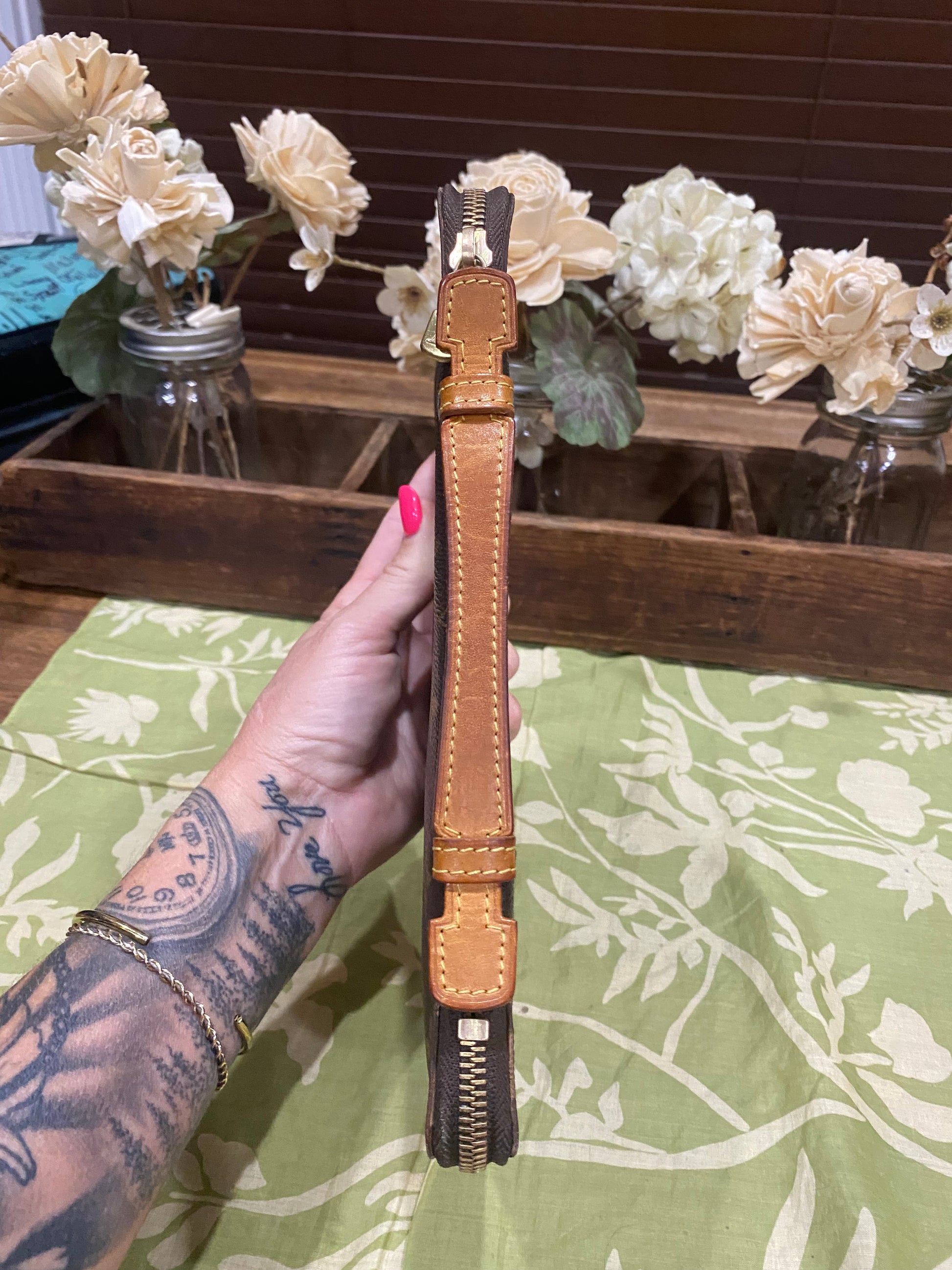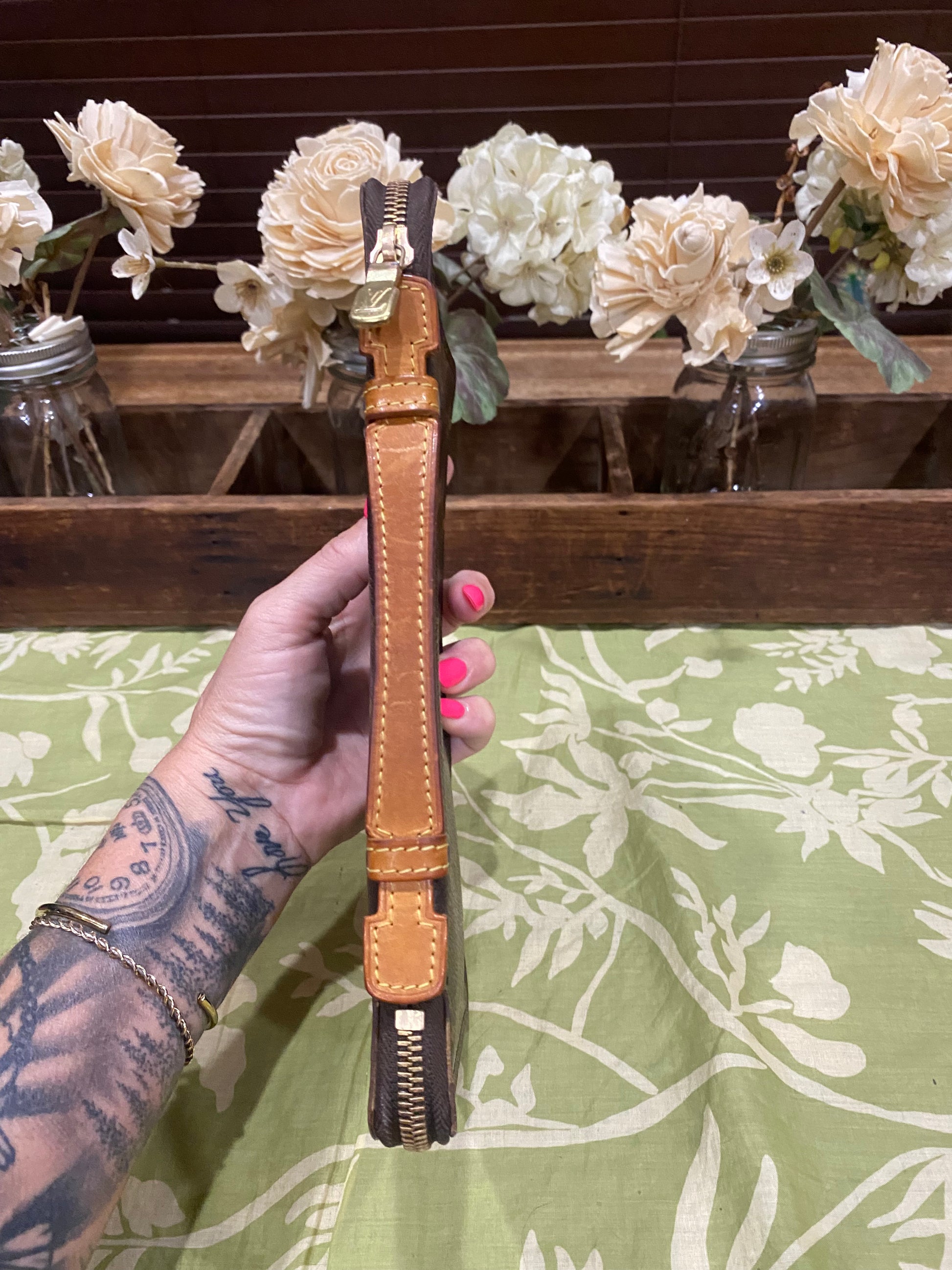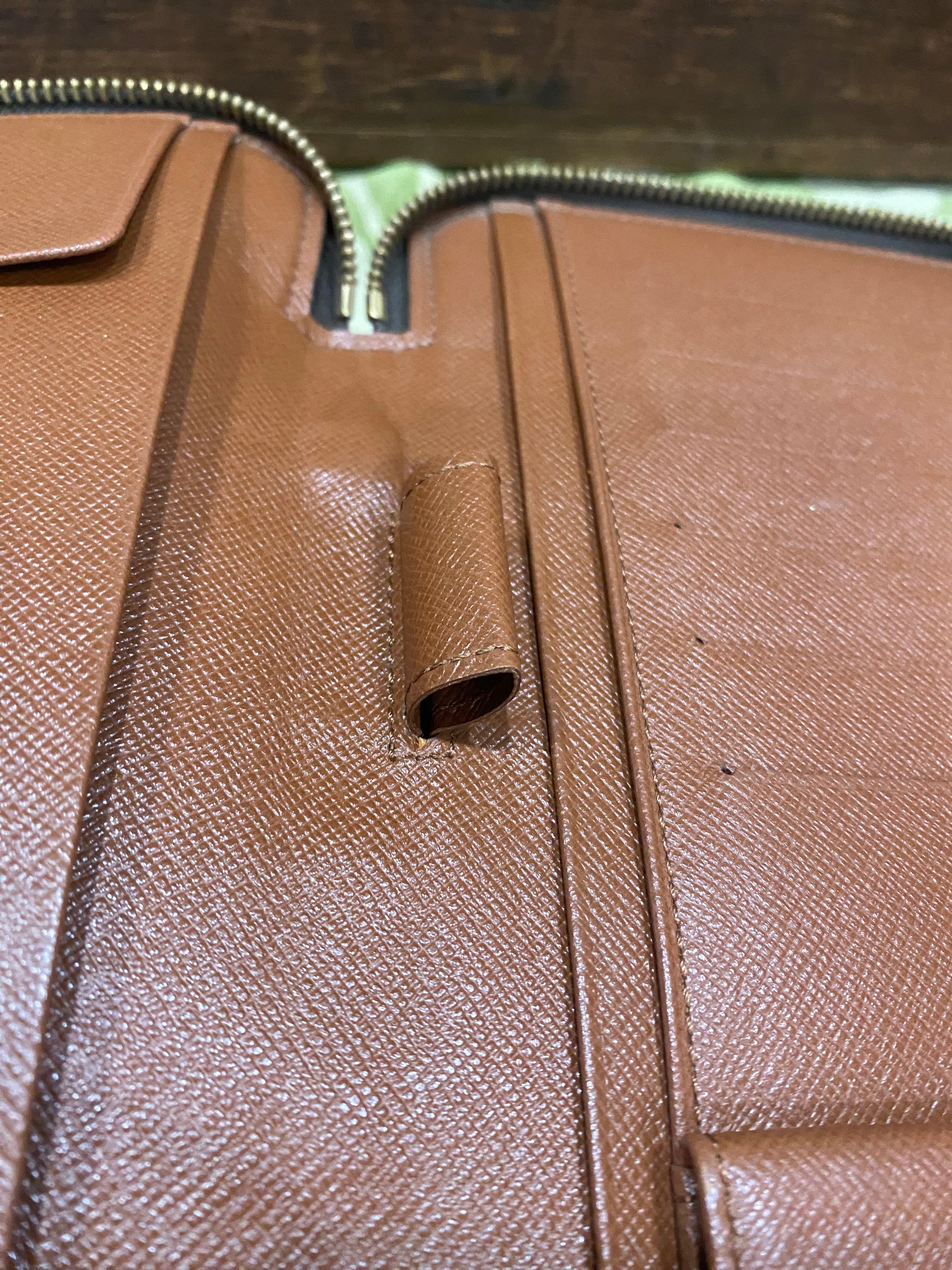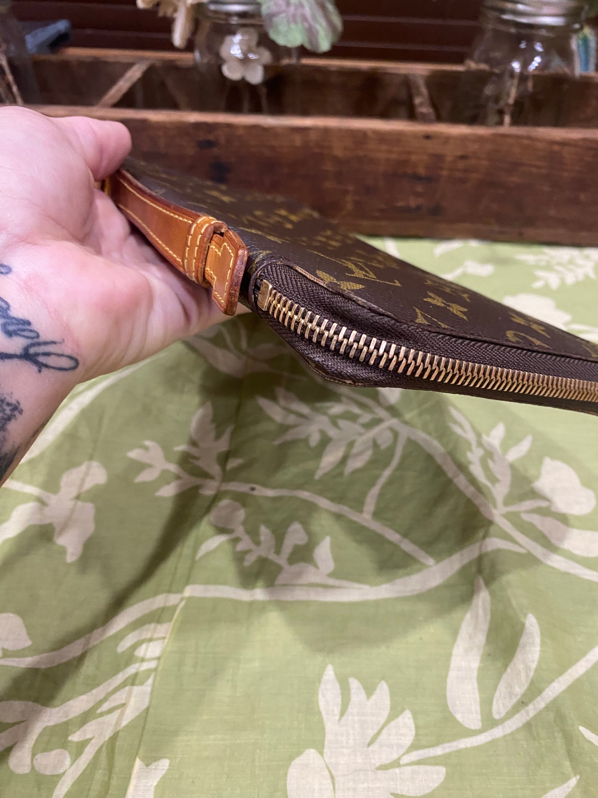 Canvas is free of cracking or tears, print is vibrant, zipper runs smooth, zipper has tarnish/metal discoloration, leather handle has dirt/marks, interior is clean, coin compartment snap is secure, credit card slots are good, the backside of one pocket has dry peeling/no tackiness, no foul smells.