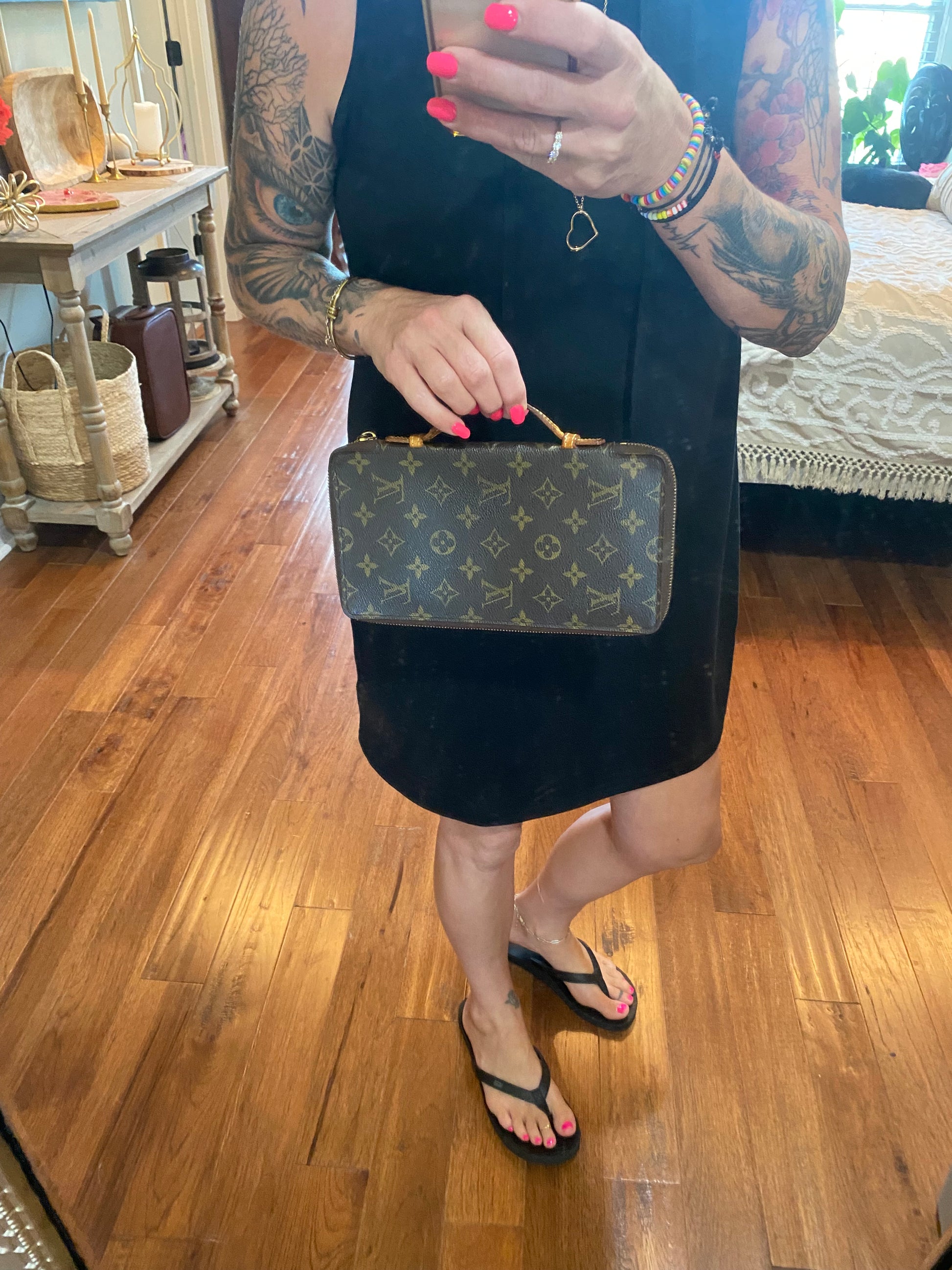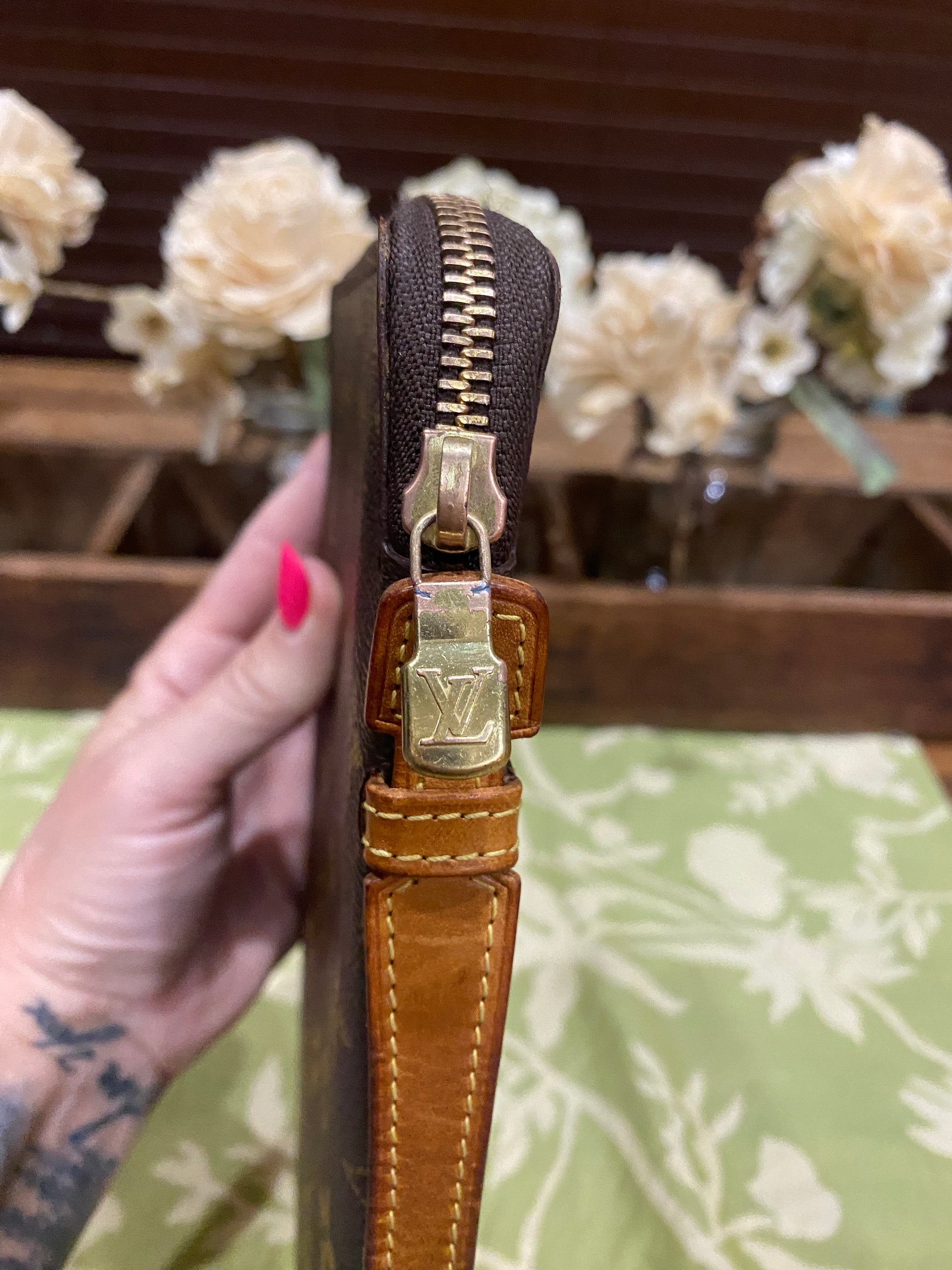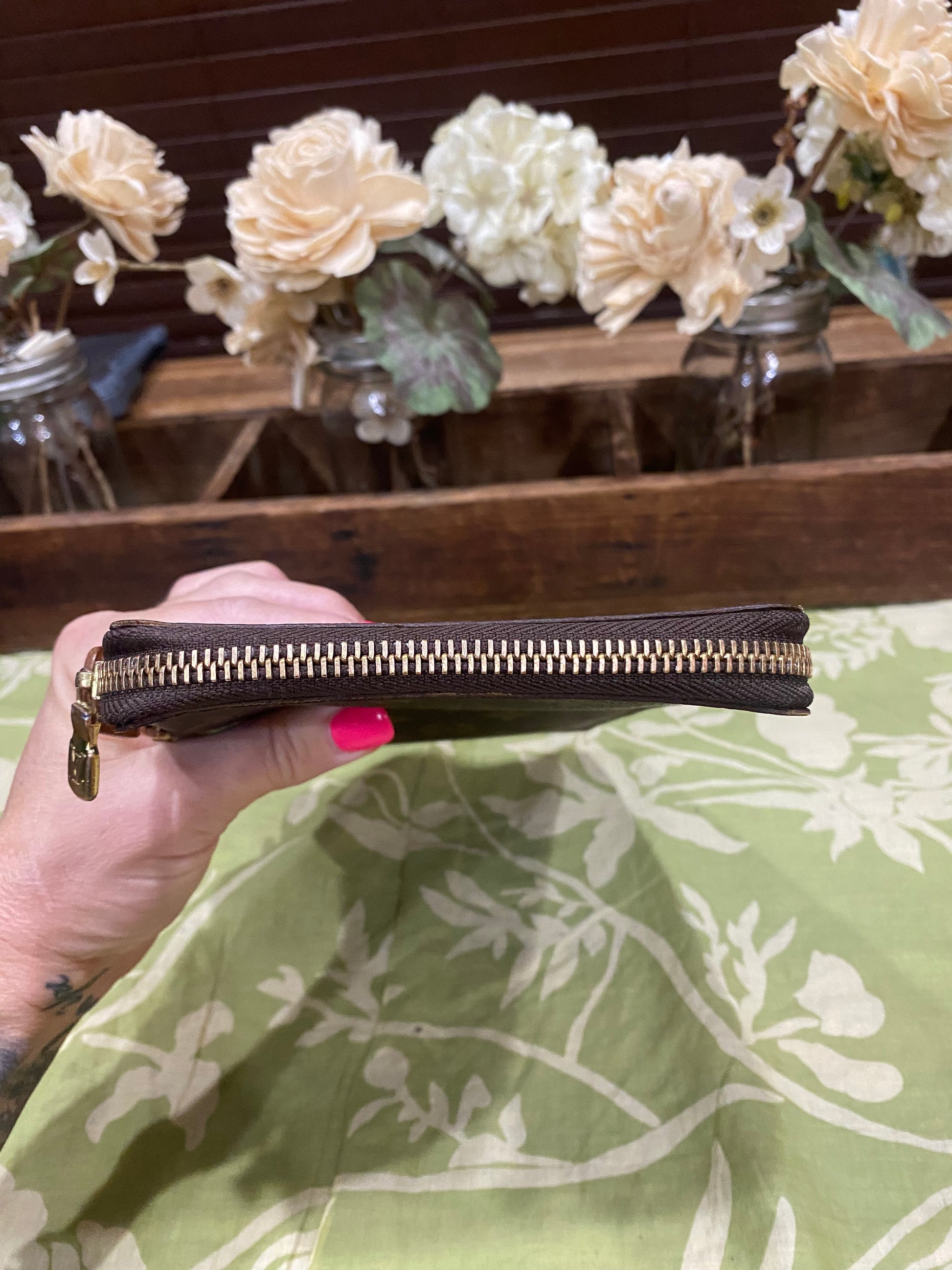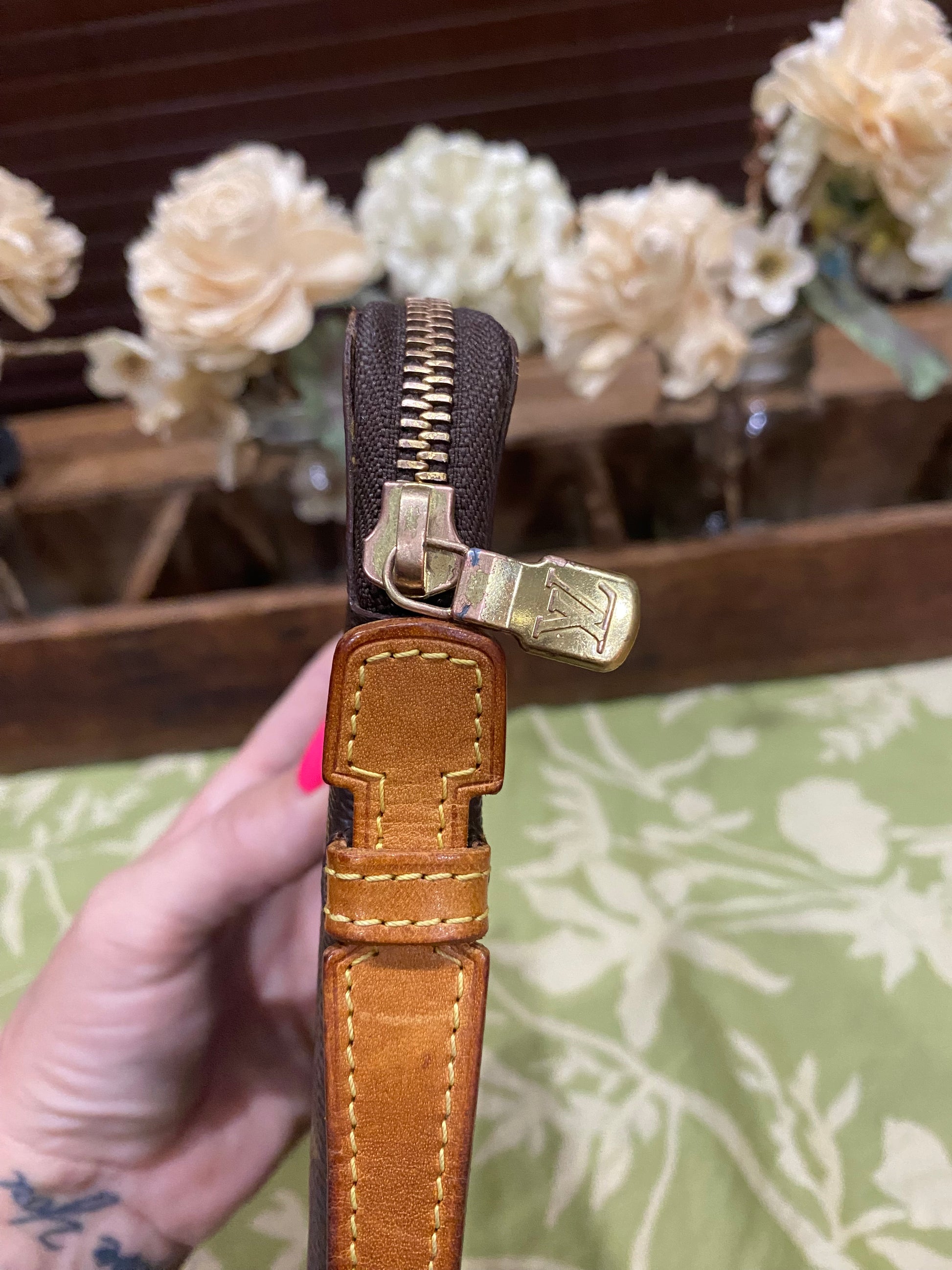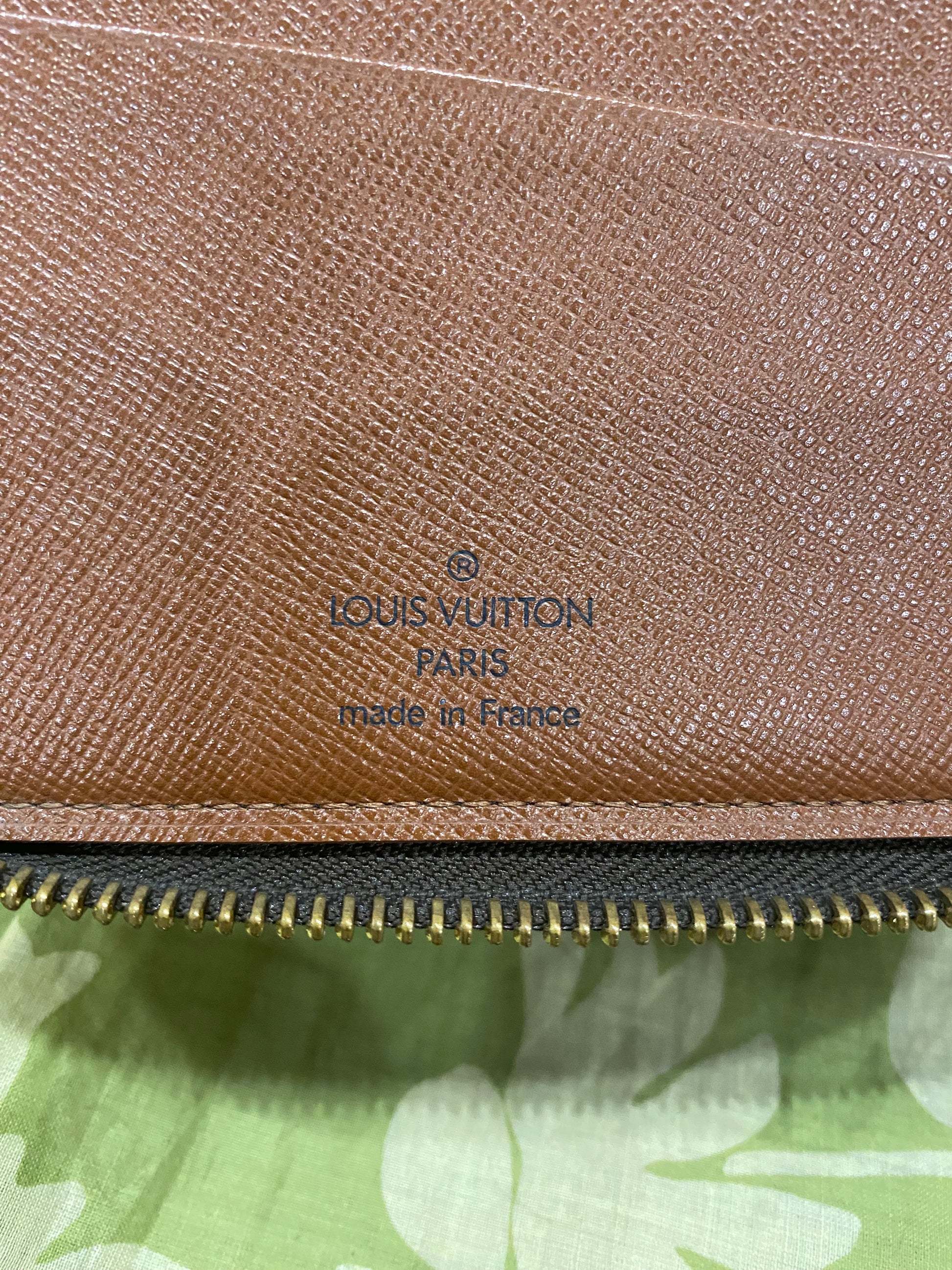 Canvas is free of cracking or tears, print is vibrant, zipper runs smooth, zipper has tarnish/metal discoloration, leather handle has dirt/marks, interior is clean, coin compartment snap is secure, credit card slots are good, the backside of one pocket has dry peeling/no tackiness, no foul smells.