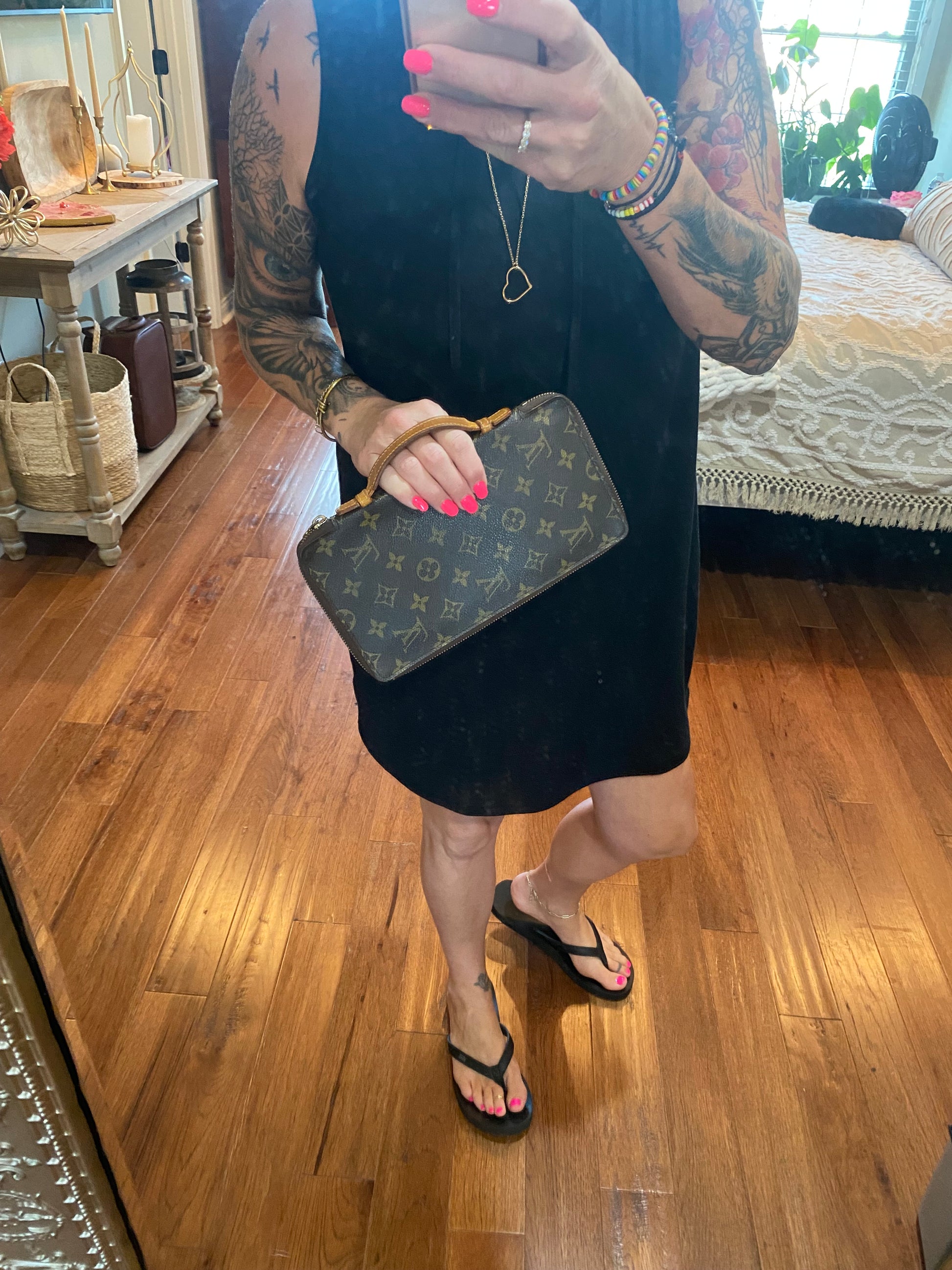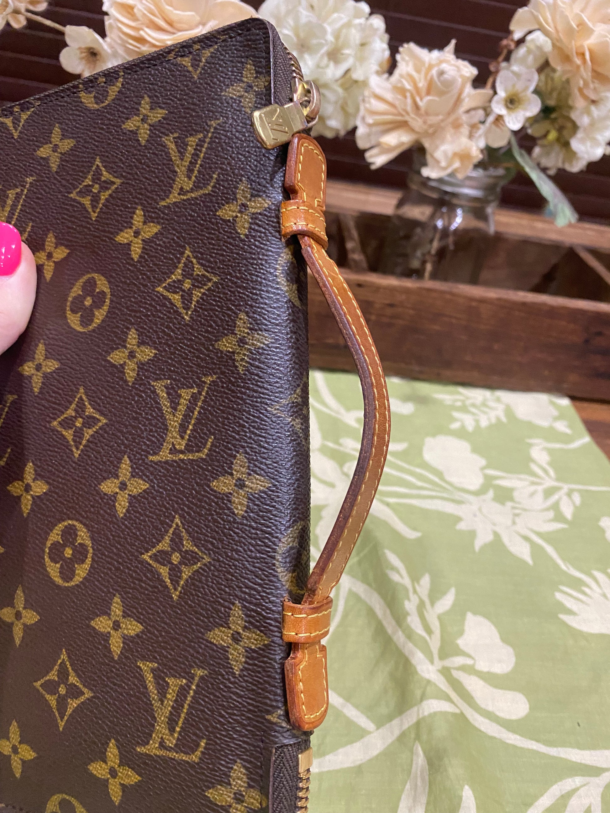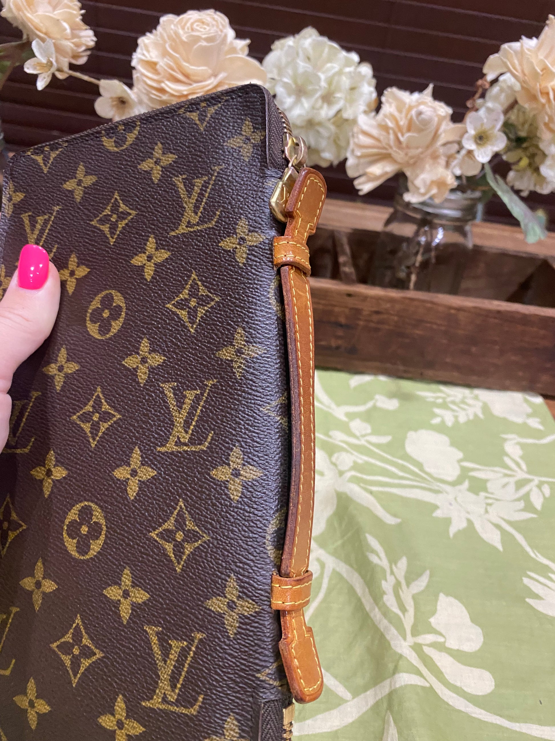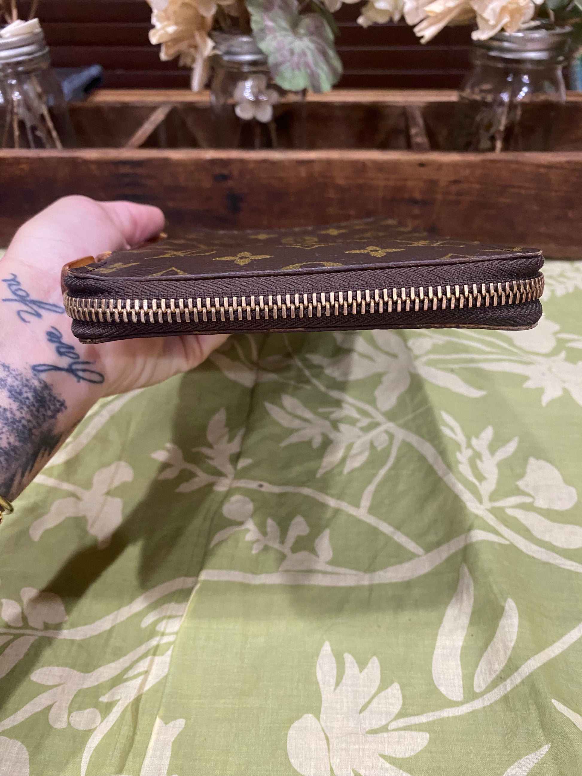 Canvas is free of cracking or tears, print is vibrant, zipper runs smooth, zipper has tarnish/metal discoloration, leather handle has dirt/marks, interior is clean, coin compartment snap is secure, credit card slots are good, the backside of one pocket has dry peeling/no tackiness, no foul smells.