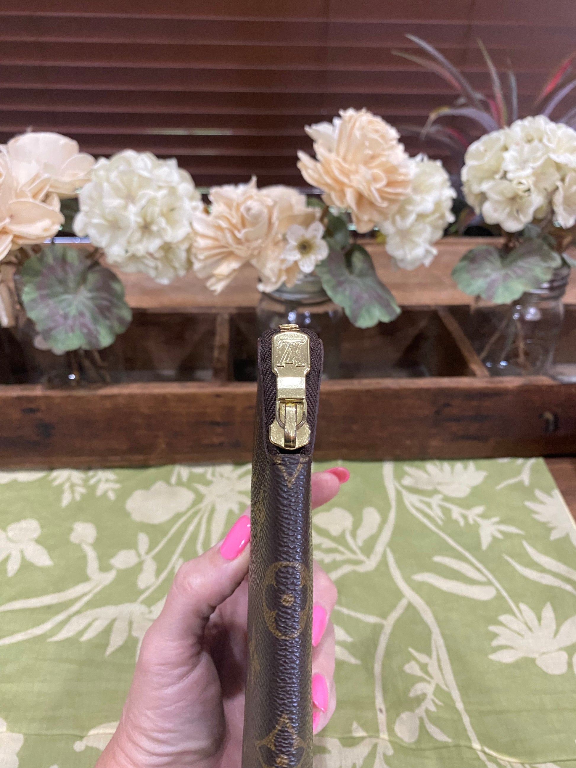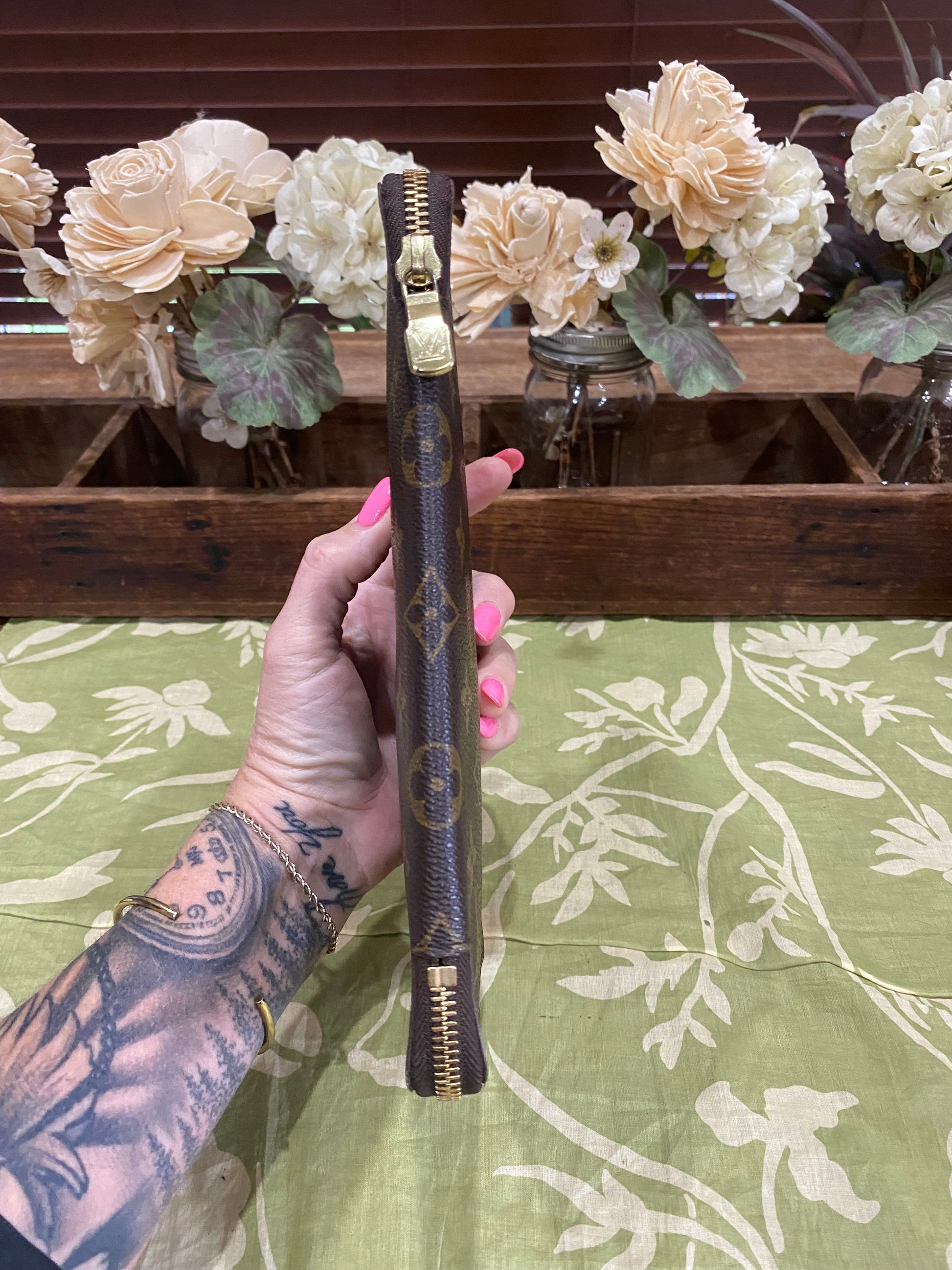 Daily Organizer Long Wallet- holds cell phone, cash, coins, credit cards, passports, boarding passes... pictured holding a iPhone 15 Pro