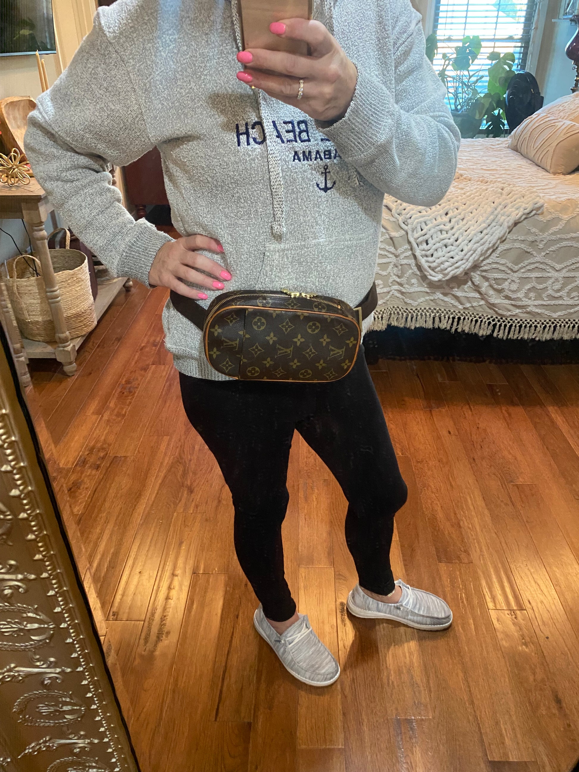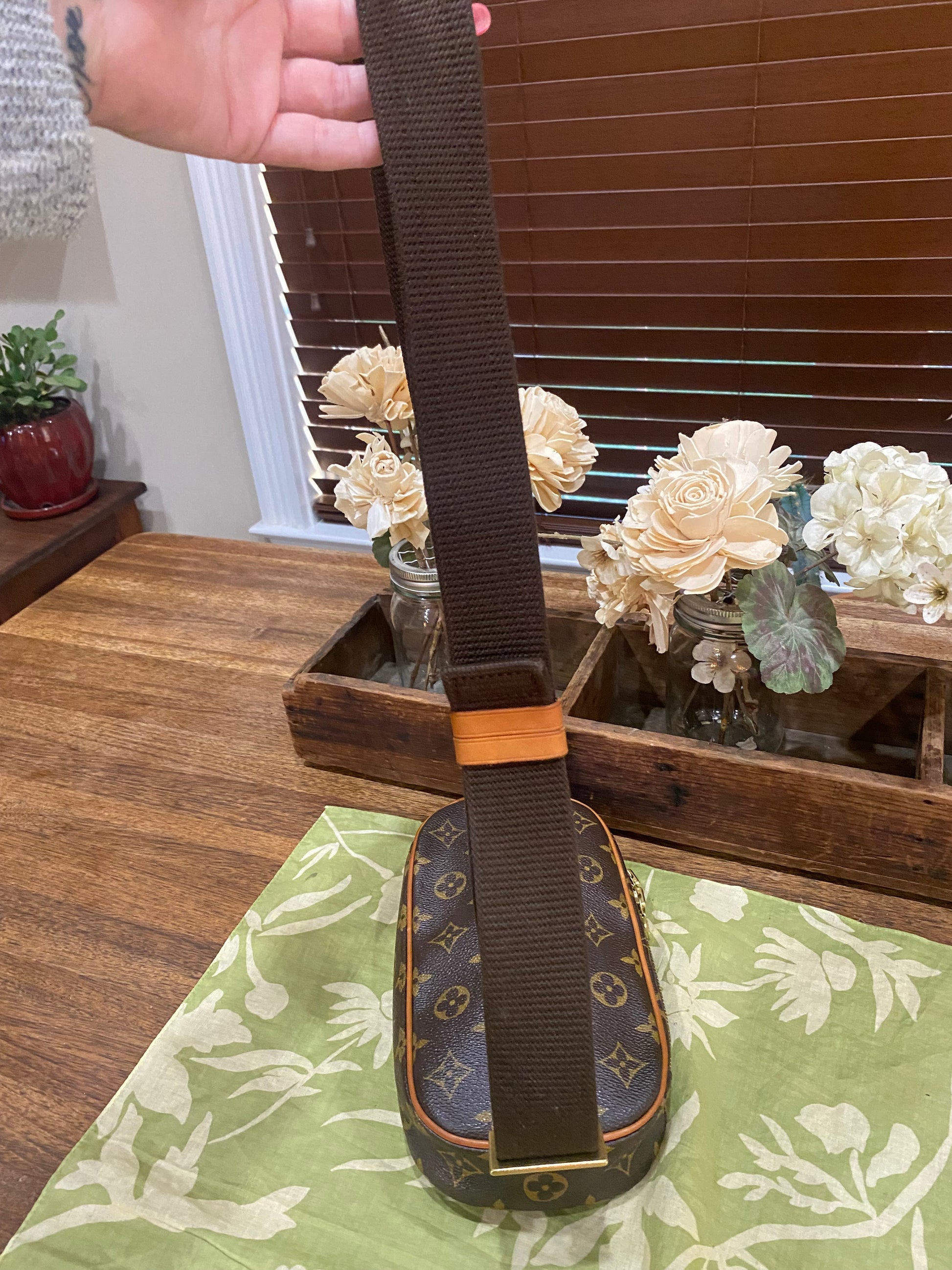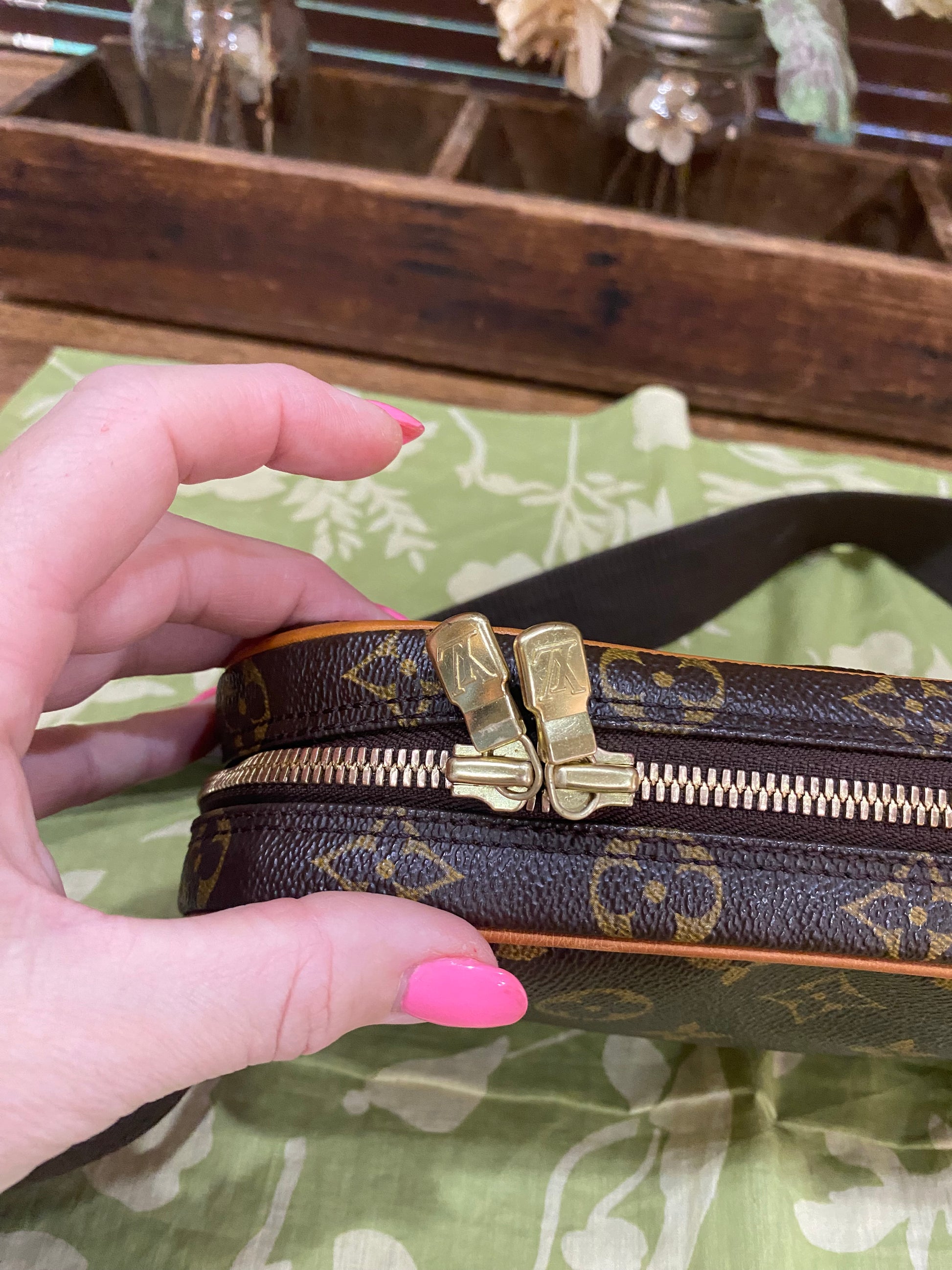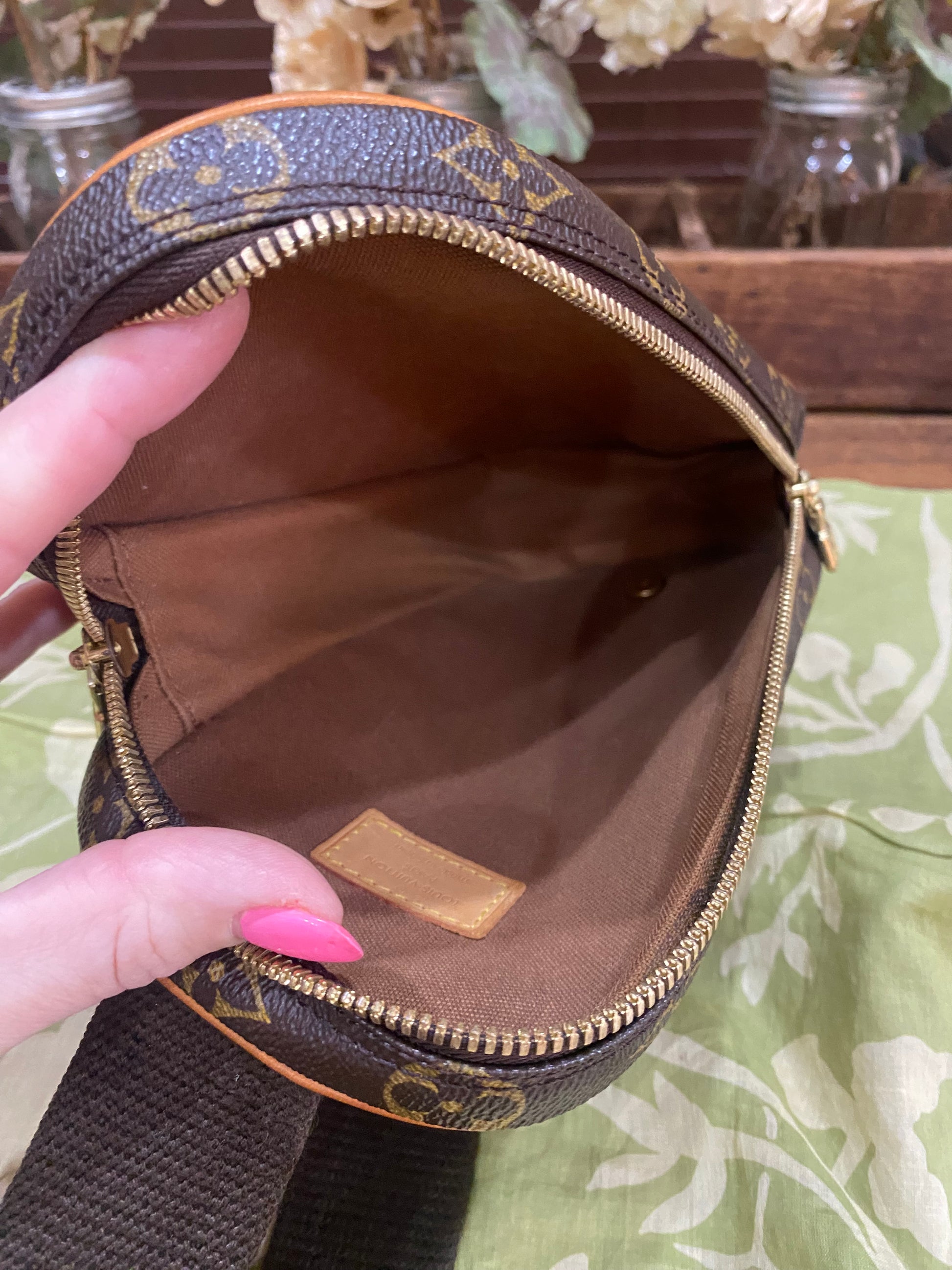 Canvas is free of cracking or tears, print is vibrant, zippers run smooth, zippers have light tarnish, interior is clean, belt is clean, leather piece where belt connects to pouch is new and done by LV boutique, no foul smells. Comes with dust bag.