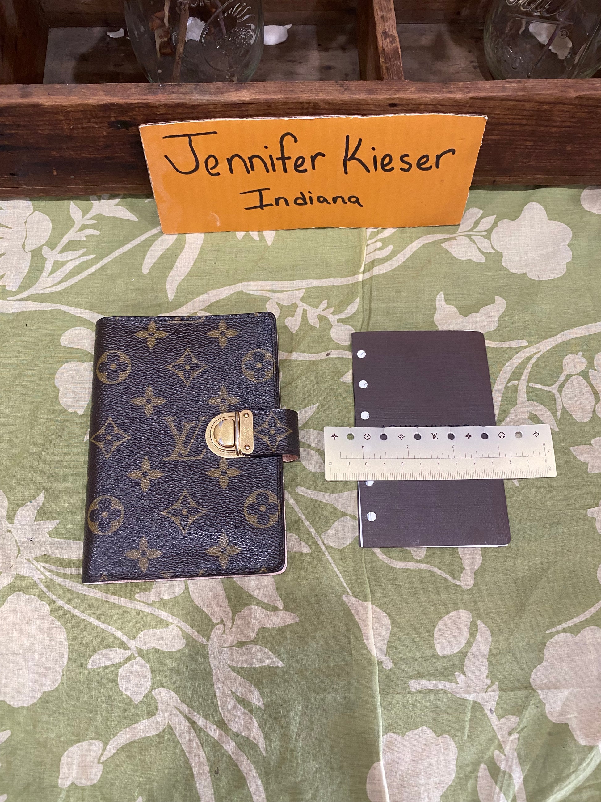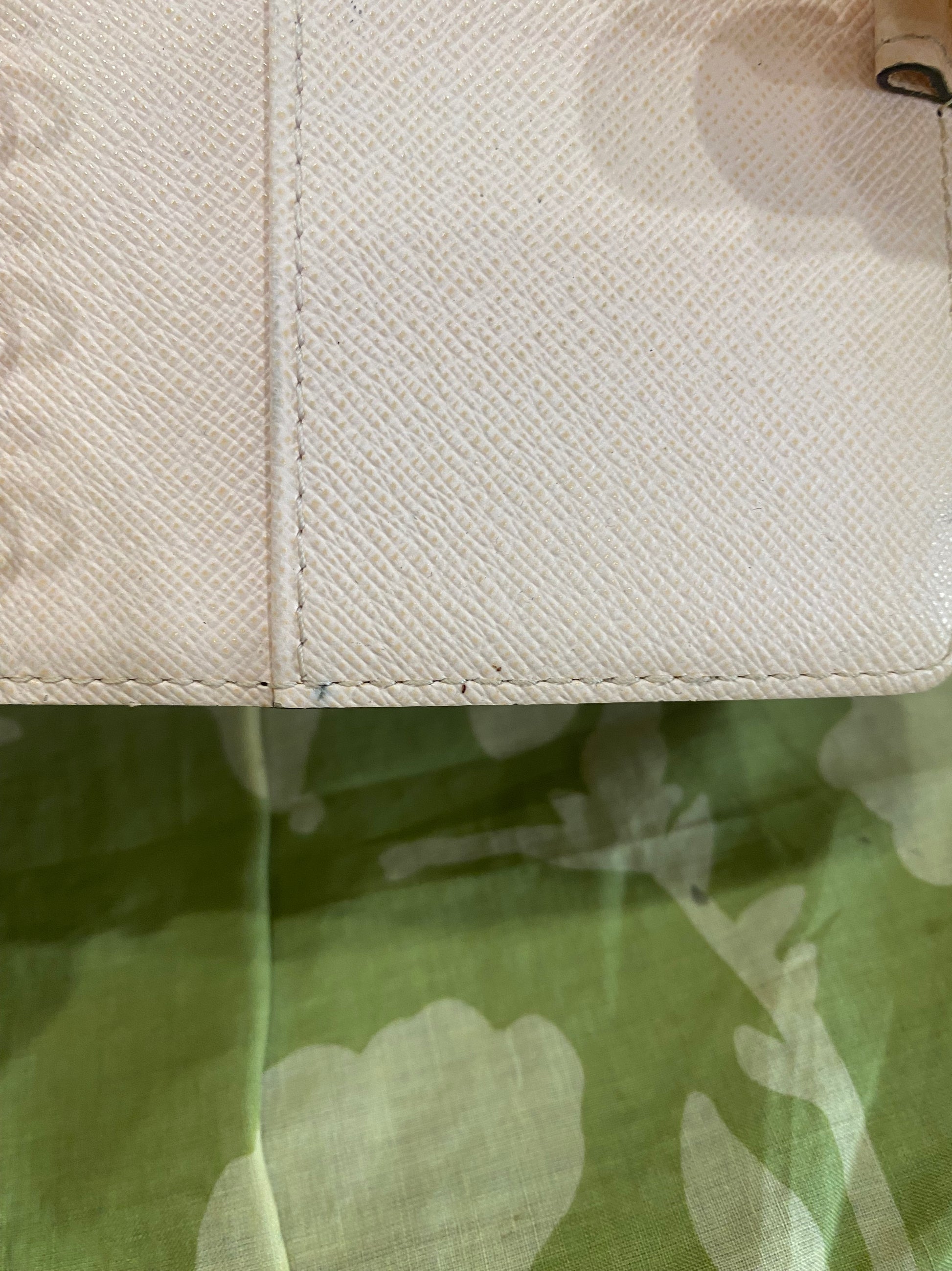 Canvas is free of cracking or tears, no fading of print, glazing is intact and looks great, closure has some metal discoloration, pockets are free of dry peeling or stickiness, interior has some marks, rings are tight, no foul smells. Comes with original ruler.
