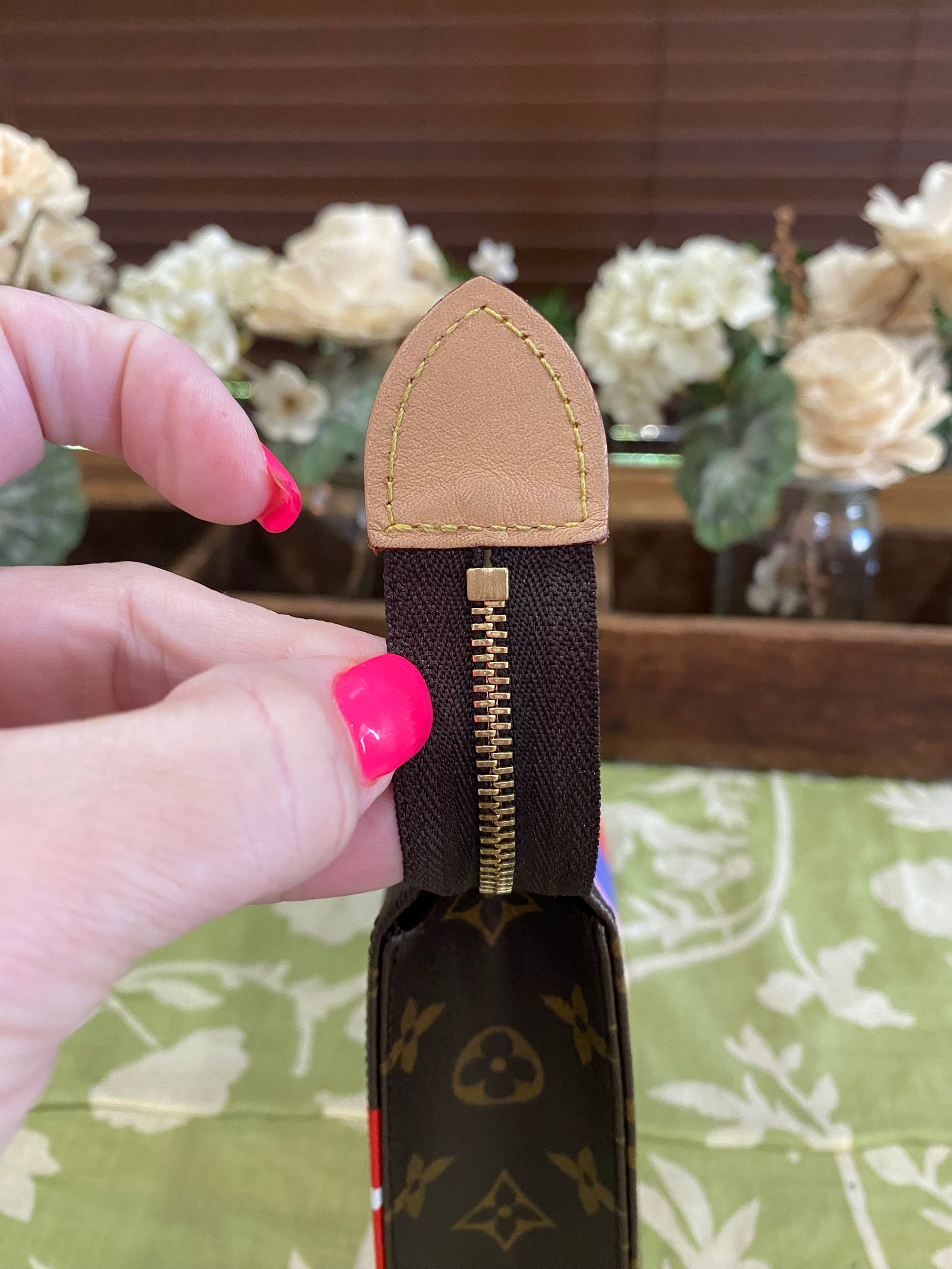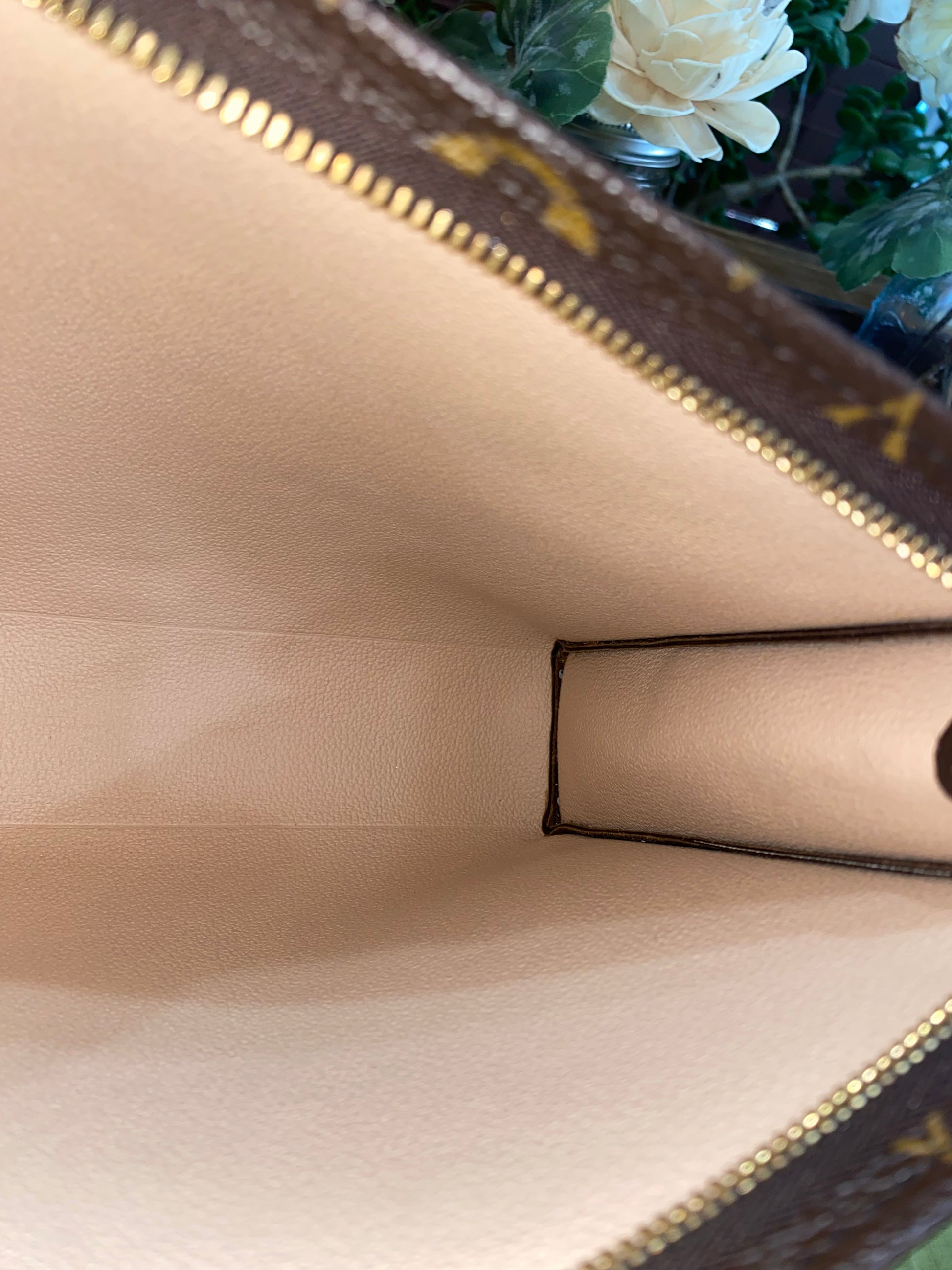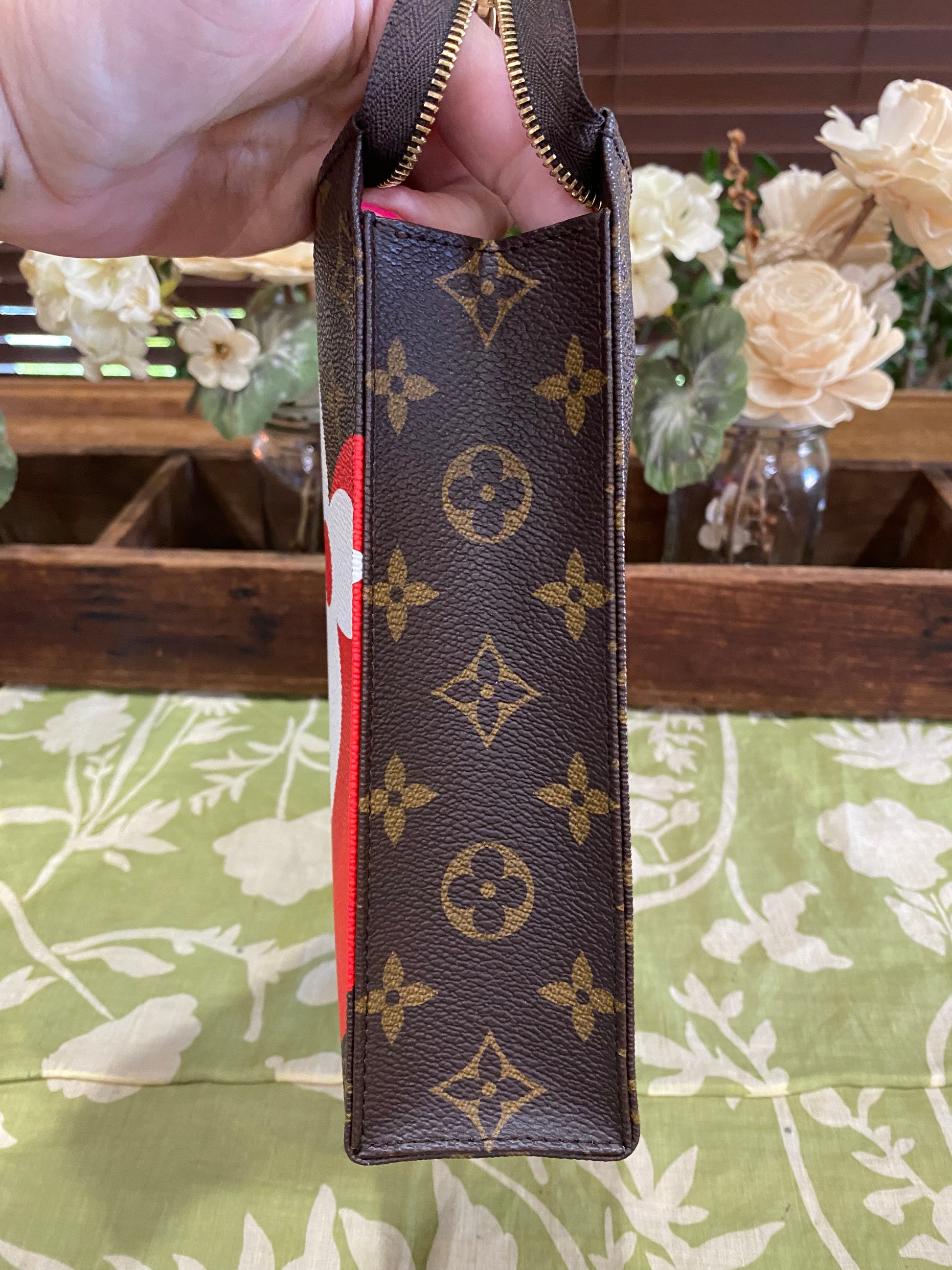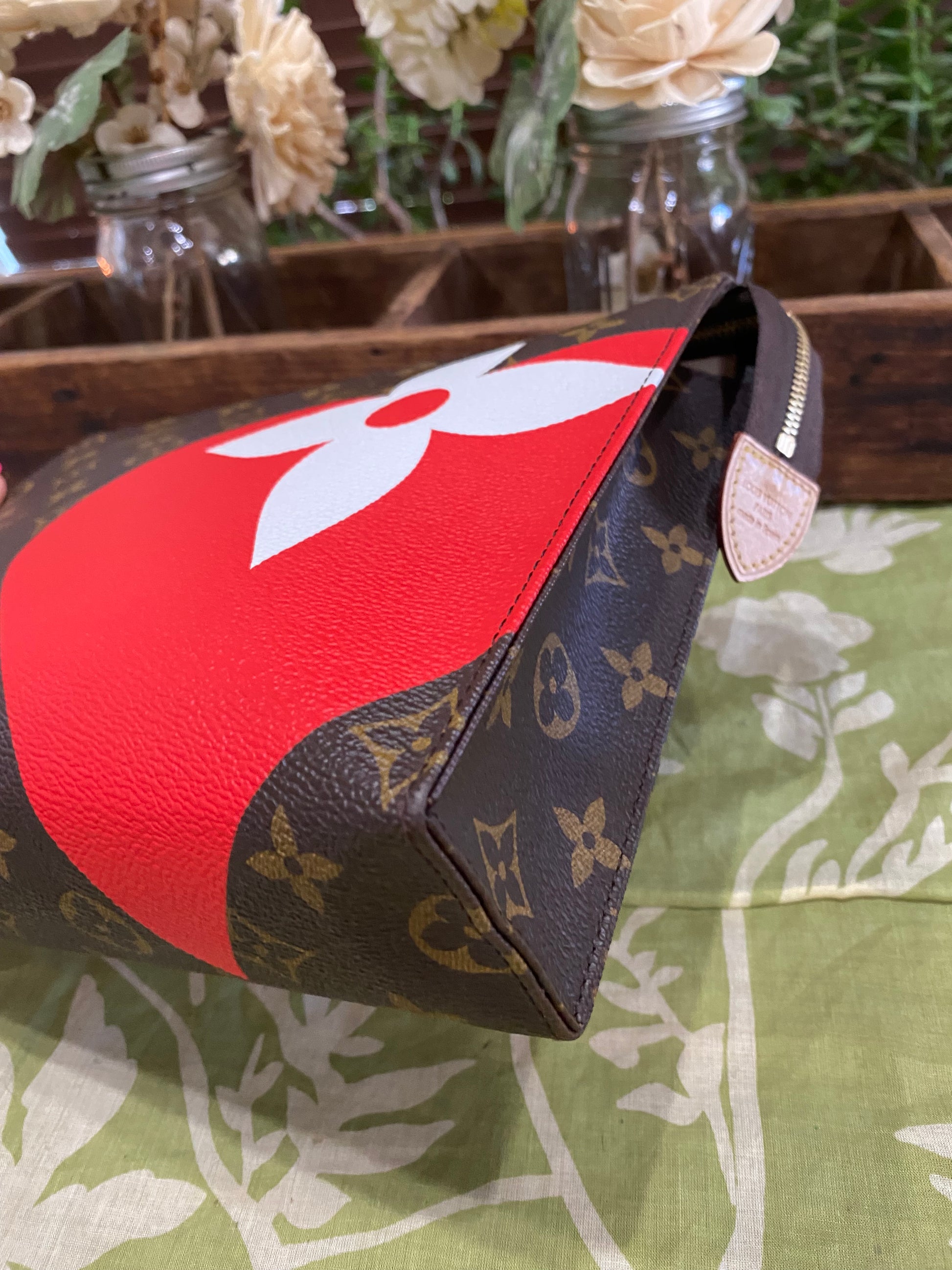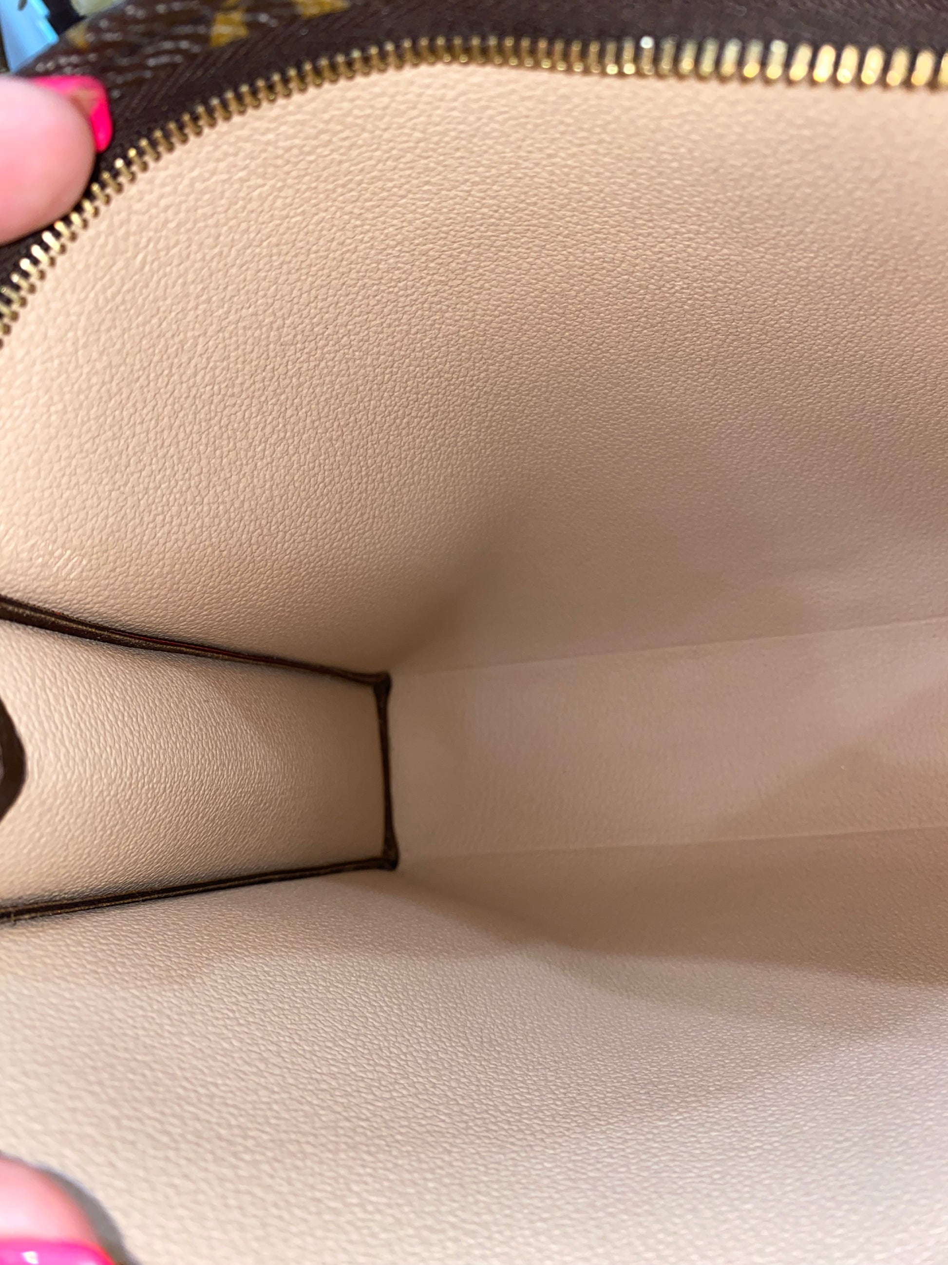 Excellent condition. No blemishes. Canvas is free of cracking or tears, print is vibrant, zipper is shiny and runs smooth, interior is free of stains, no foul smells. Comes with a non organizer, non brand strap, and dust bag.