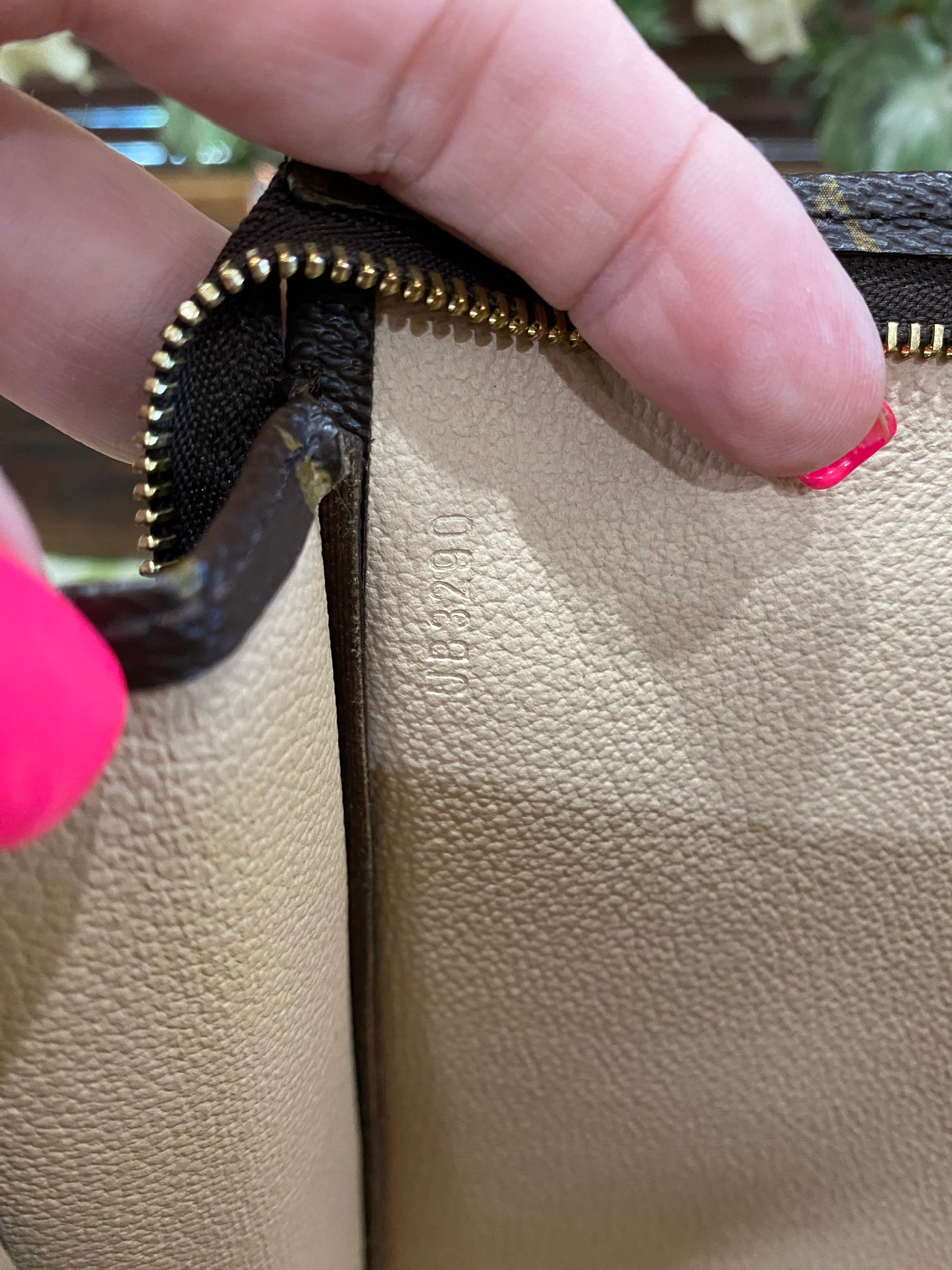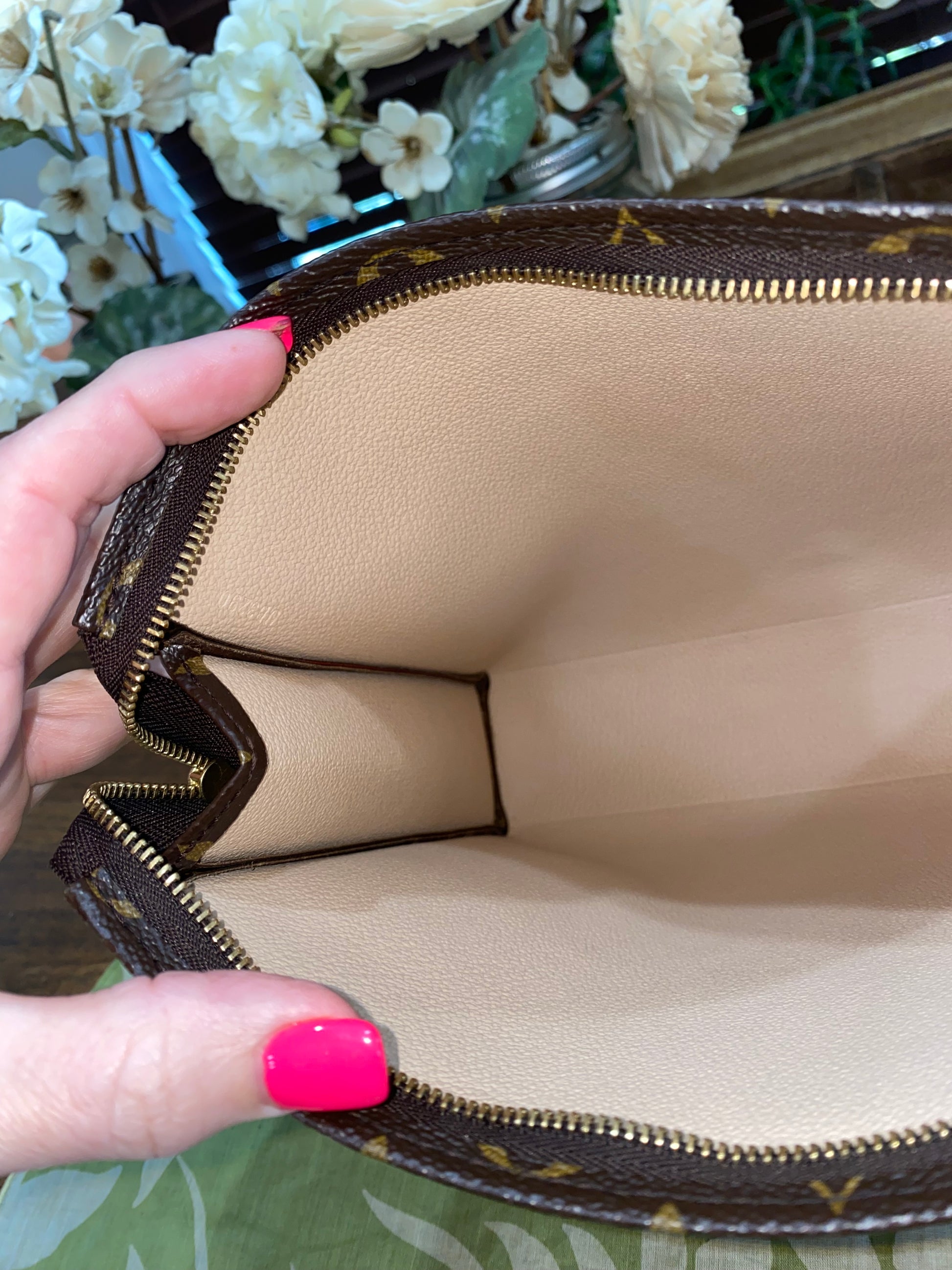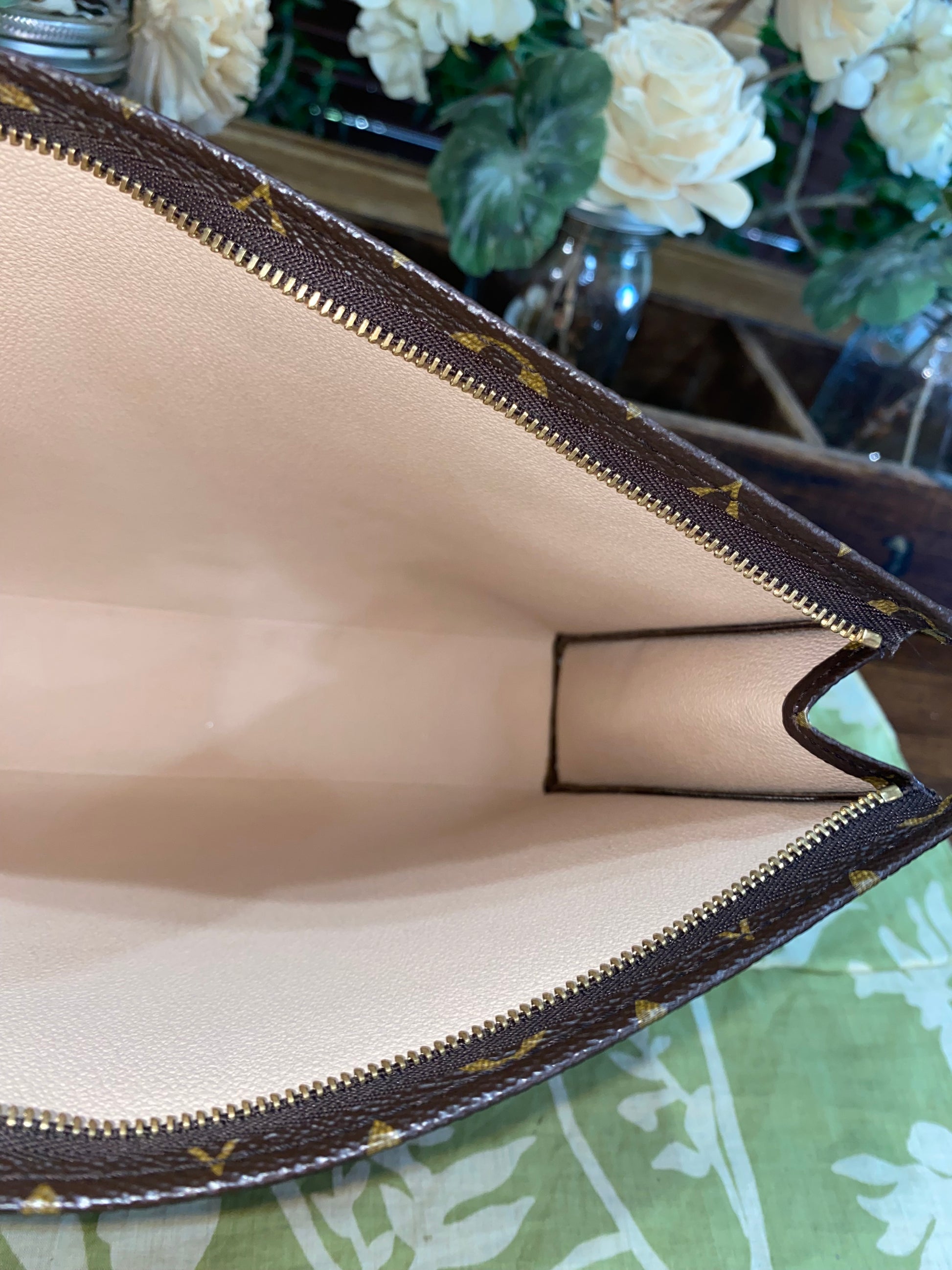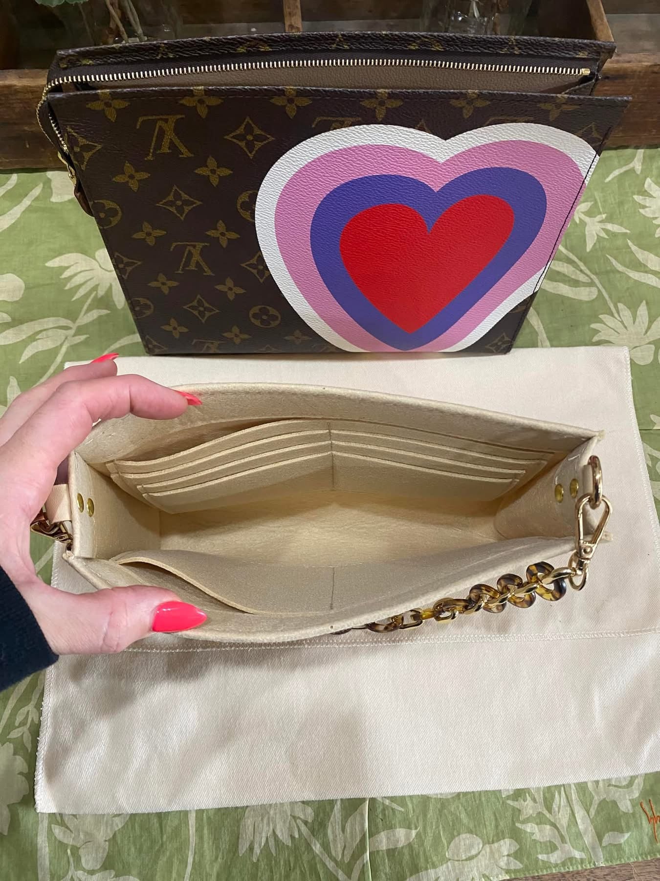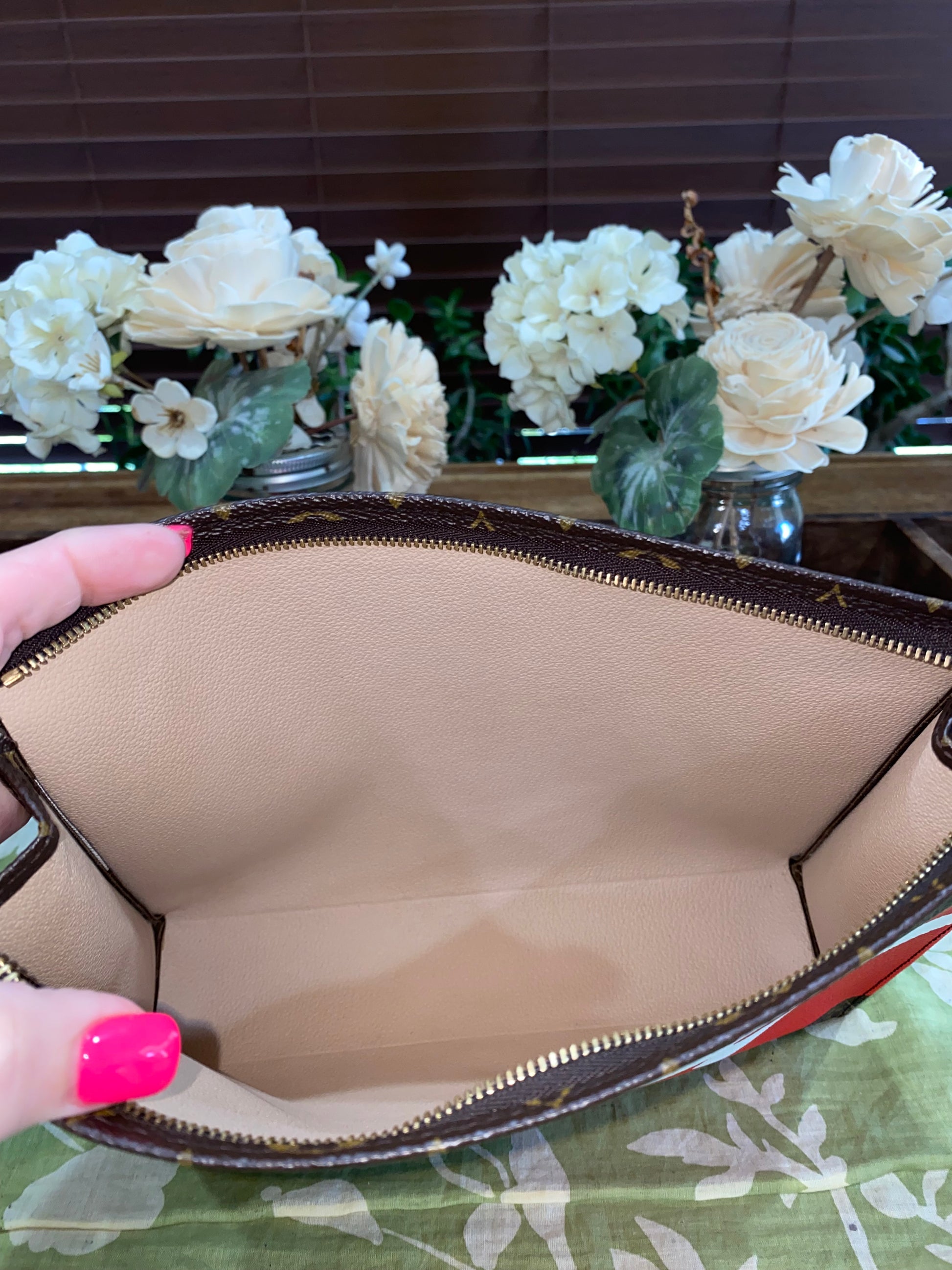 Excellent condition. No blemishes. Canvas is free of cracking or tears, print is vibrant, zipper is shiny and runs smooth, interior is free of stains, no foul smells. Comes with a non organizer, non brand strap, and dust bag.