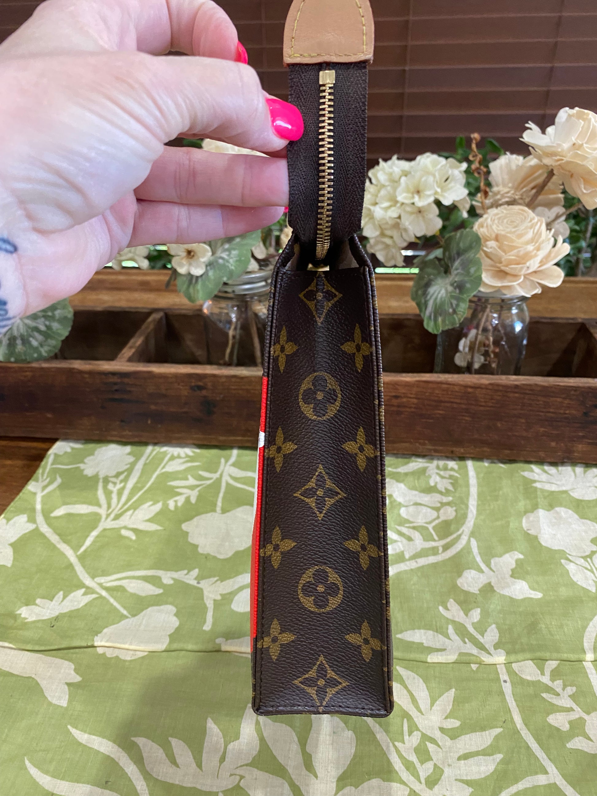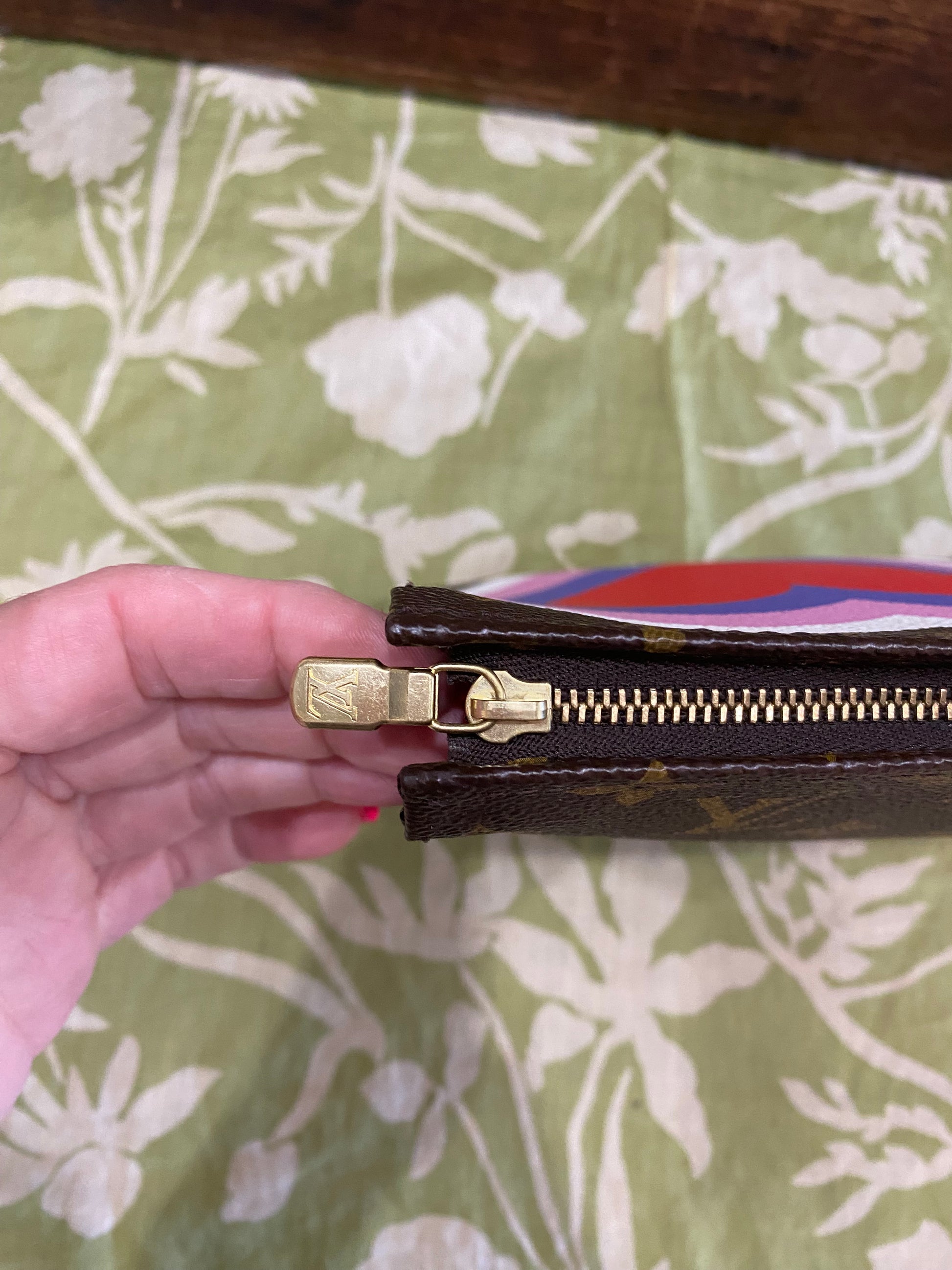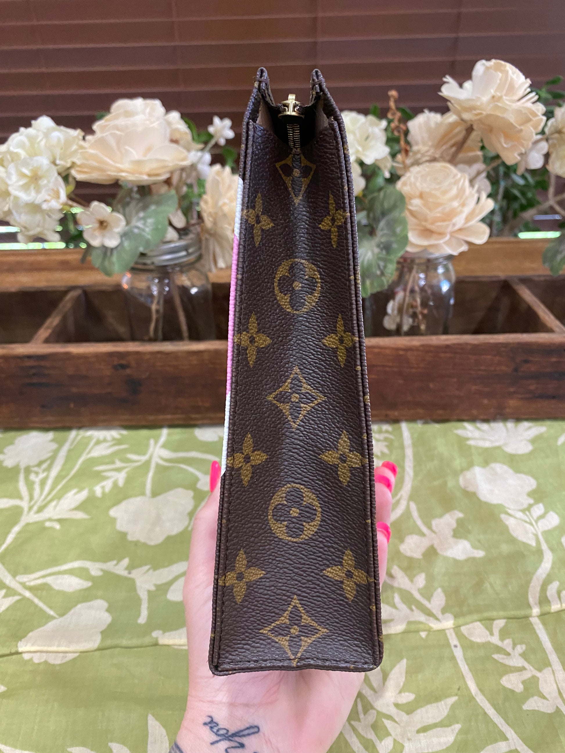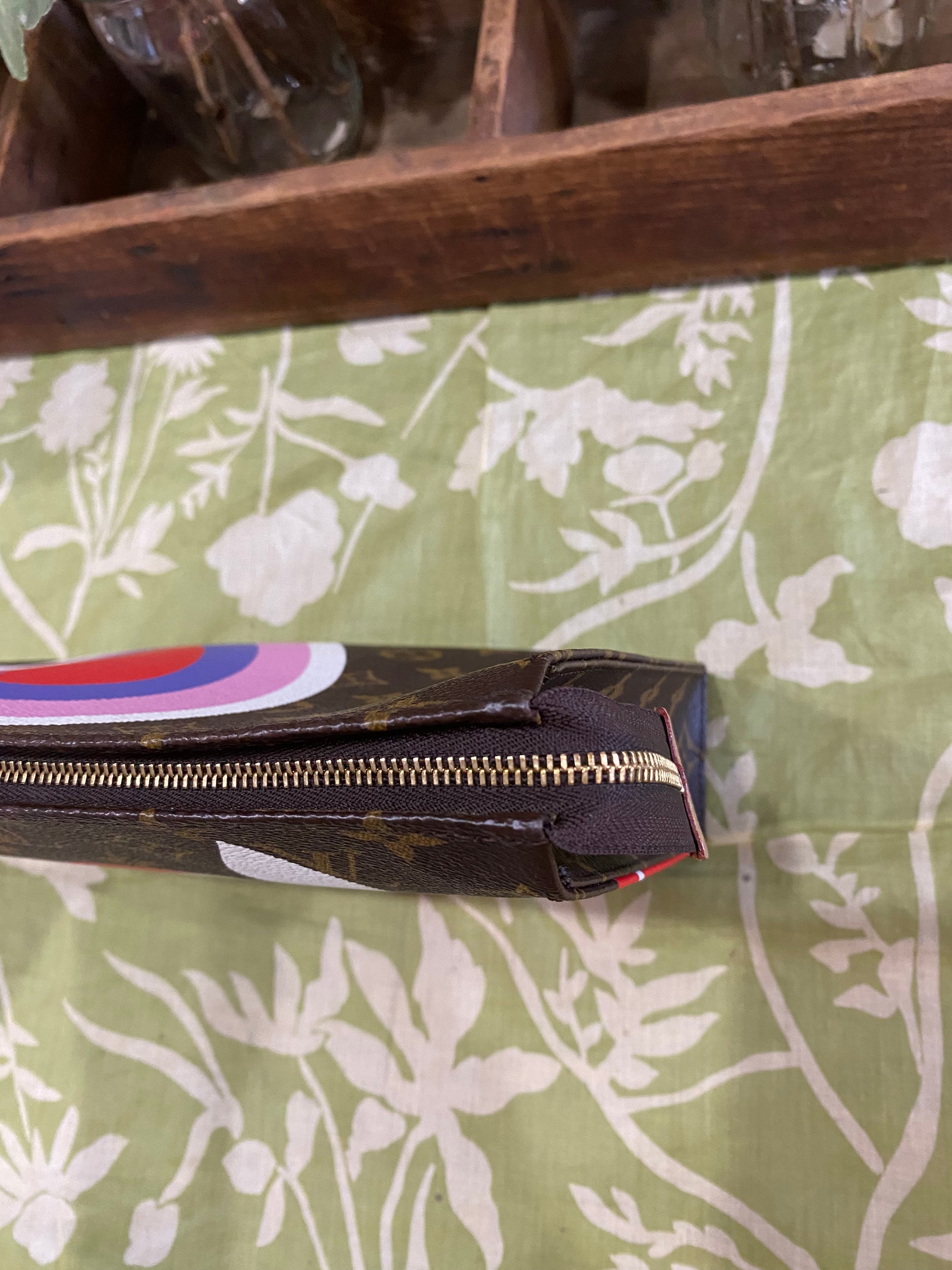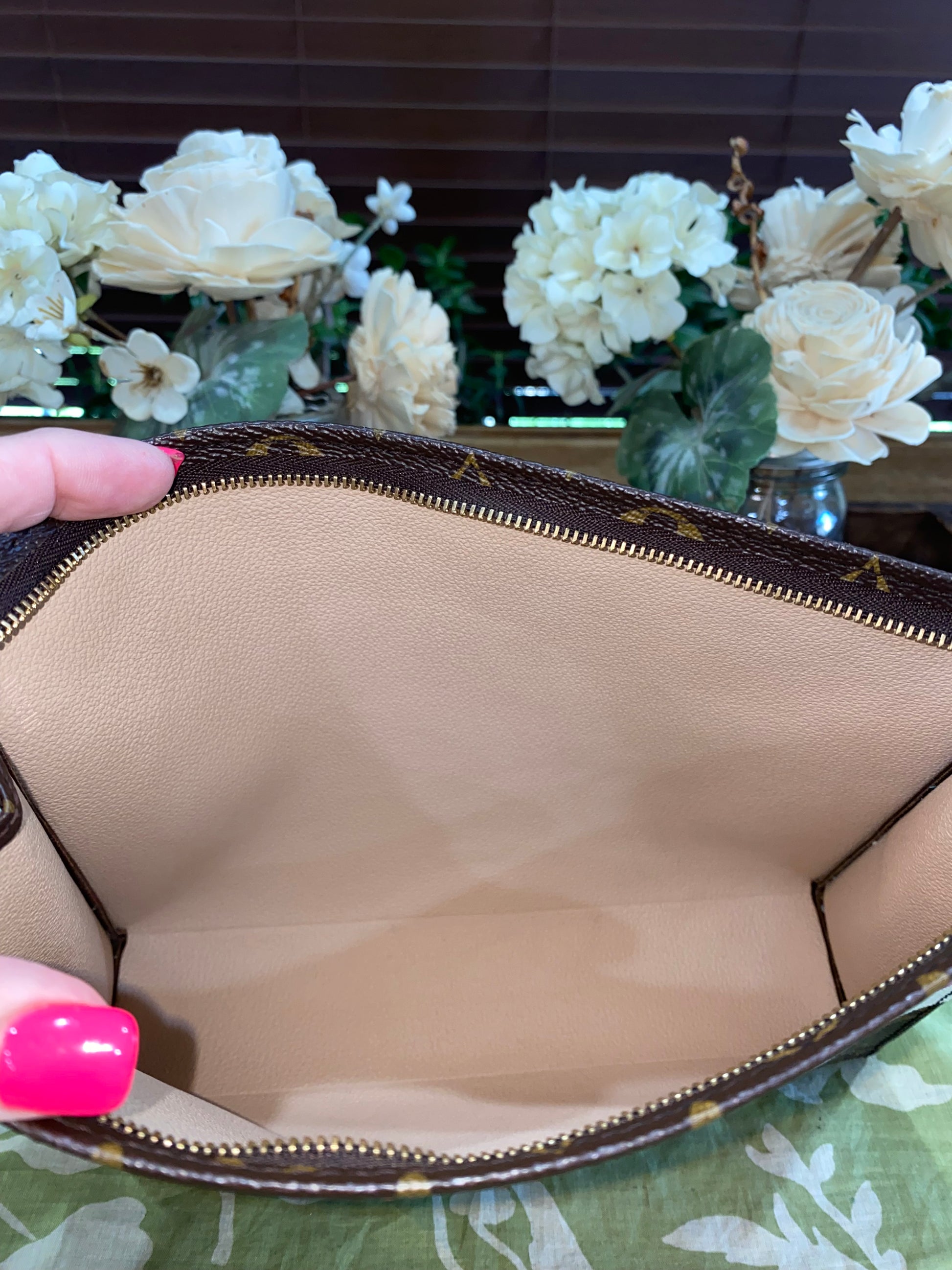 Excellent condition. No blemishes. Canvas is free of cracking or tears, print is vibrant, zipper is shiny and runs smooth, interior is free of stains, no foul smells. Comes with a non organizer, non brand strap, and dust bag.