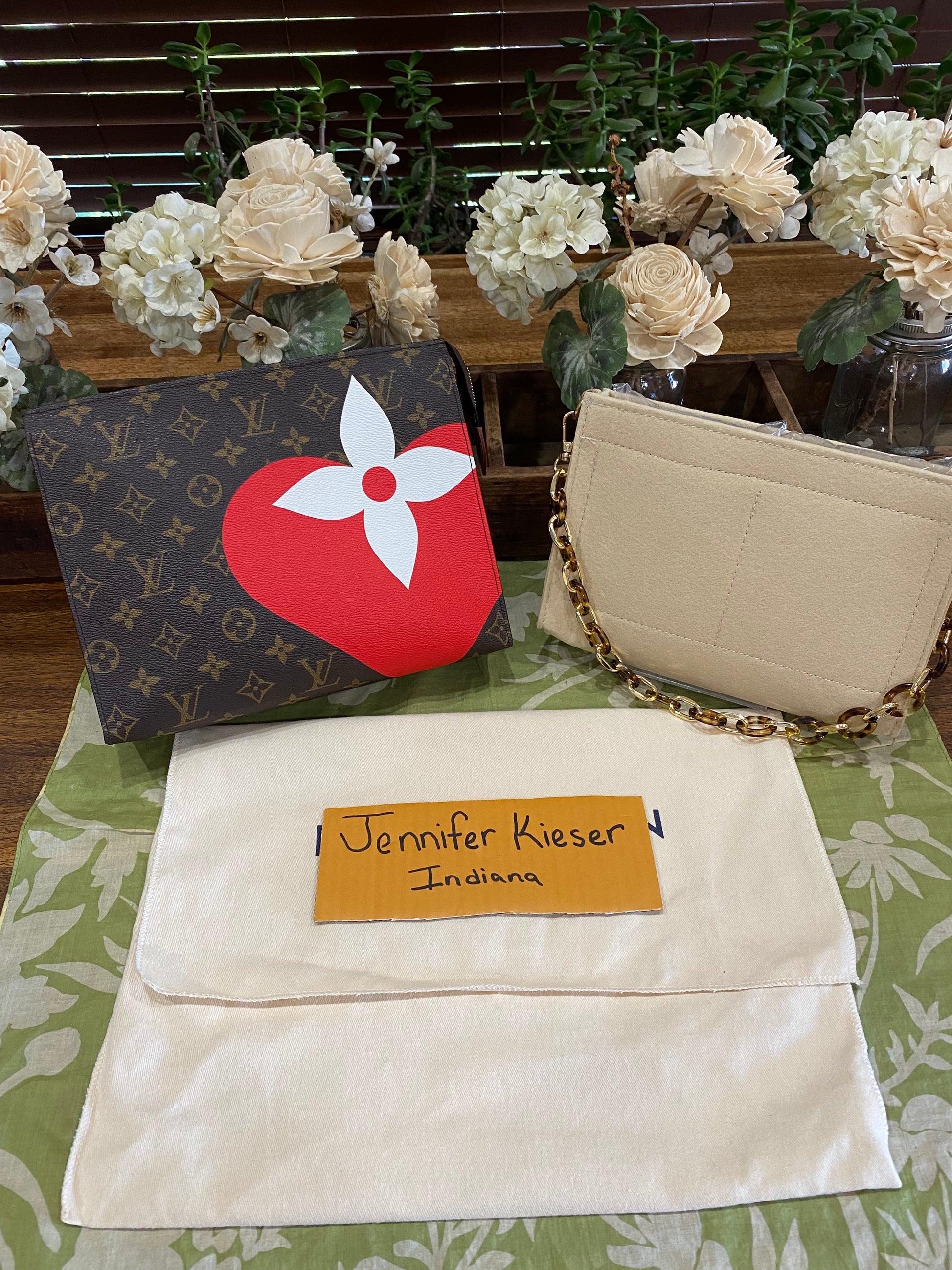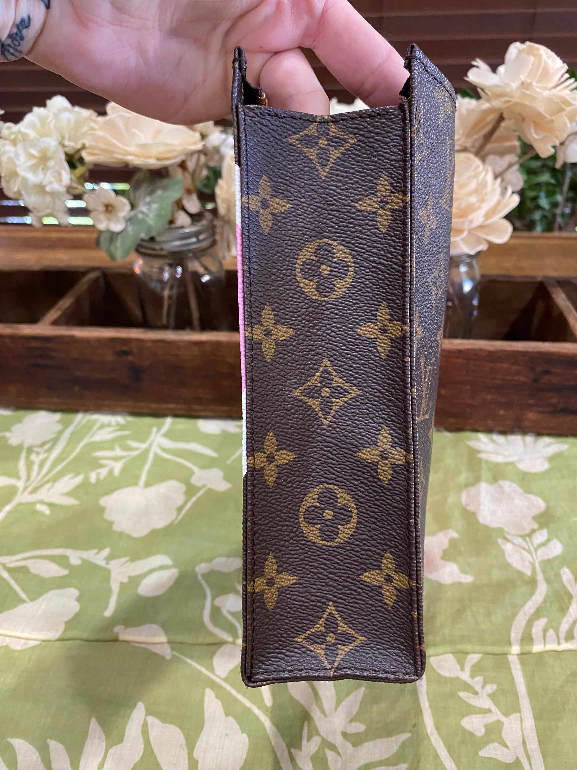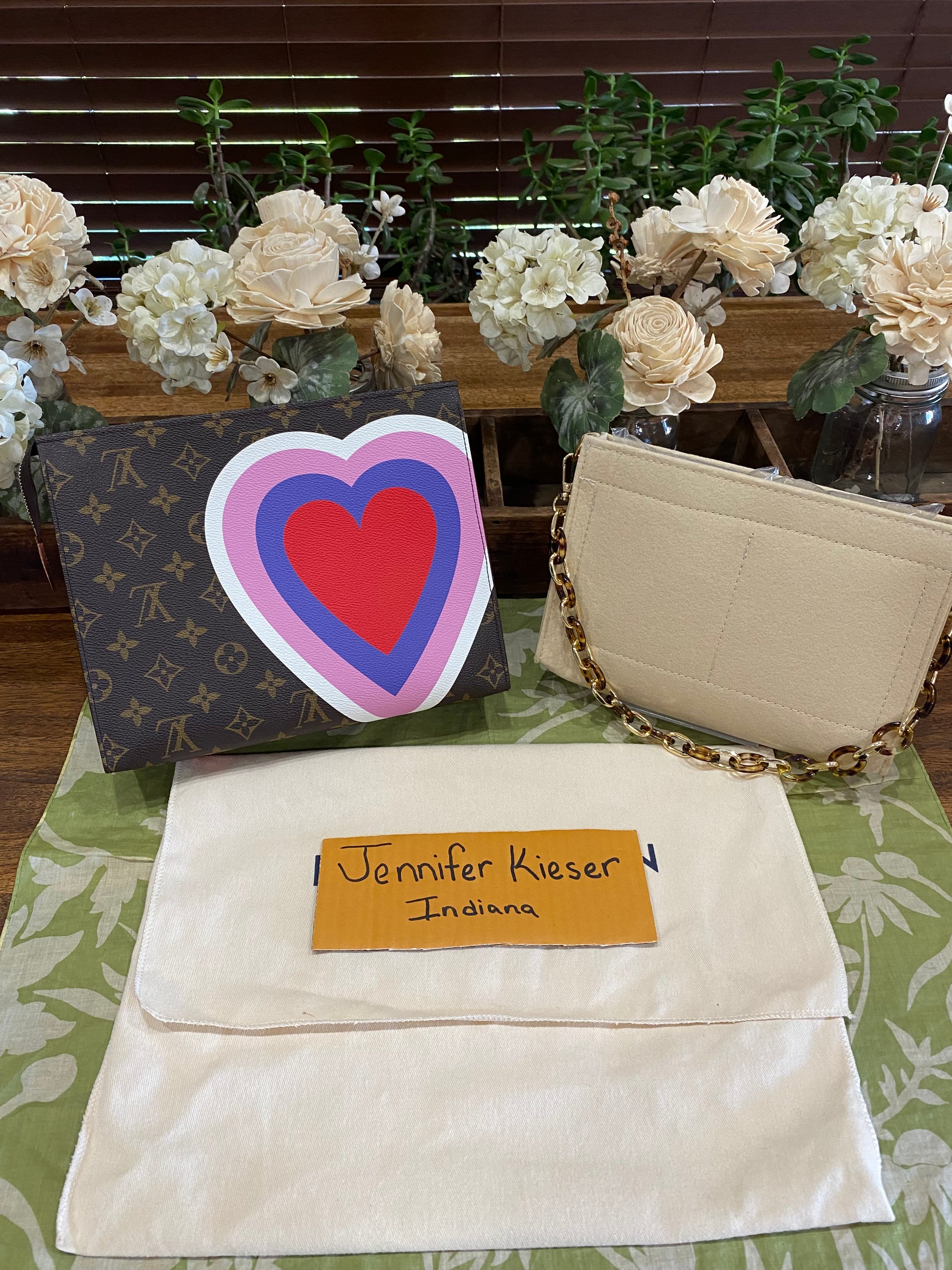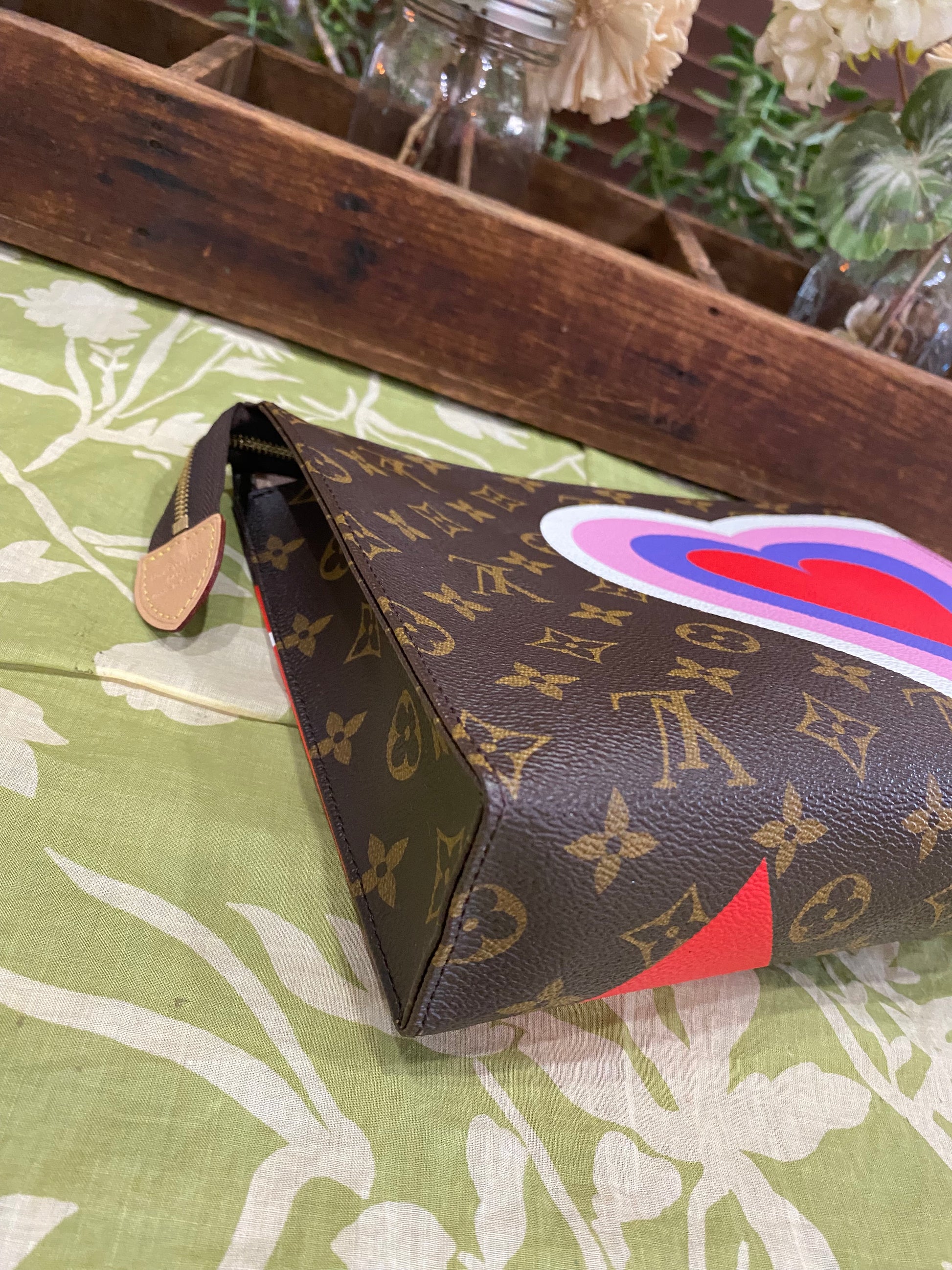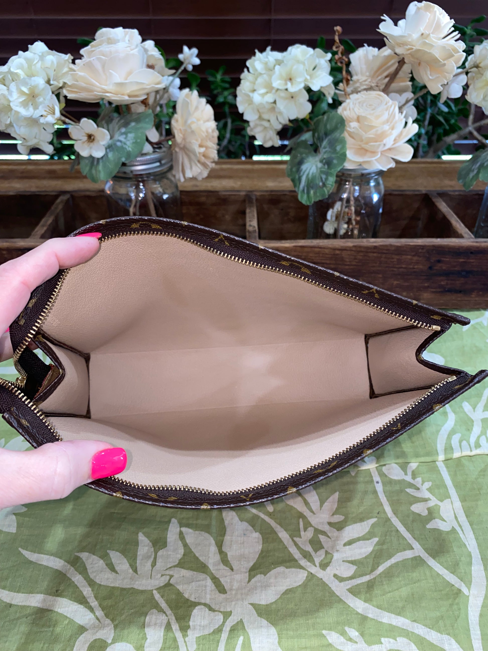 Excellent condition. No blemishes. Canvas is free of cracking or tears, print is vibrant, zipper is shiny and runs smooth, interior is free of stains, no foul smells. Comes with a non organizer, non brand strap, and dust bag.
