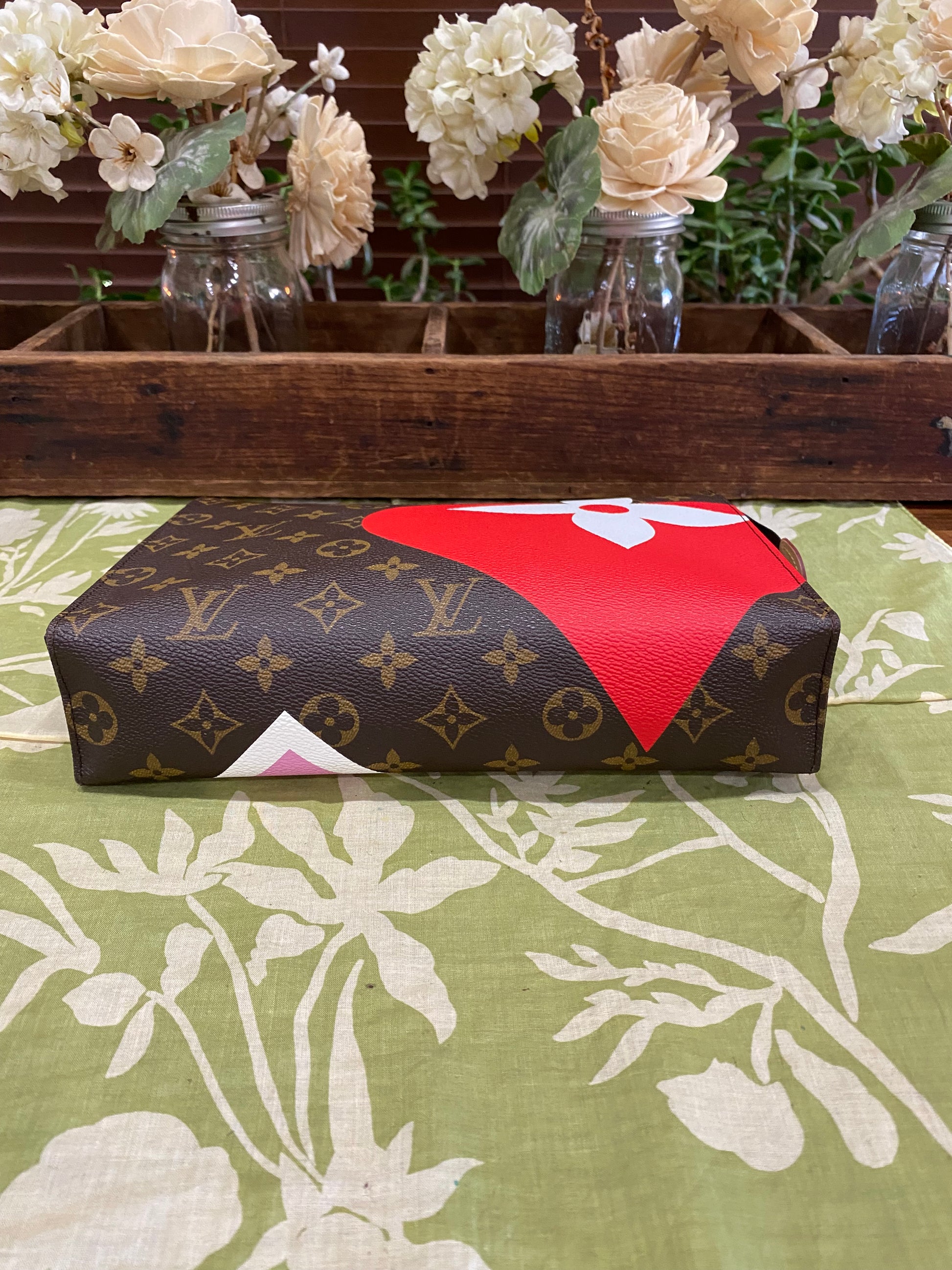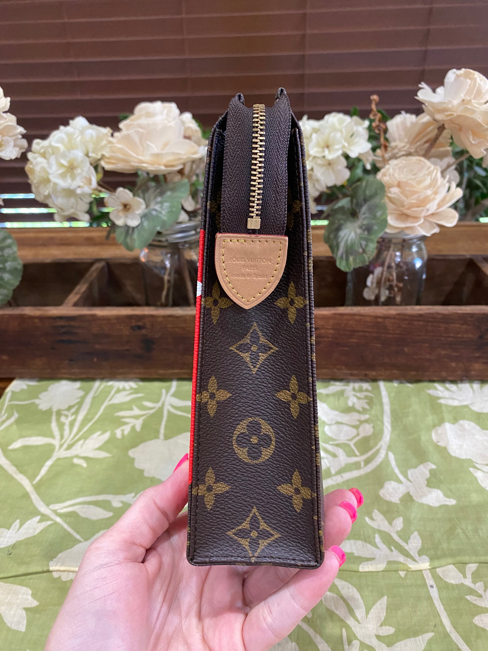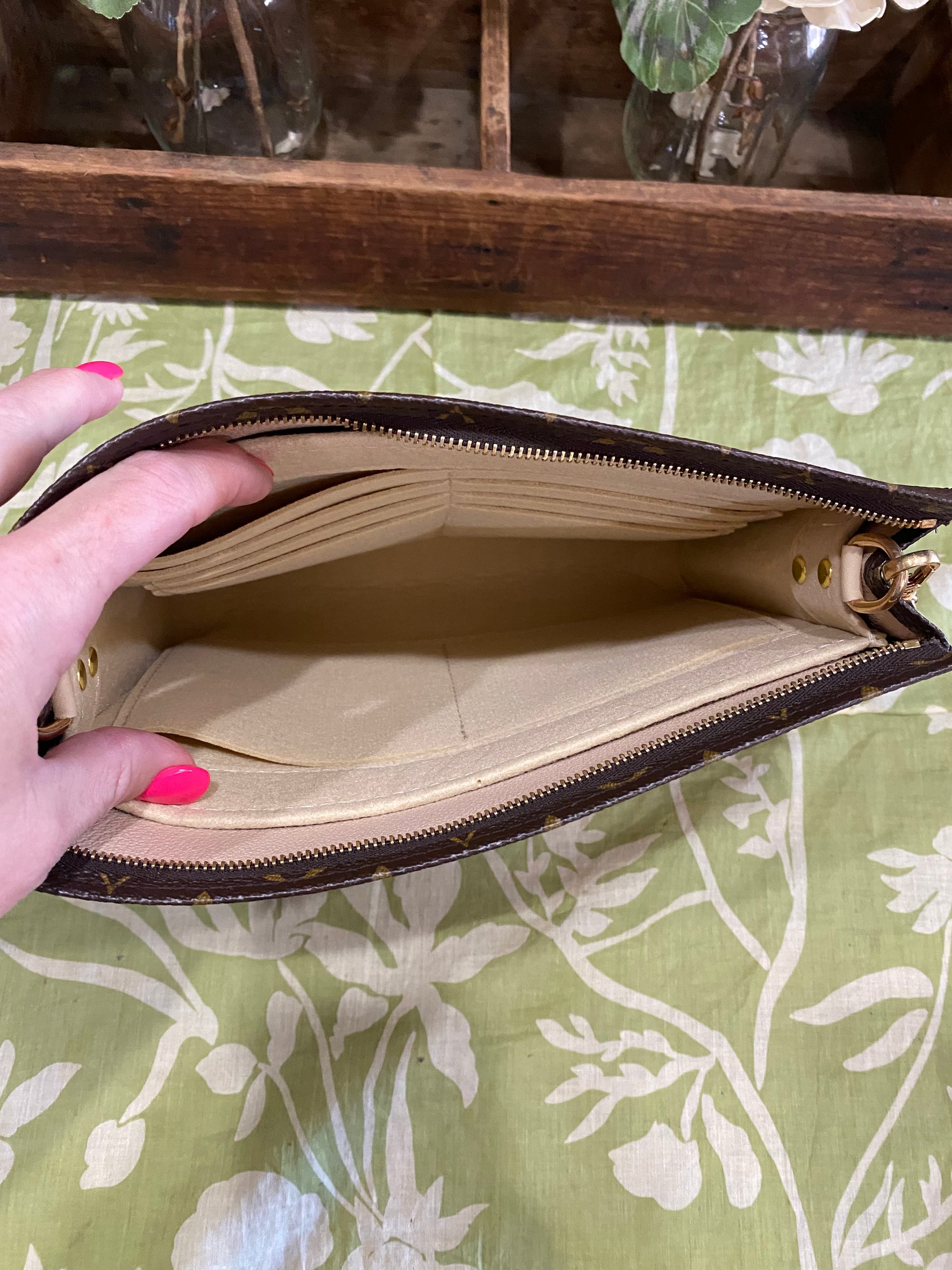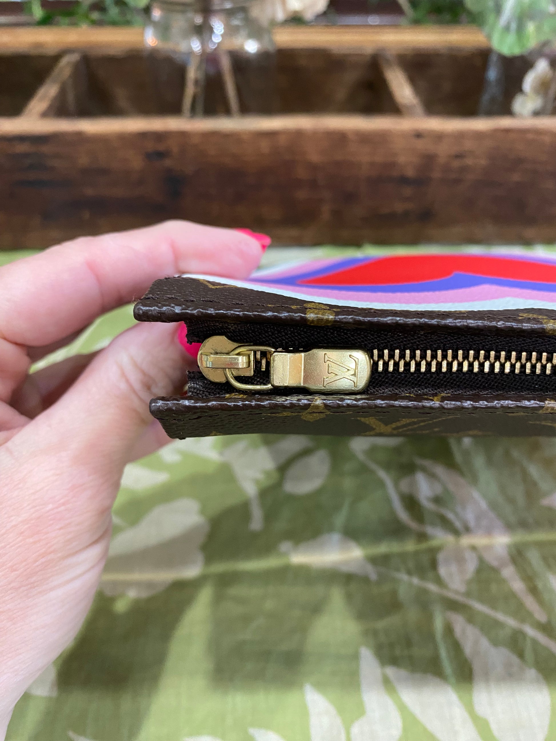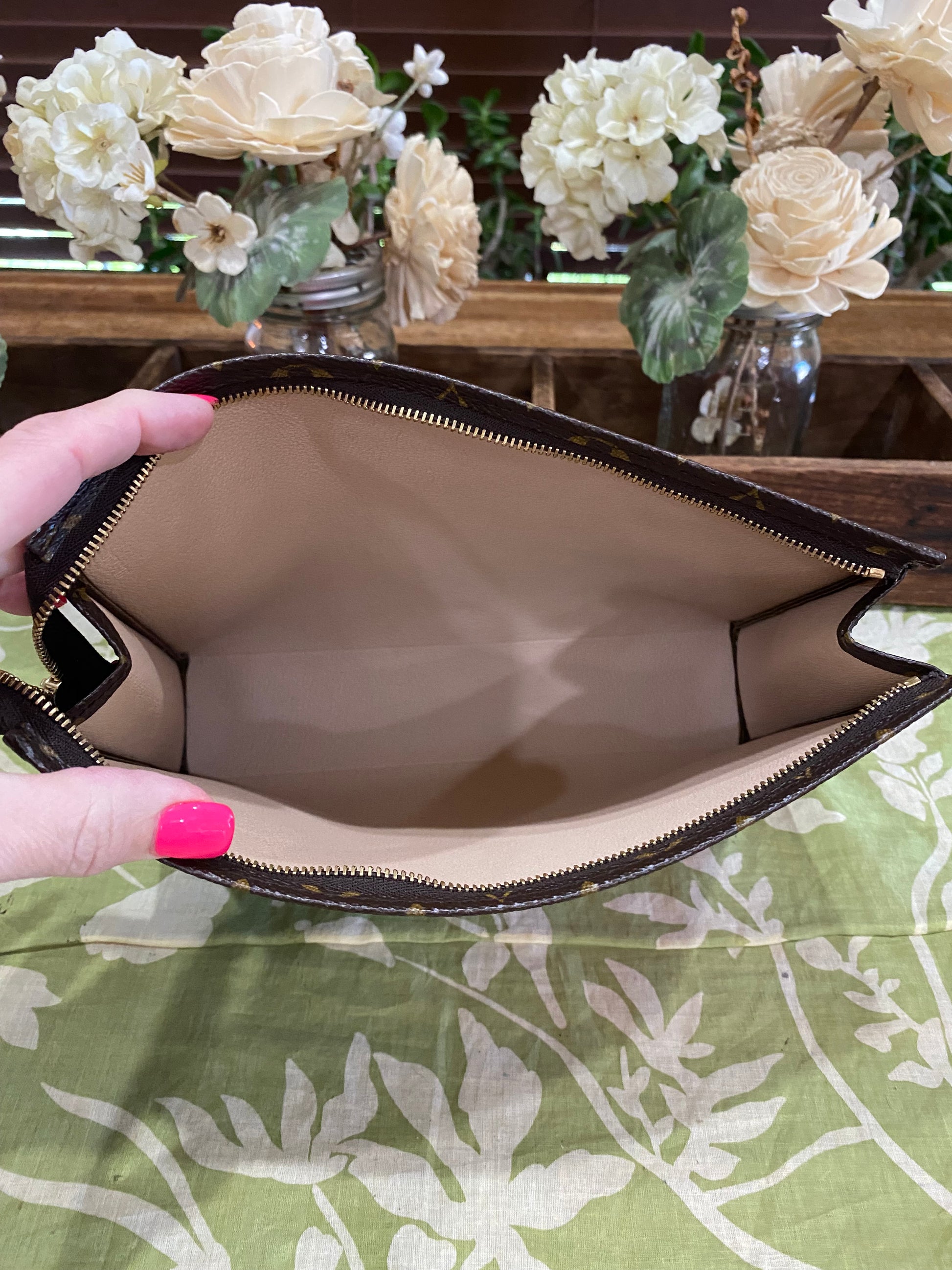 Excellent condition. No blemishes. Canvas is free of cracking or tears, print is vibrant, zipper is shiny and runs smooth, interior is free of stains, no foul smells. Comes with a non organizer, non brand strap, and dust bag.
