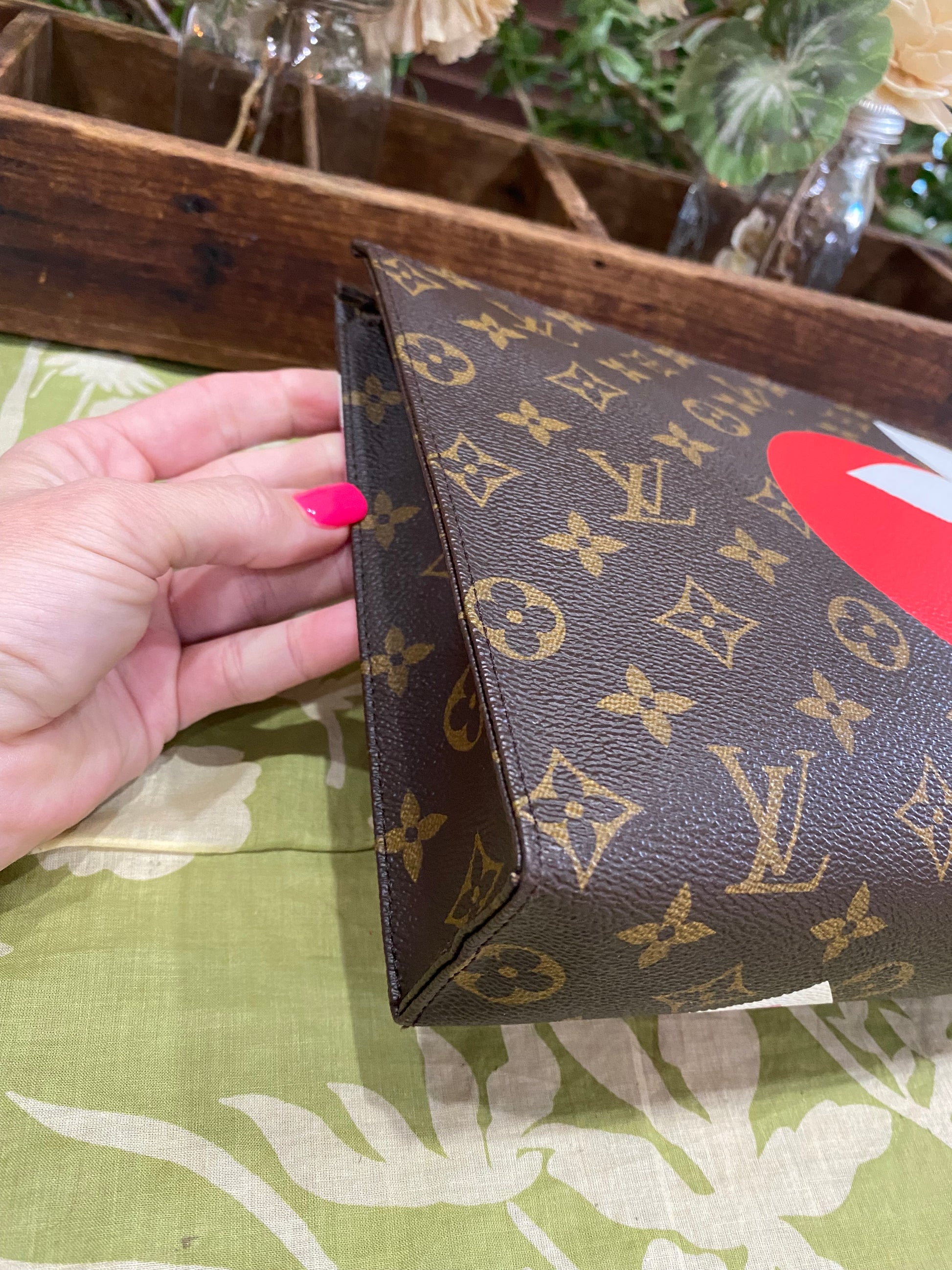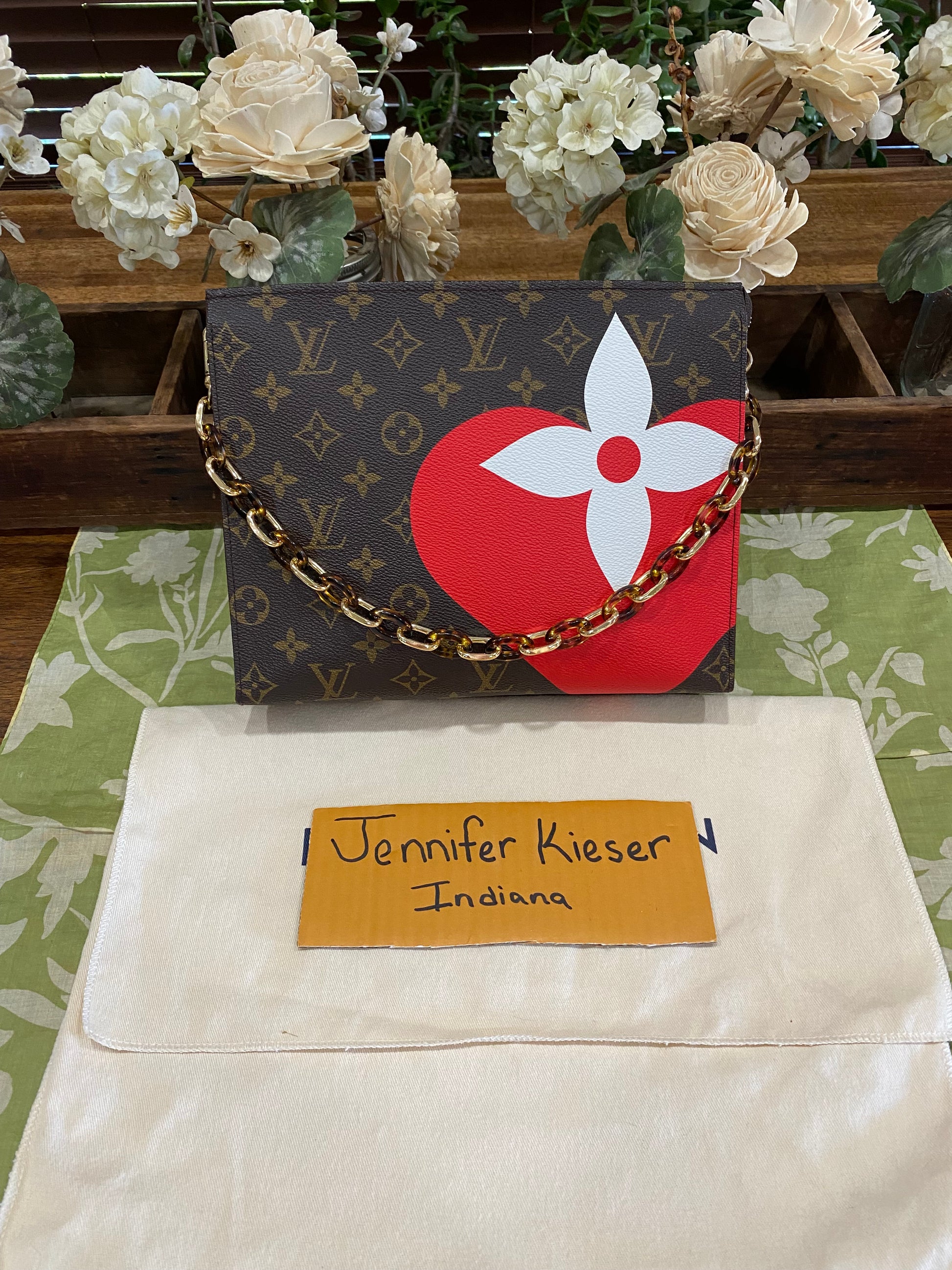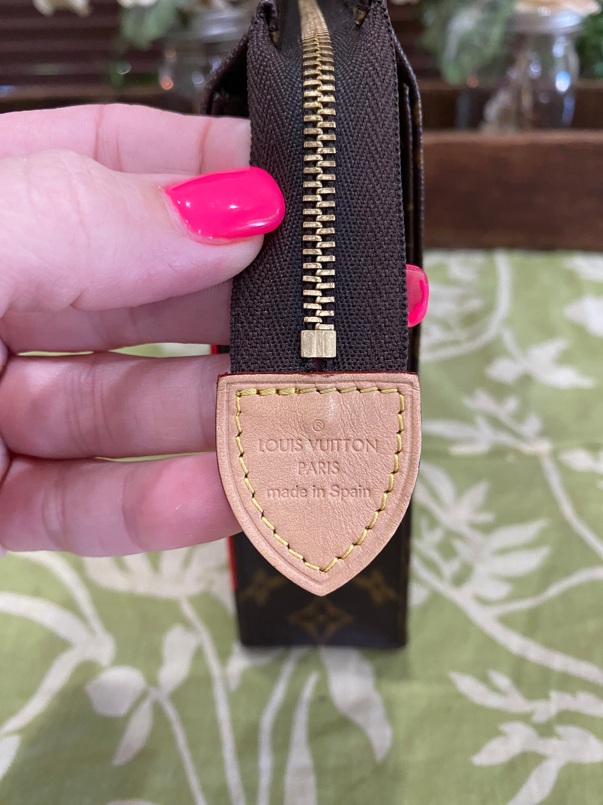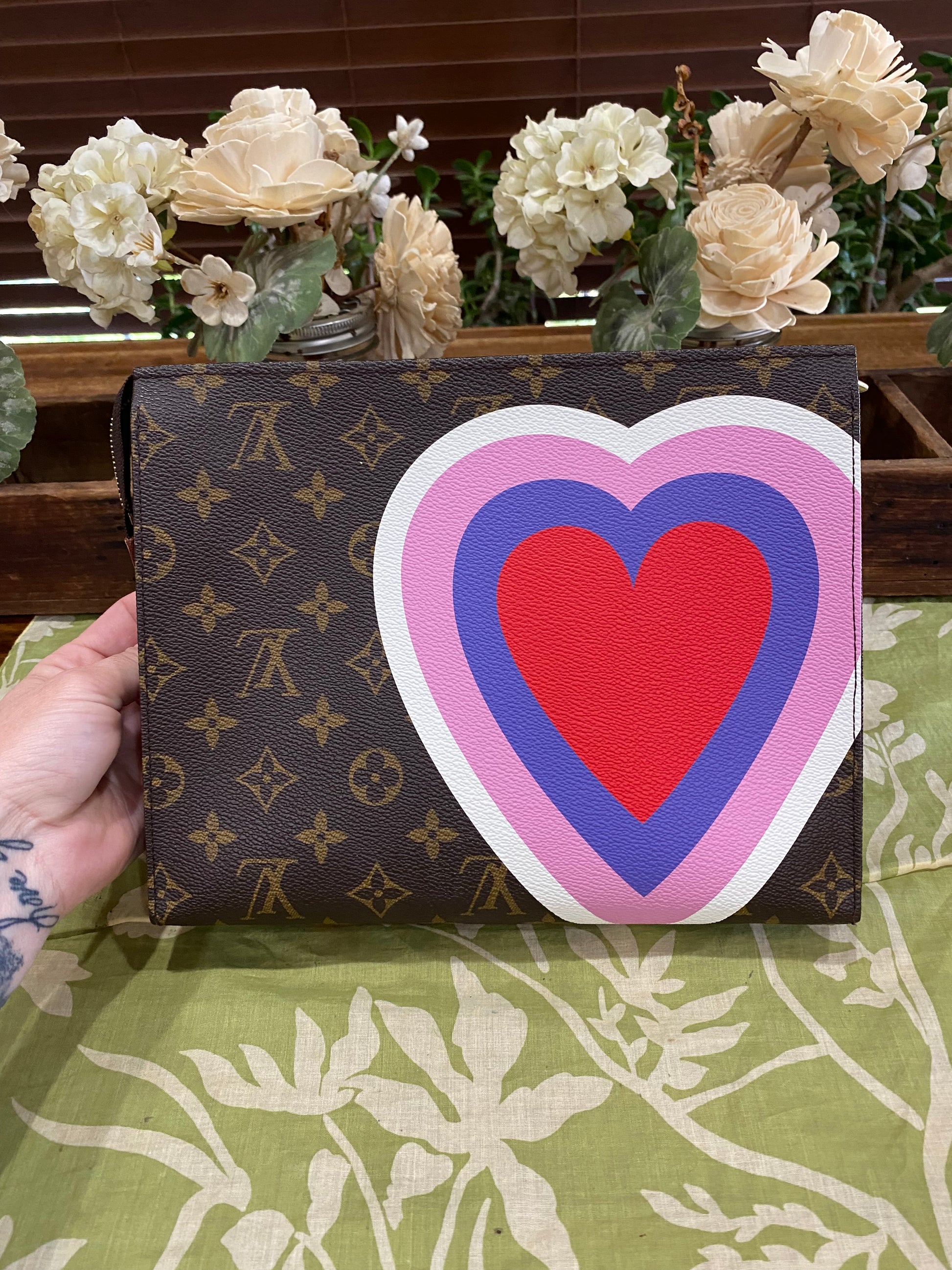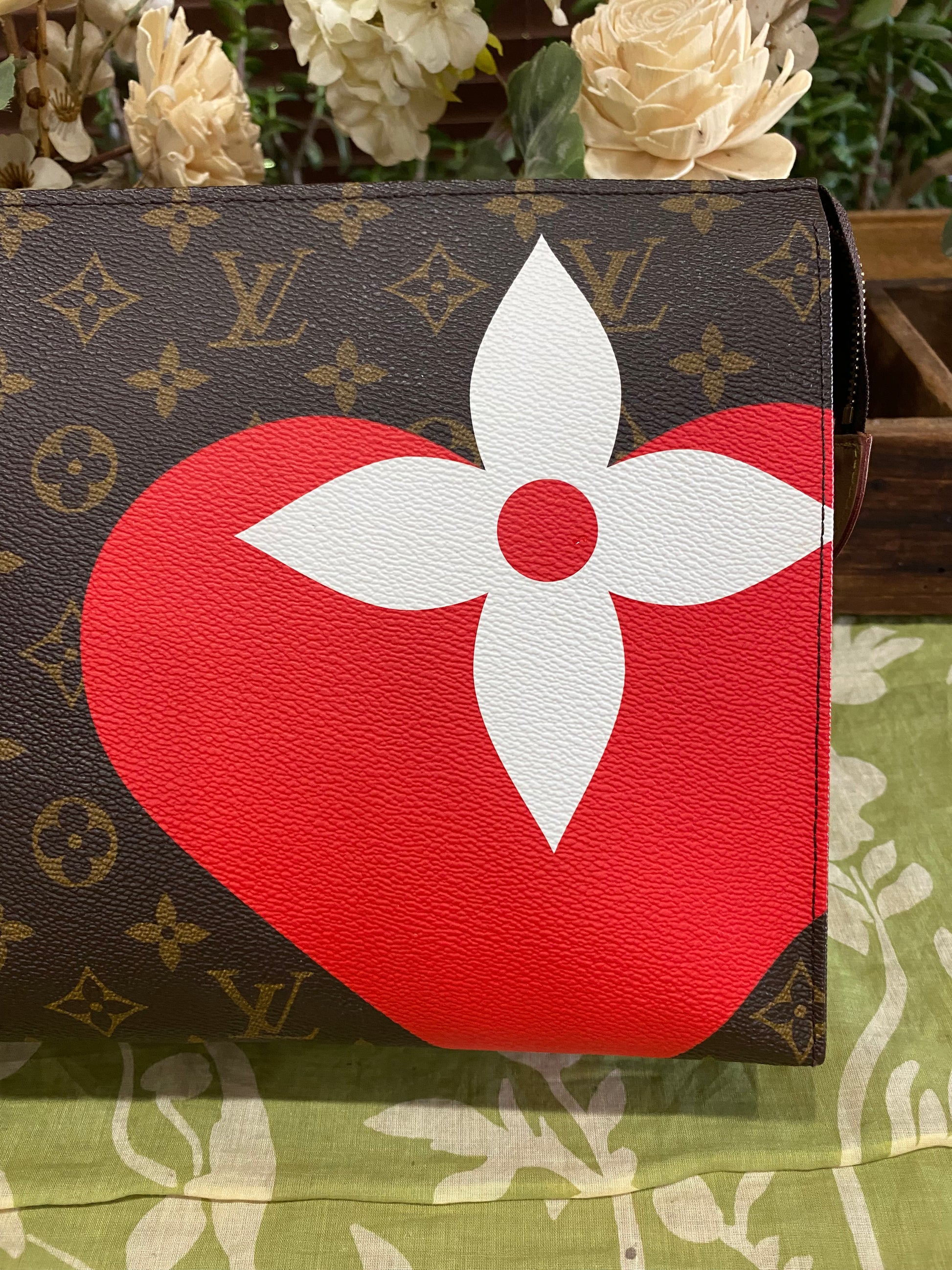 Excellent condition. No blemishes. Canvas is free of cracking or tears, print is vibrant, zipper is shiny and runs smooth, interior is free of stains, no foul smells. Comes with a non organizer, non brand strap, and dust bag.