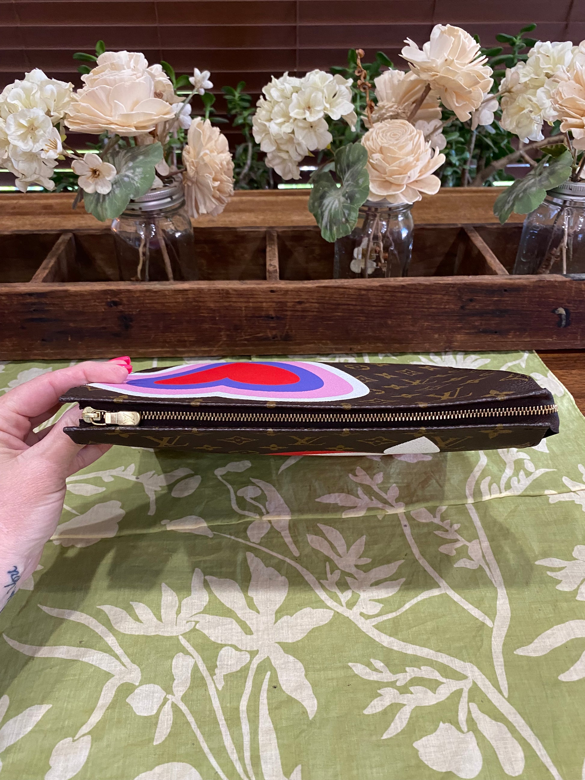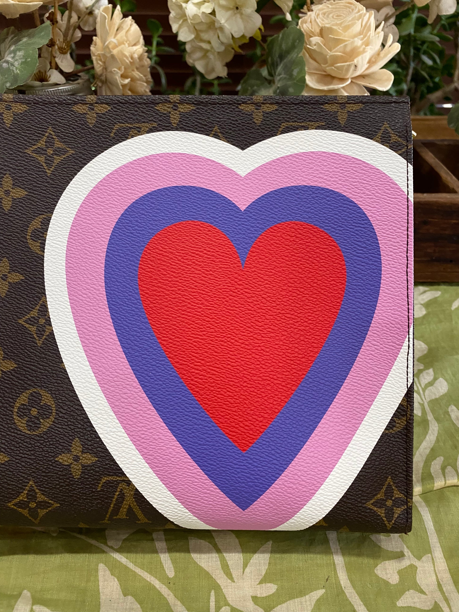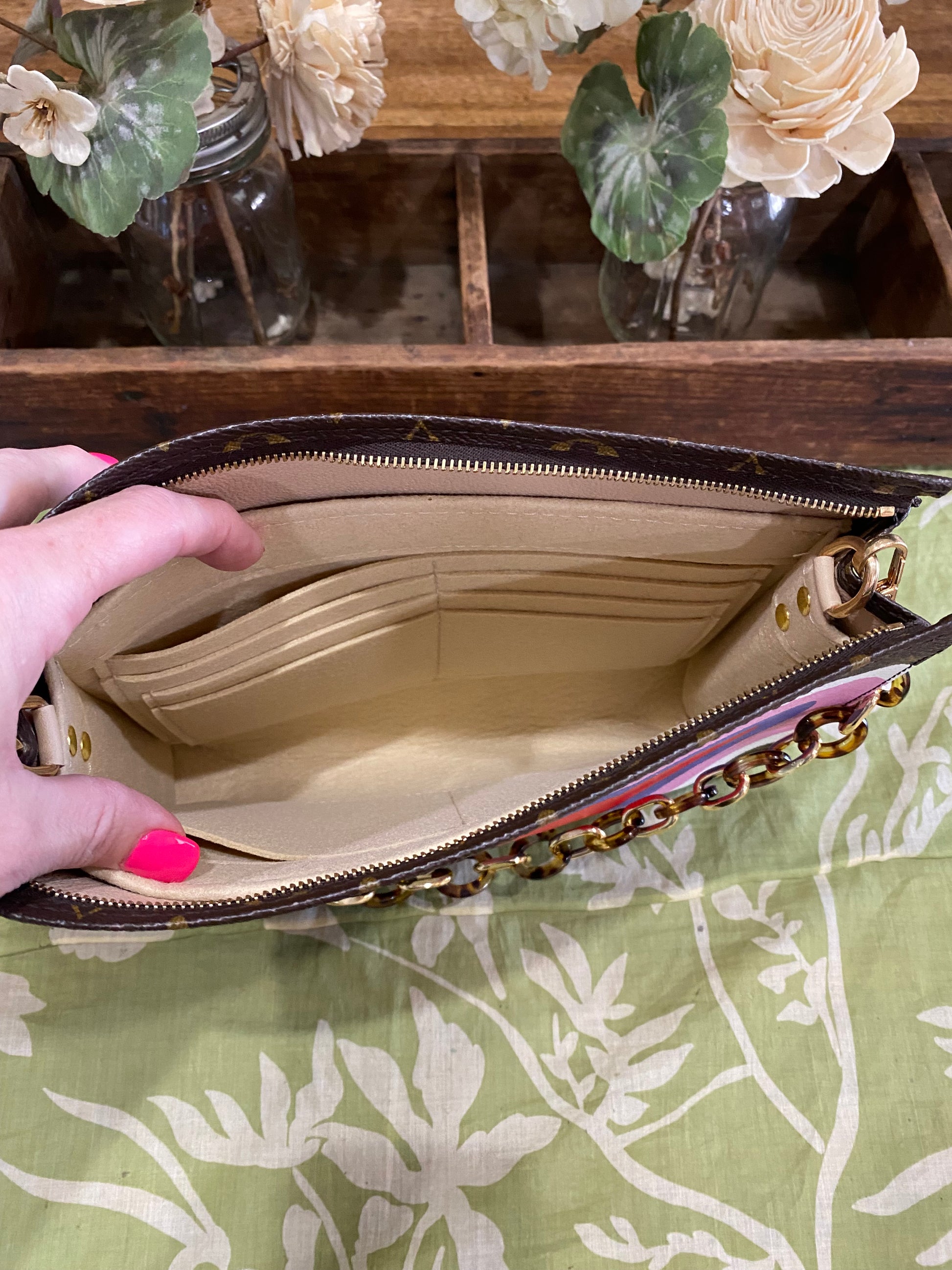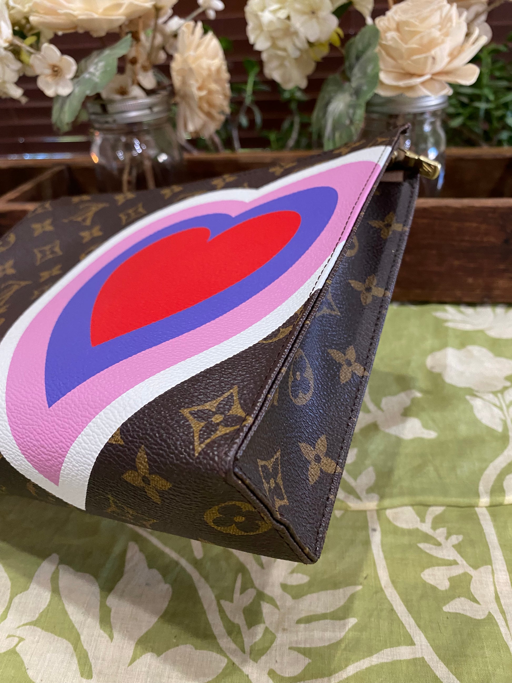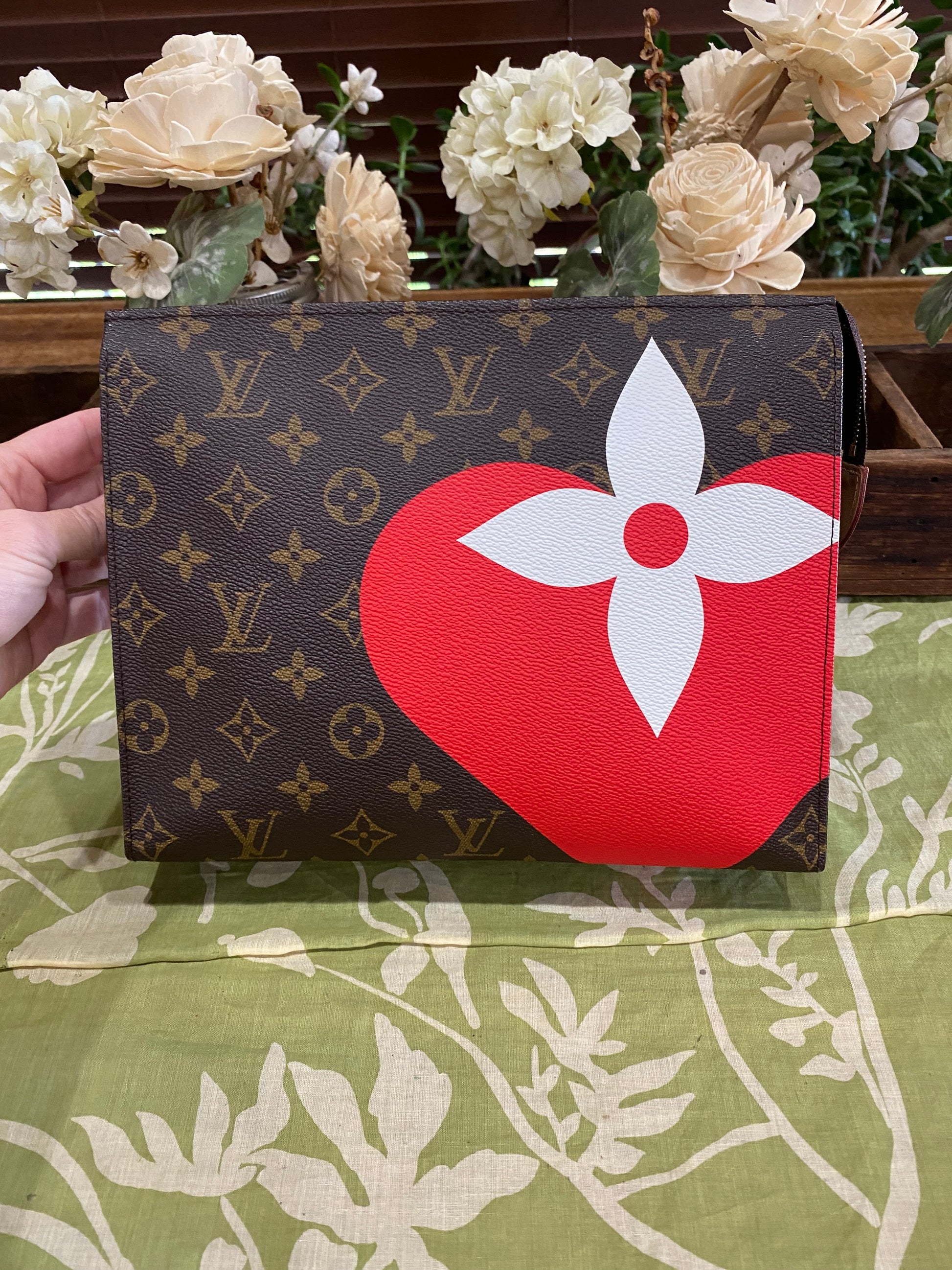 Excellent condition. No blemishes. Canvas is free of cracking or tears, print is vibrant, zipper is shiny and runs smooth, interior is free of stains, no foul smells. Comes with a non organizer, non brand strap, and dust bag.