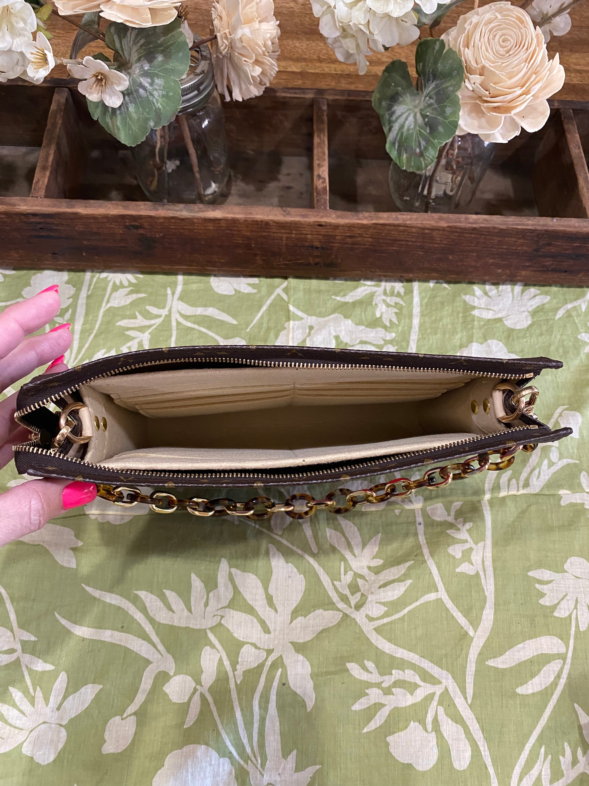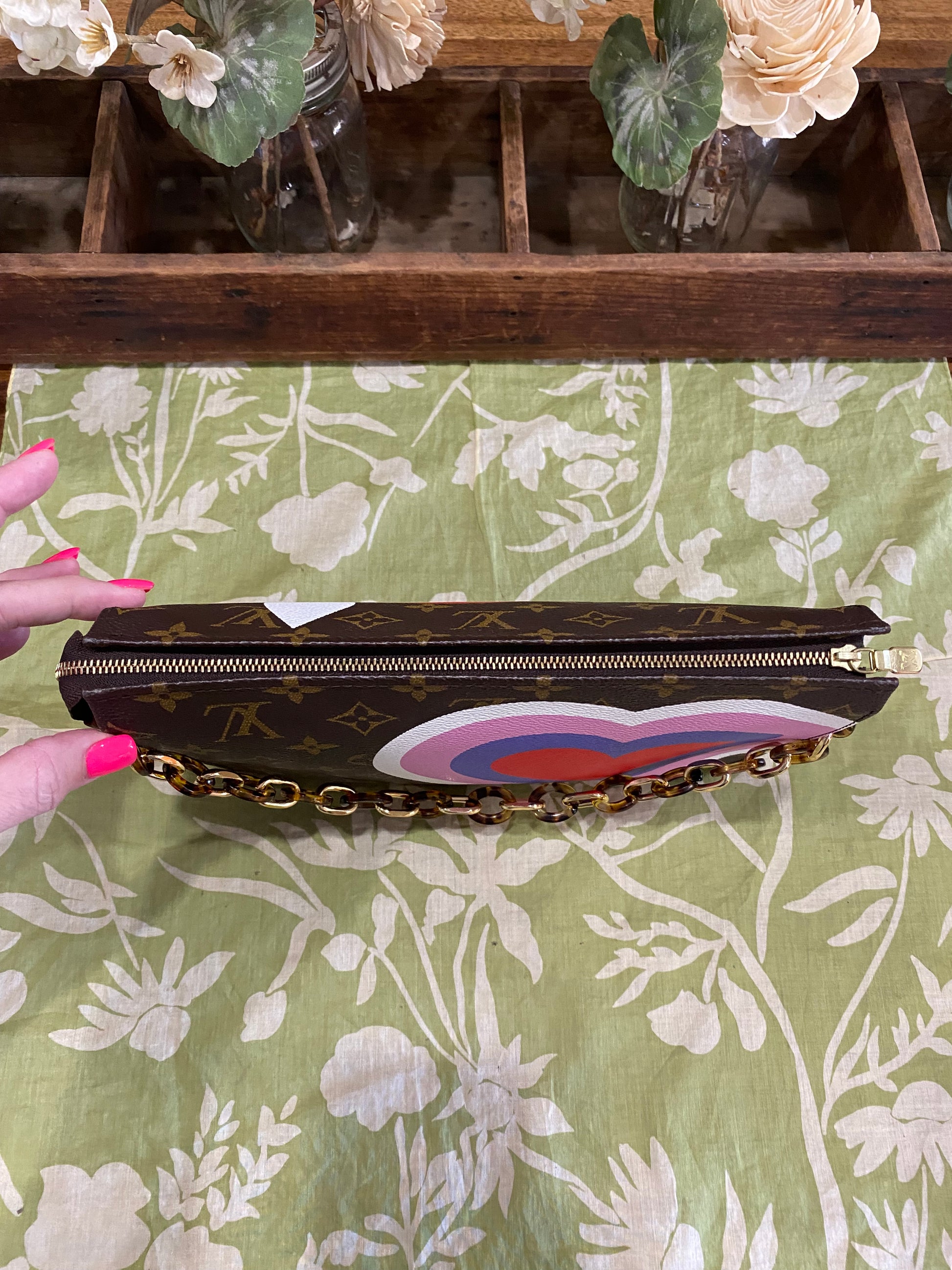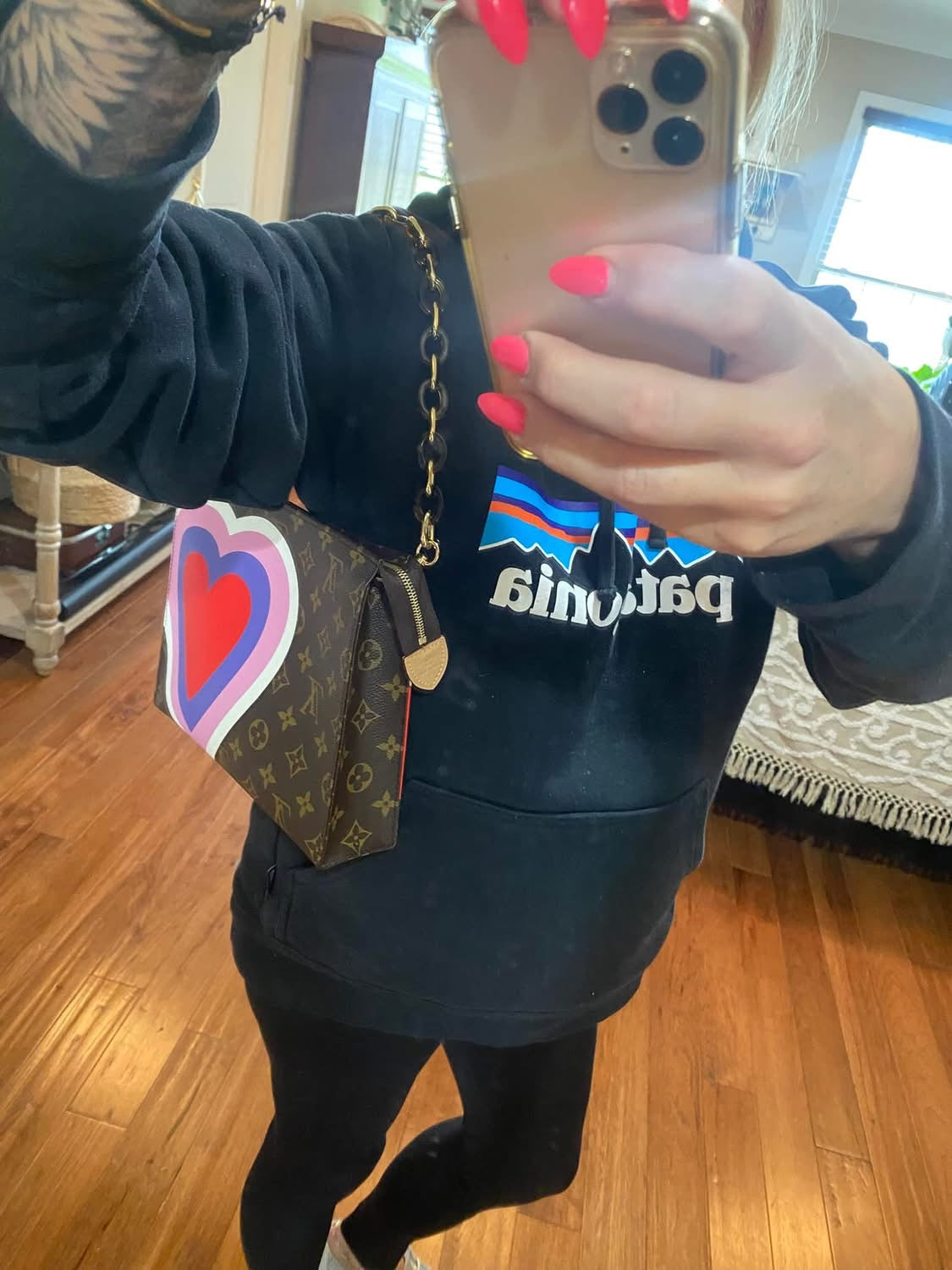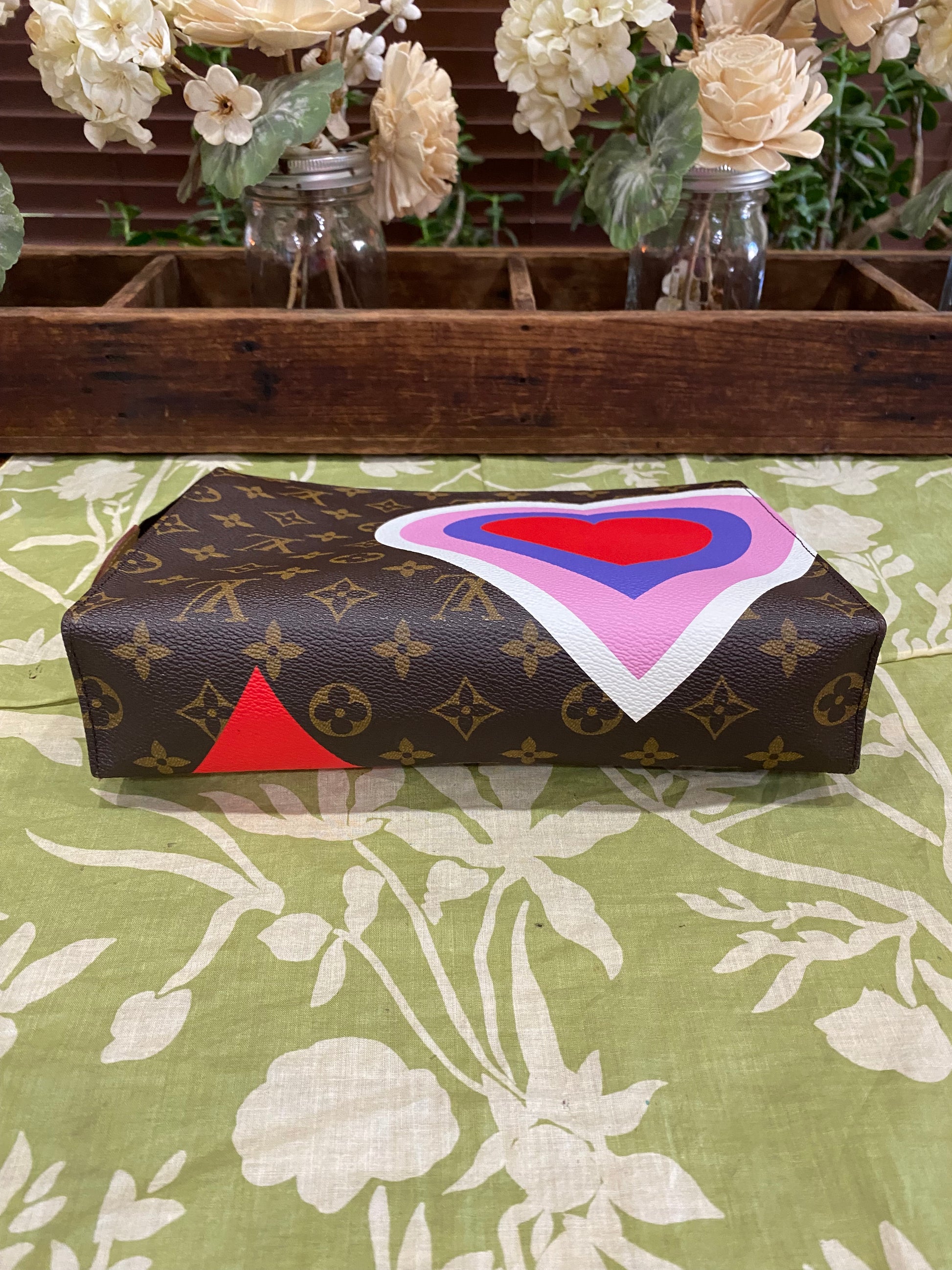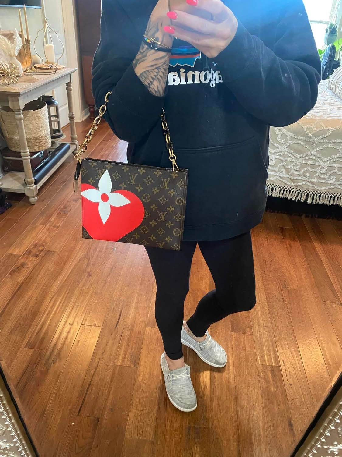 Excellent condition. No blemishes. Canvas is free of cracking or tears, print is vibrant, zipper is shiny and runs smooth, interior is free of stains, no foul smells. Comes with a non organizer, non brand strap, and dust bag.
