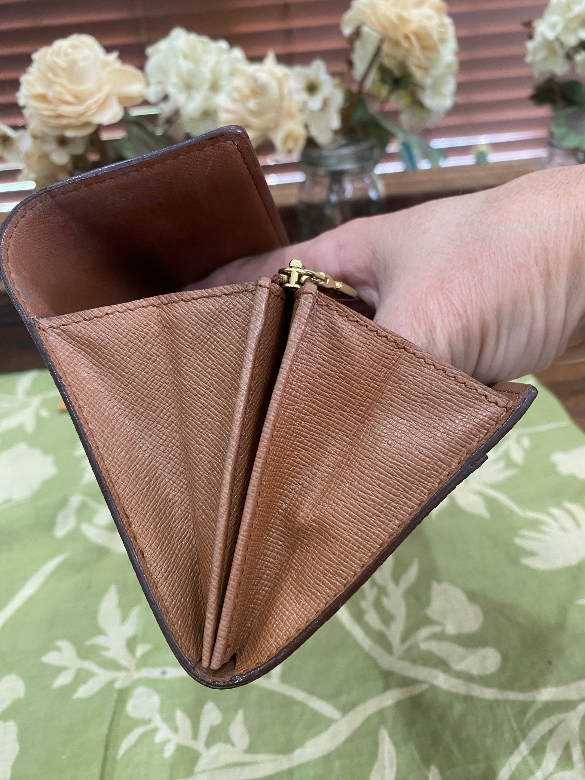 Canvas is free of cracking or tears, no fading of print, glazing is intact and scuff free, snap is secure, interior has fading/scuffs/dirt, coin compartment zipper runs, smooth, no foul smells.