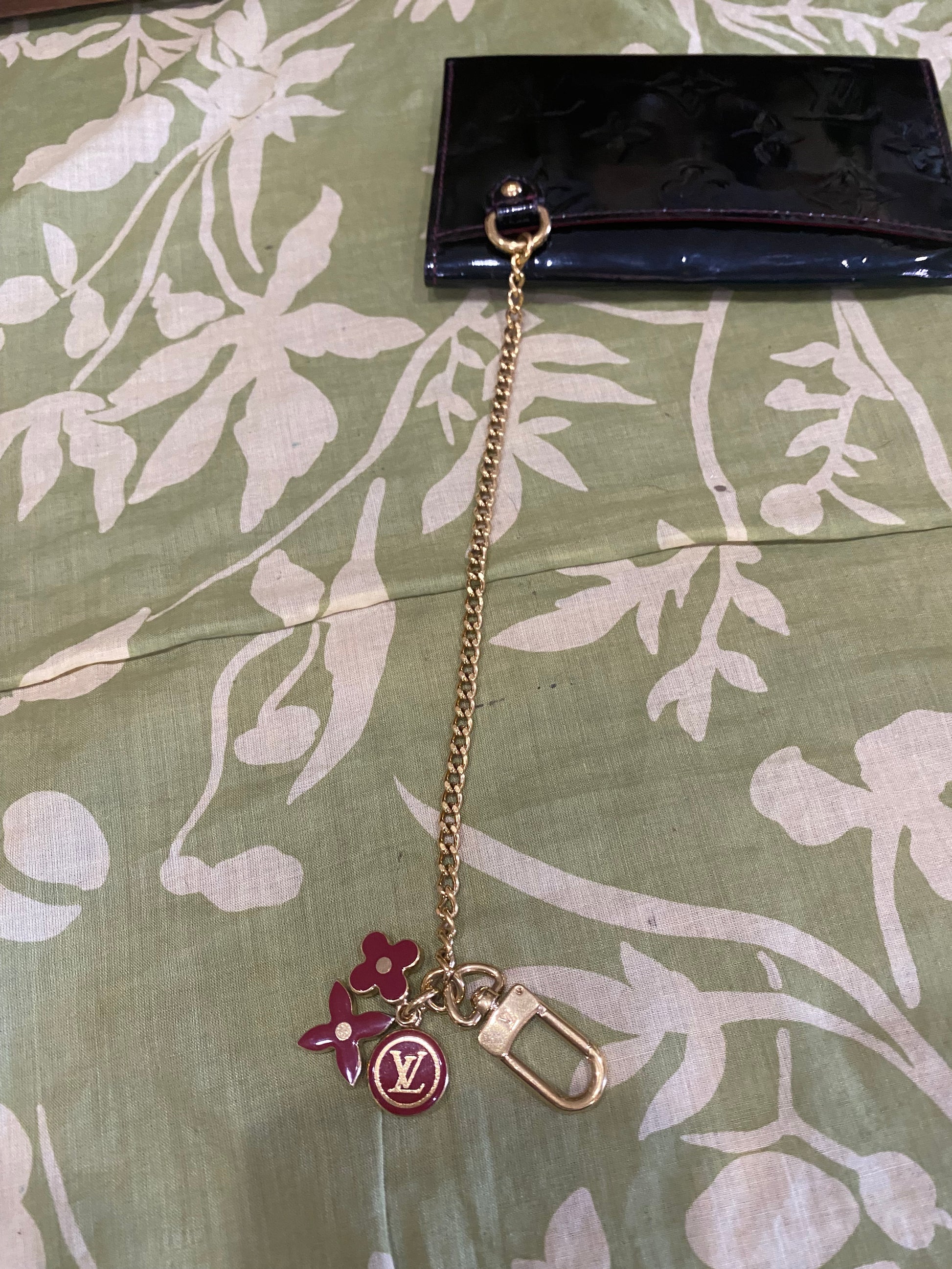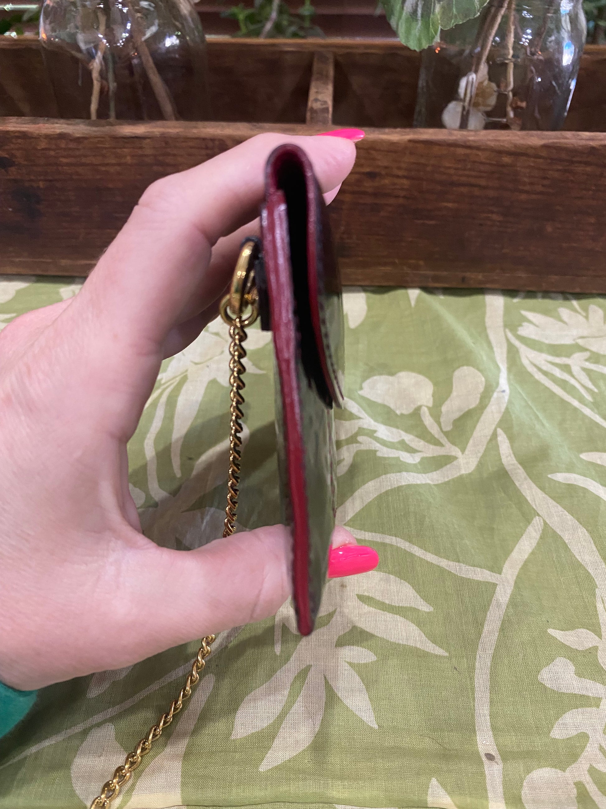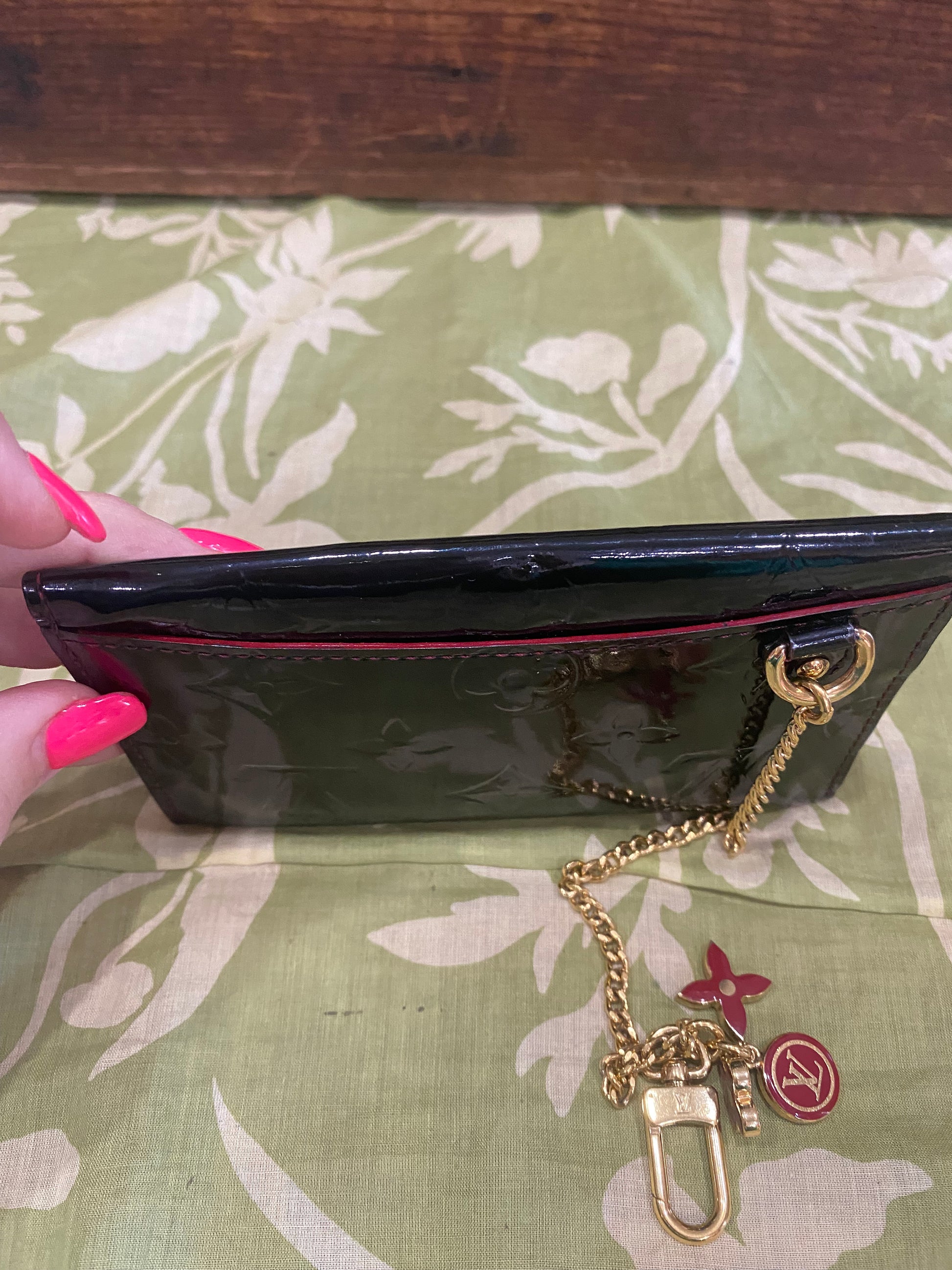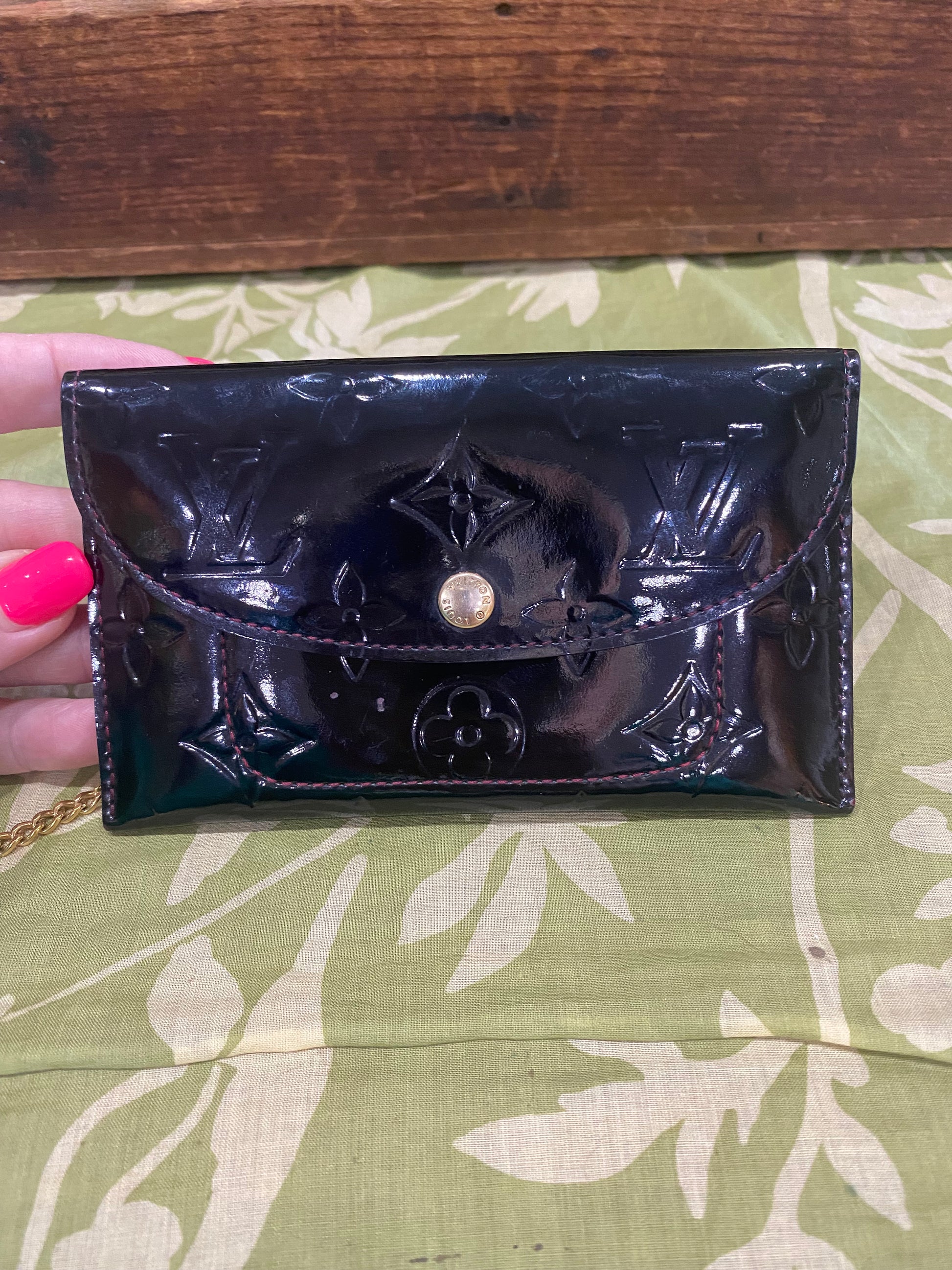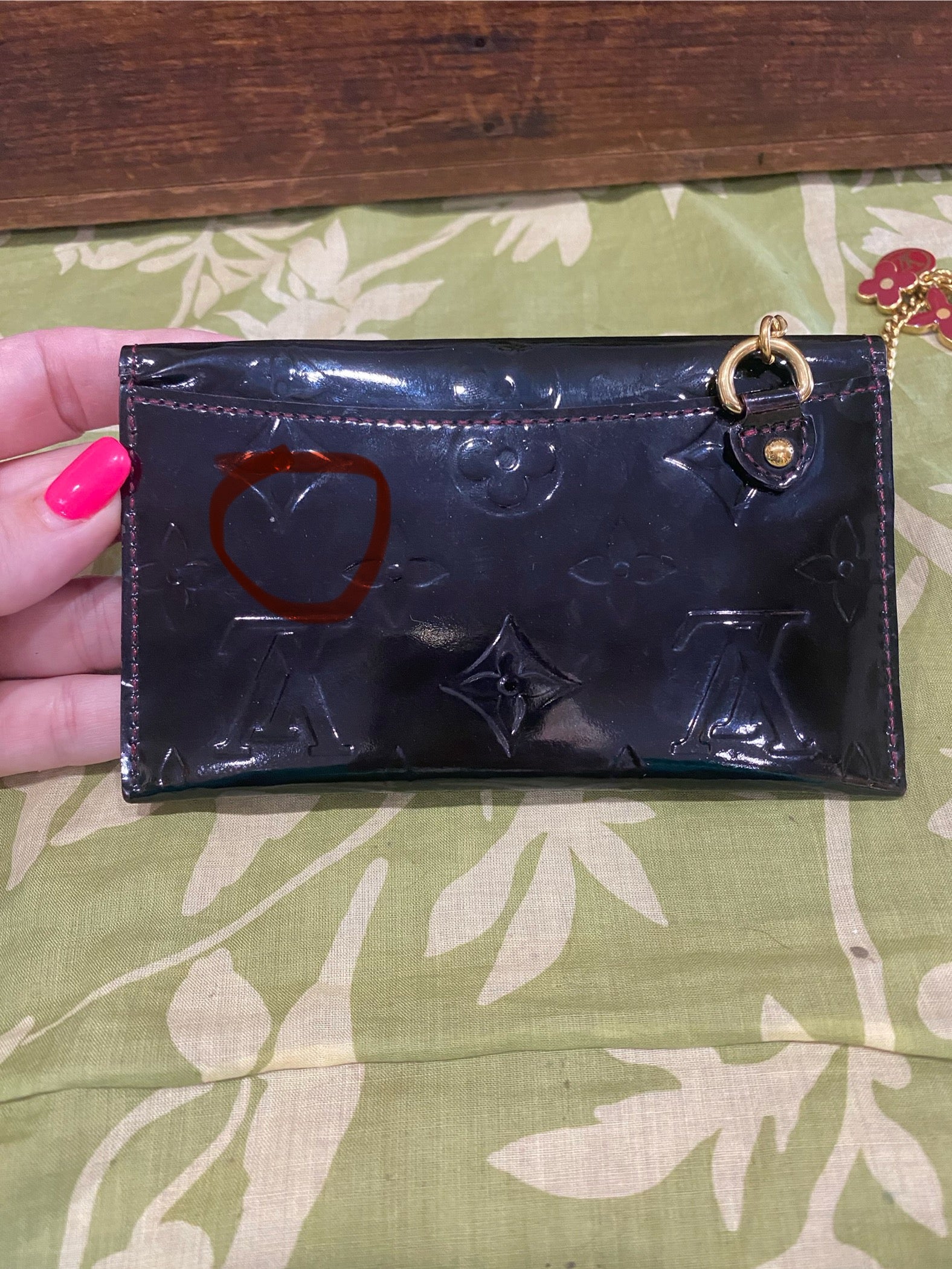 Vernis leather is free of cracking or tears, vernis leather has a few light marks/stains, snap is secure, snap has some metal discoloration, glazing is intact and scuff free, chain and charms are shiny, interior has black staining along the top stitching, no foul smells. Comes with dust cover.