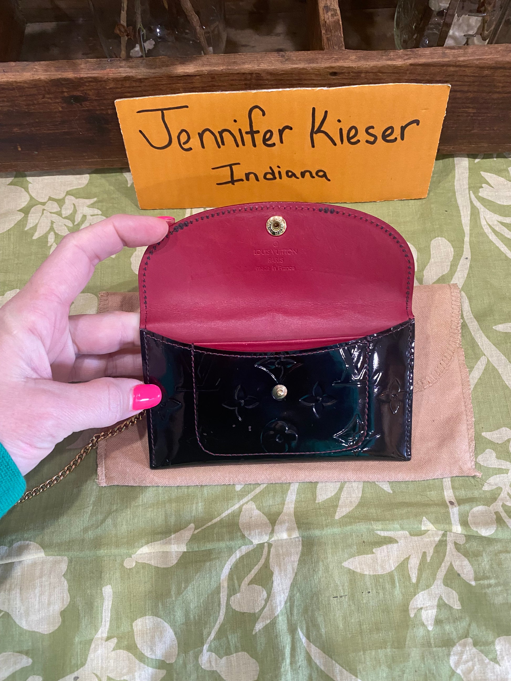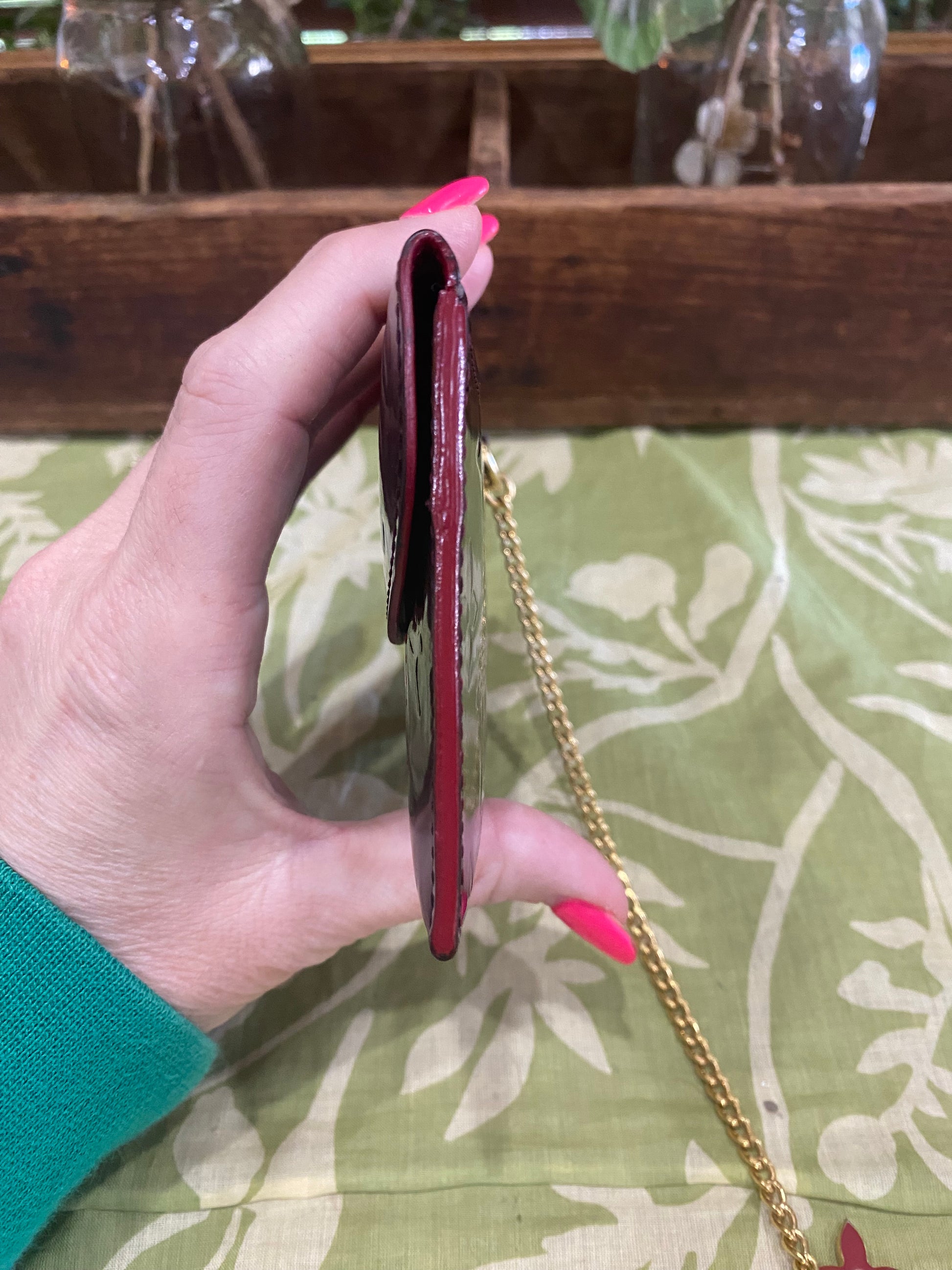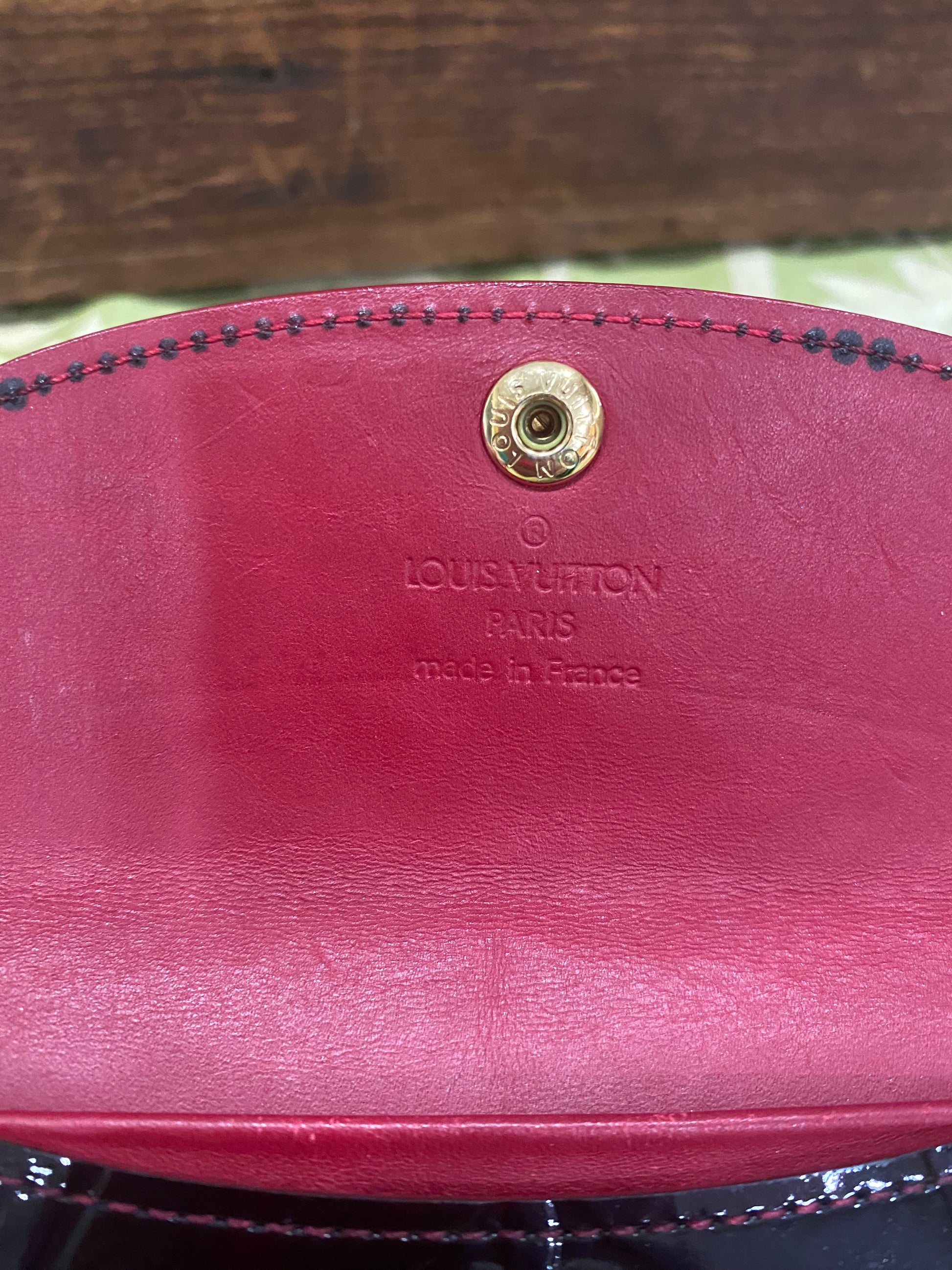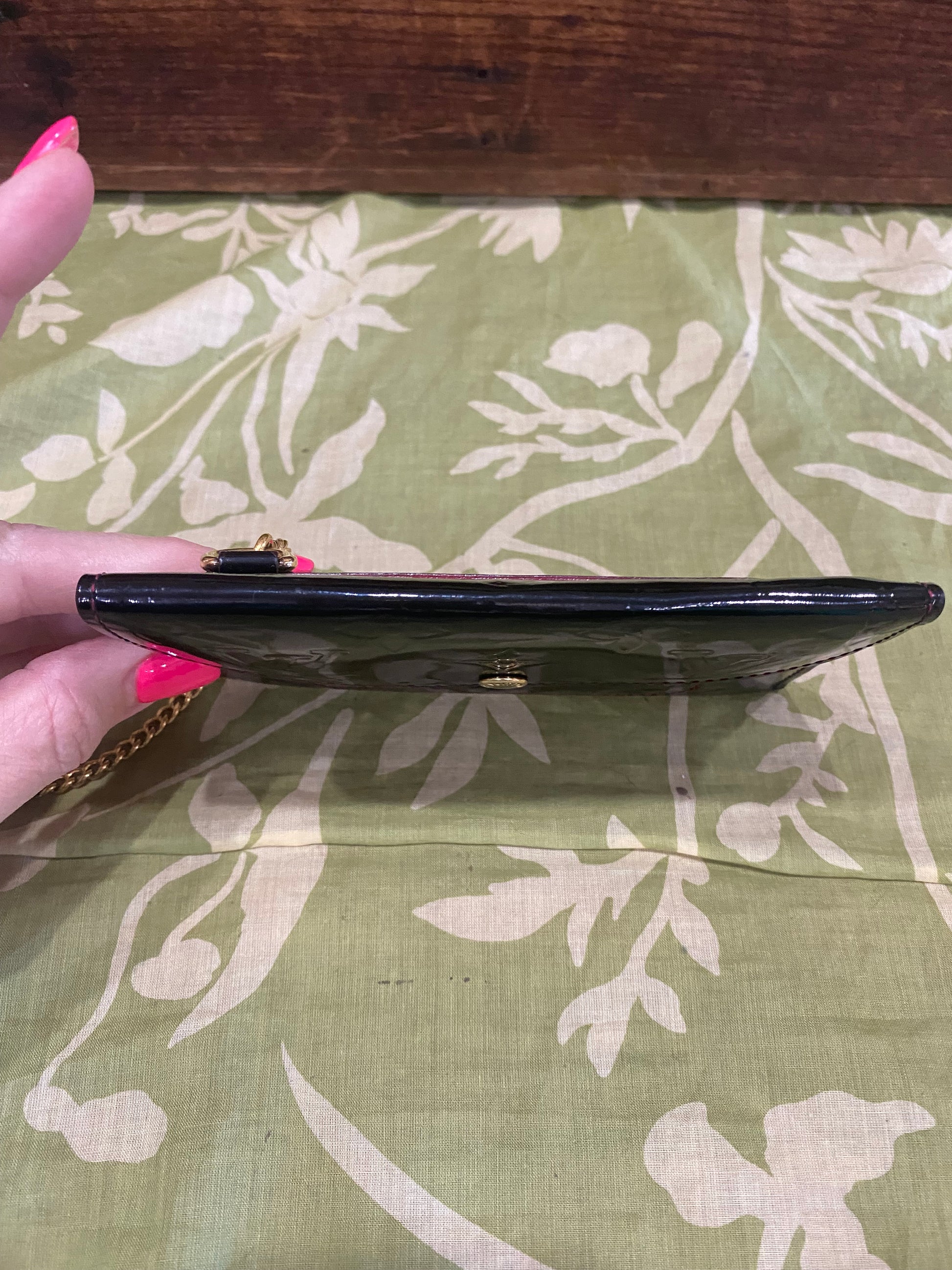 Vernis leather is free of cracking or tears, vernis leather has a few light marks/stains, snap is secure, snap has some metal discoloration, glazing is intact and scuff free, chain and charms are shiny, interior has black staining along the top stitching, no foul smells. Comes with dust cover.
