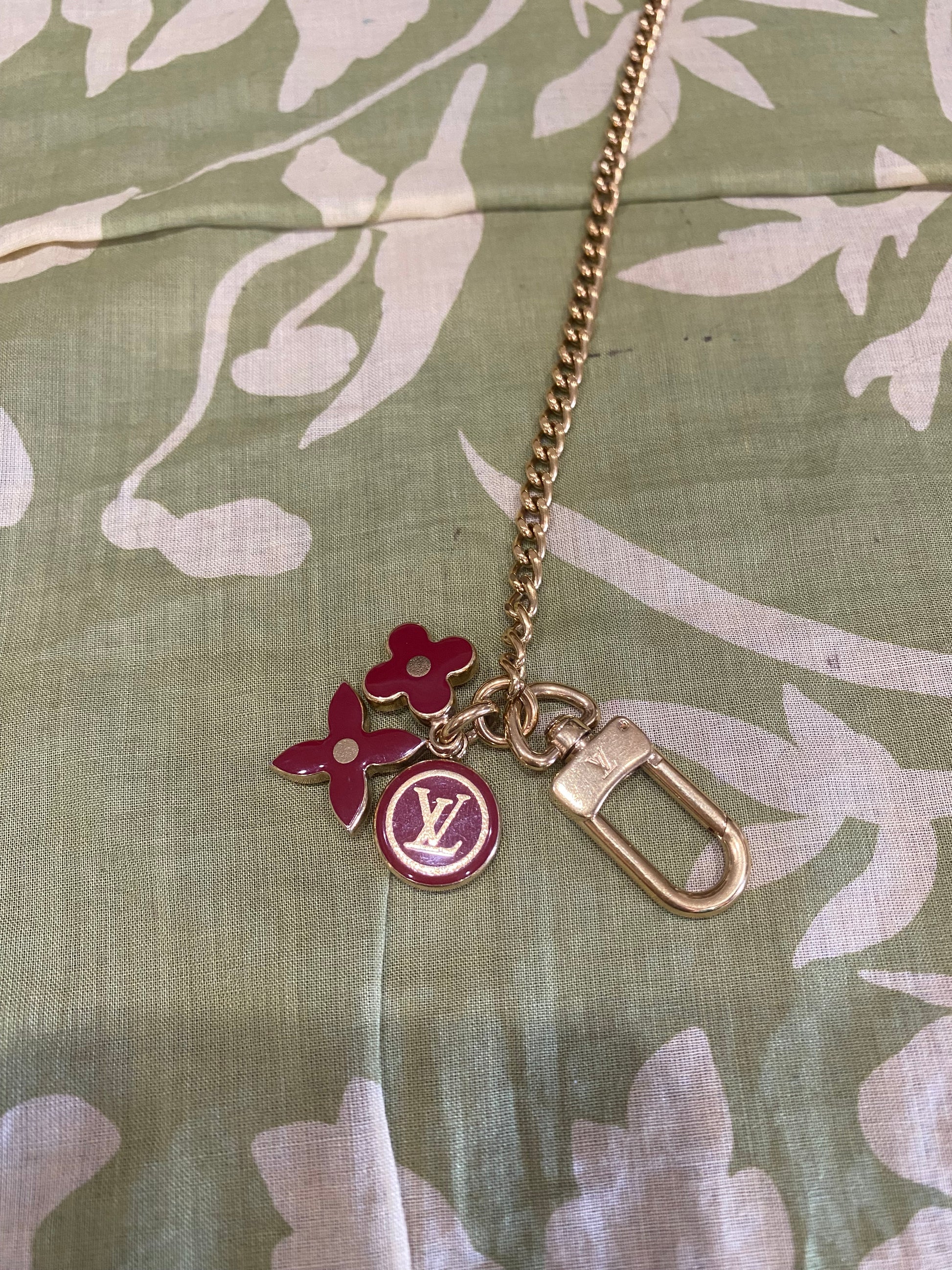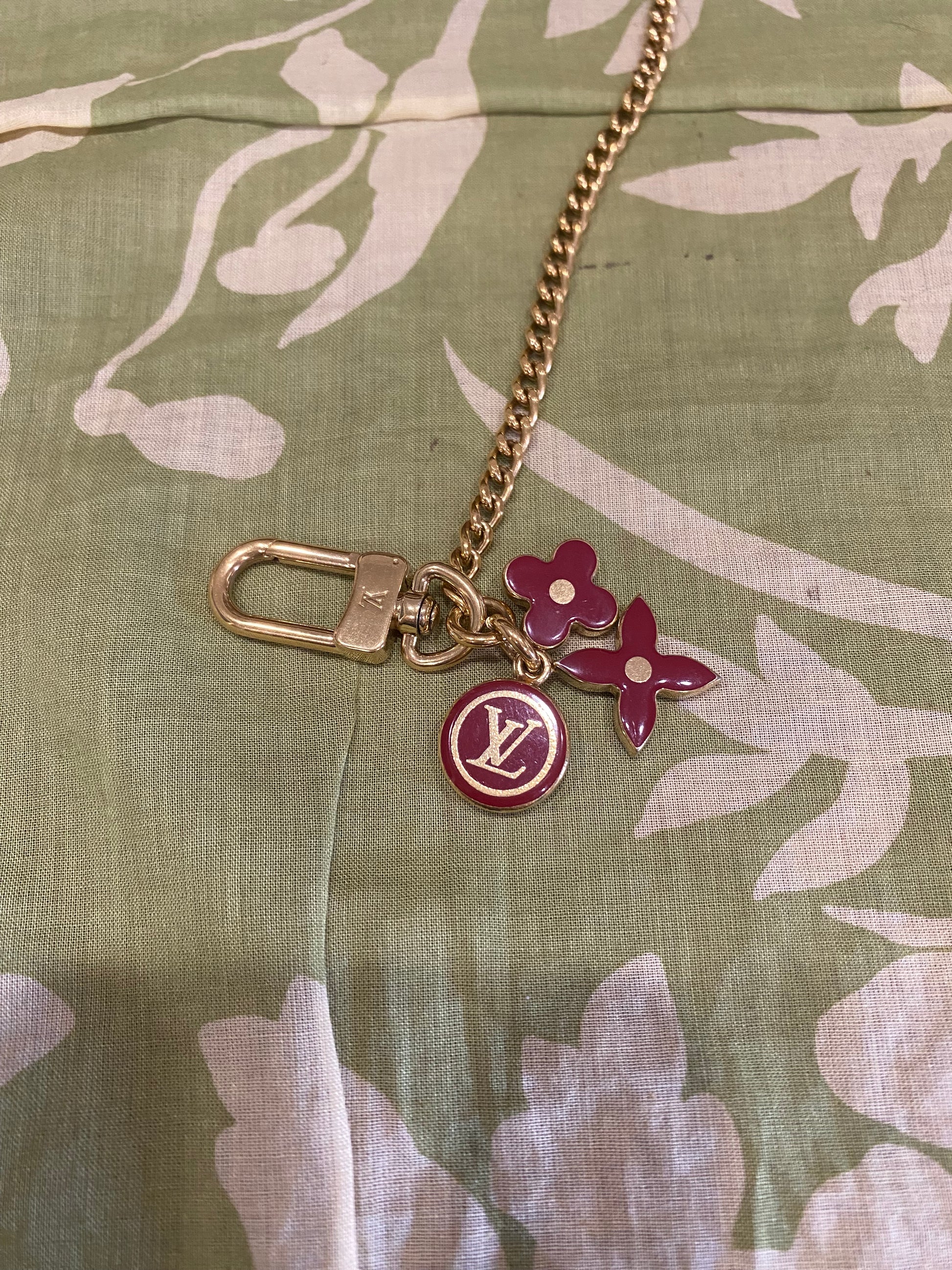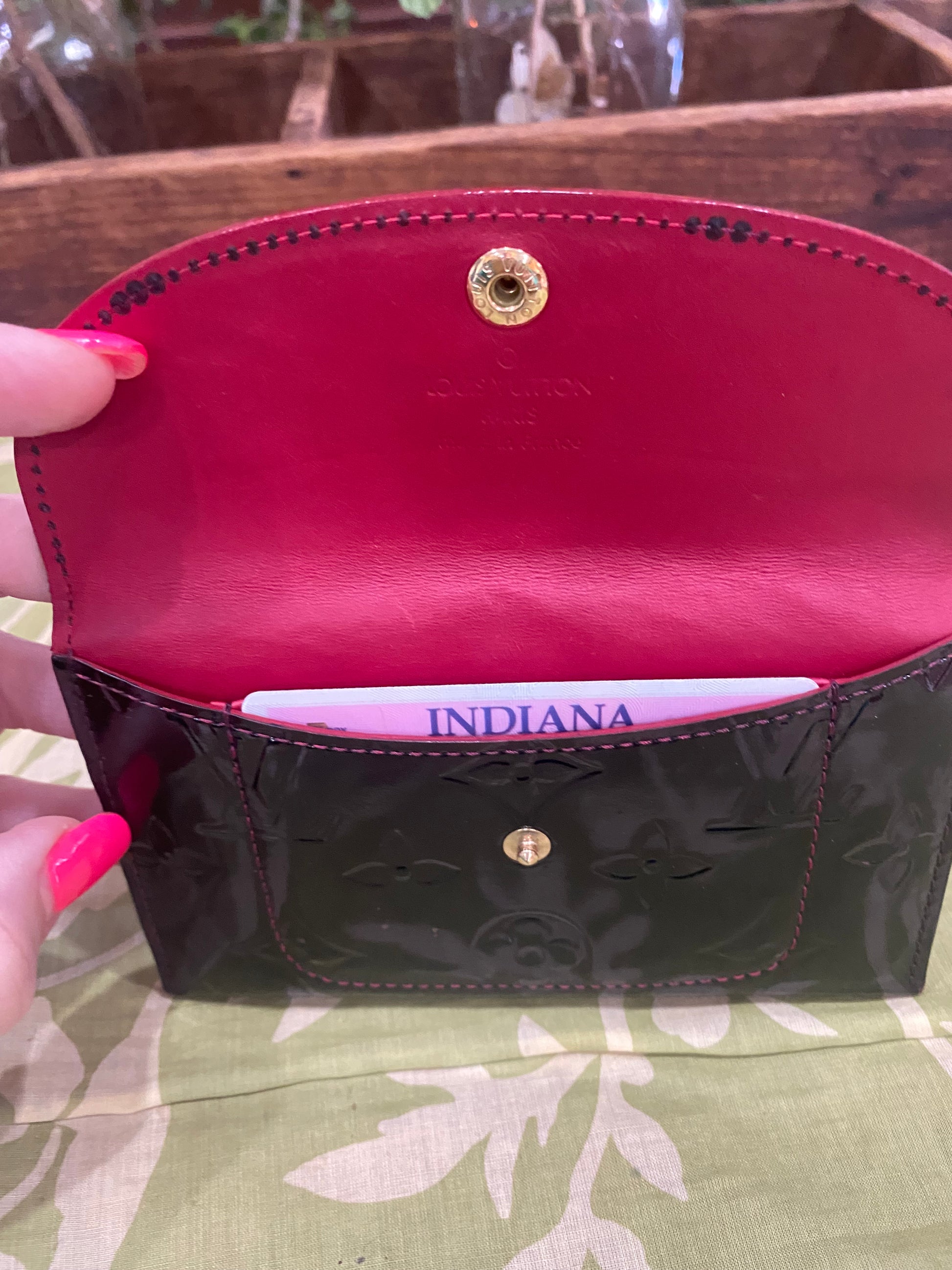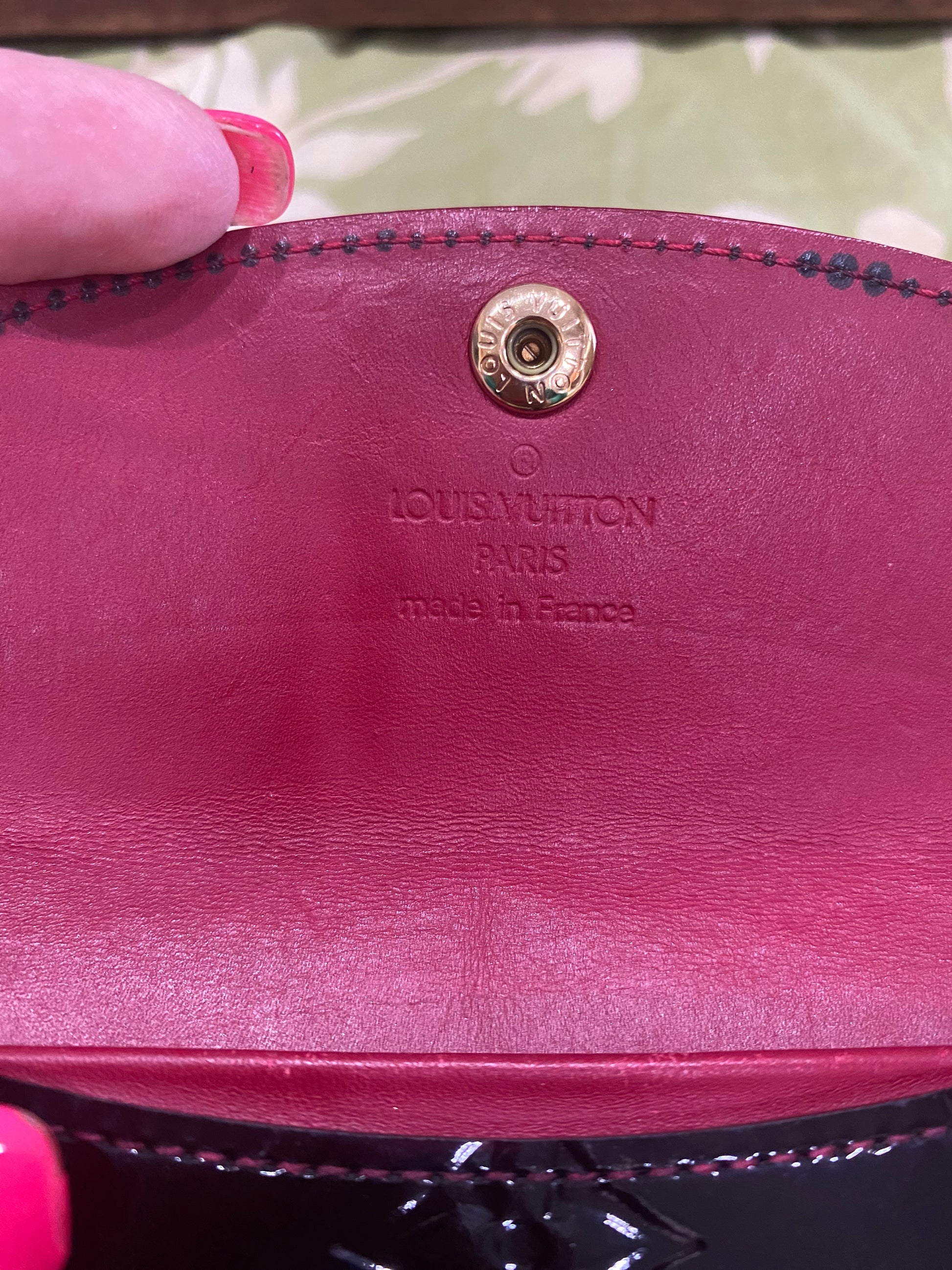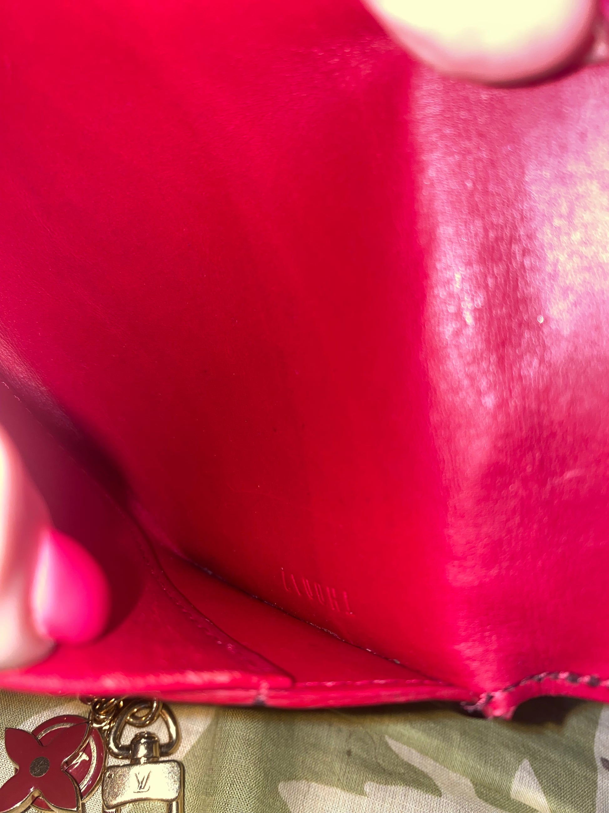 Vernis leather is free of cracking or tears, vernis leather has a few light marks/stains, snap is secure, snap has some metal discoloration, glazing is intact and scuff free, chain and charms are shiny, interior has black staining along the top stitching, no foul smells. Comes with dust cover.