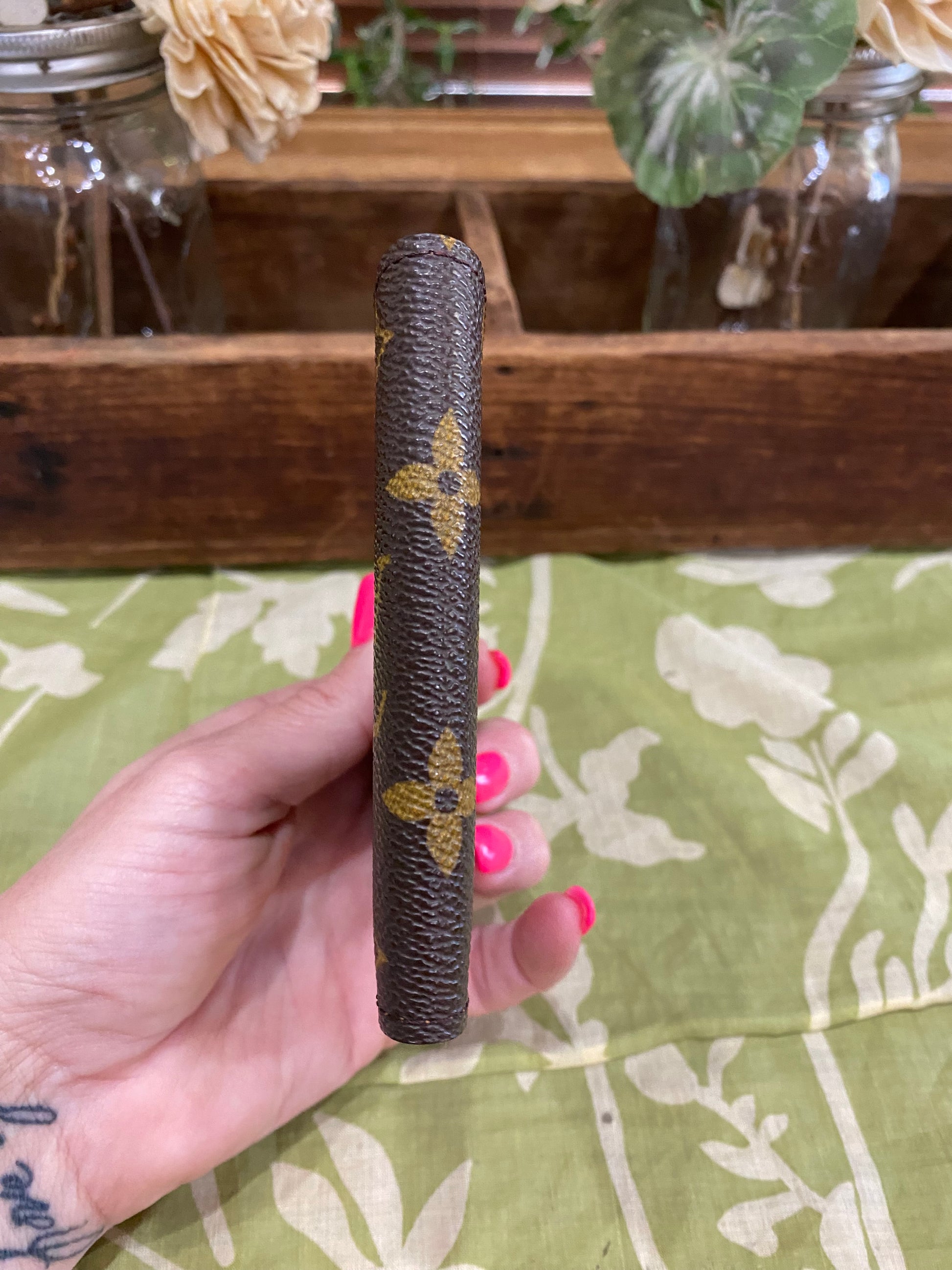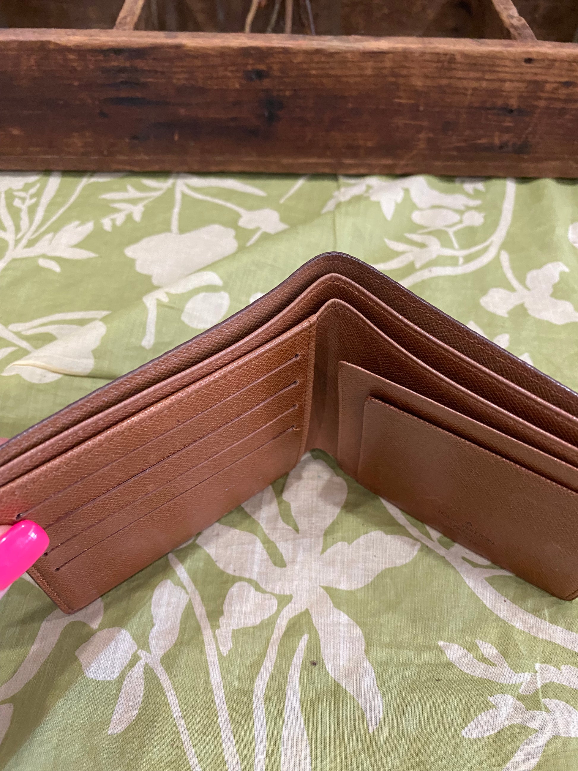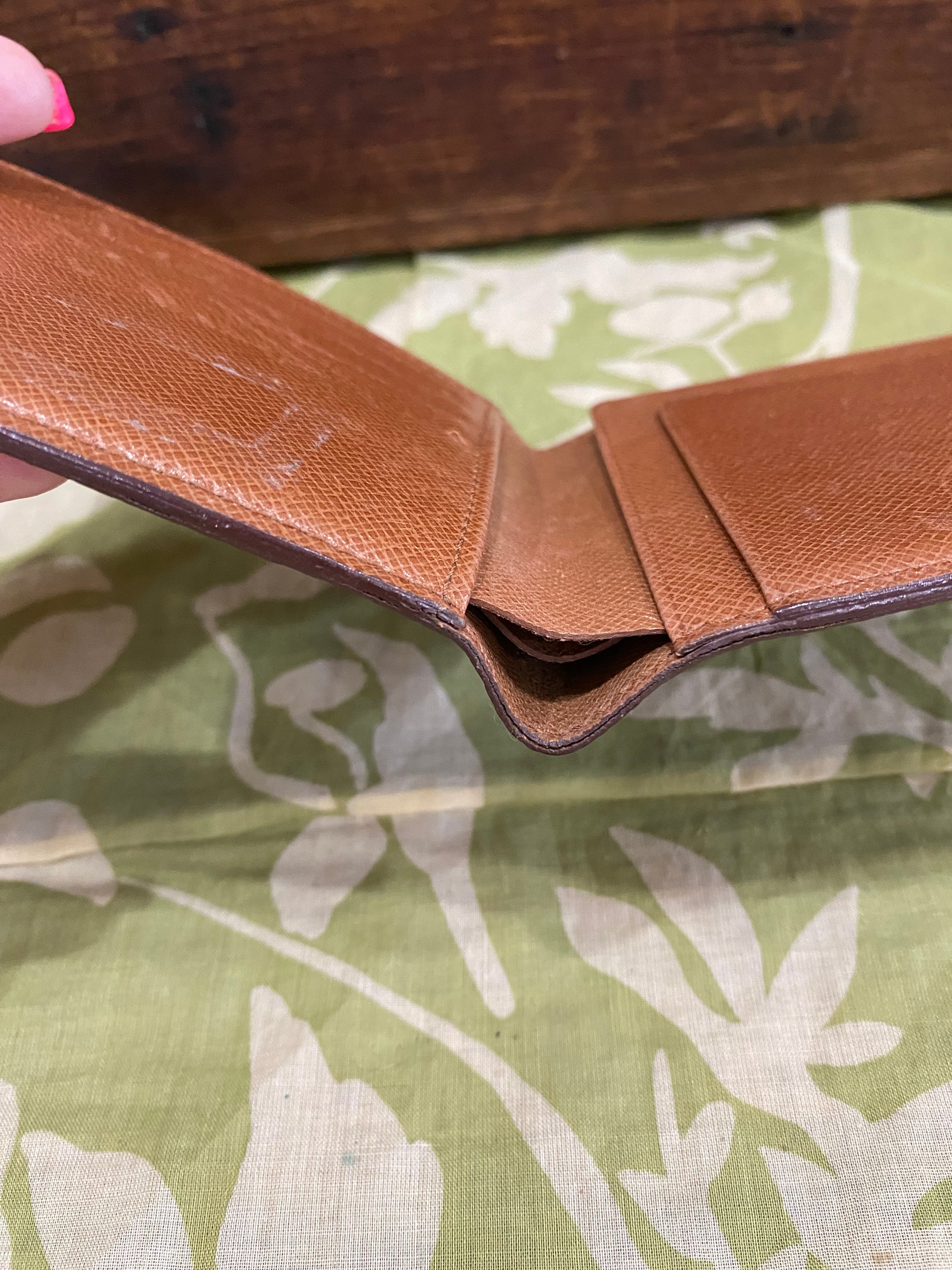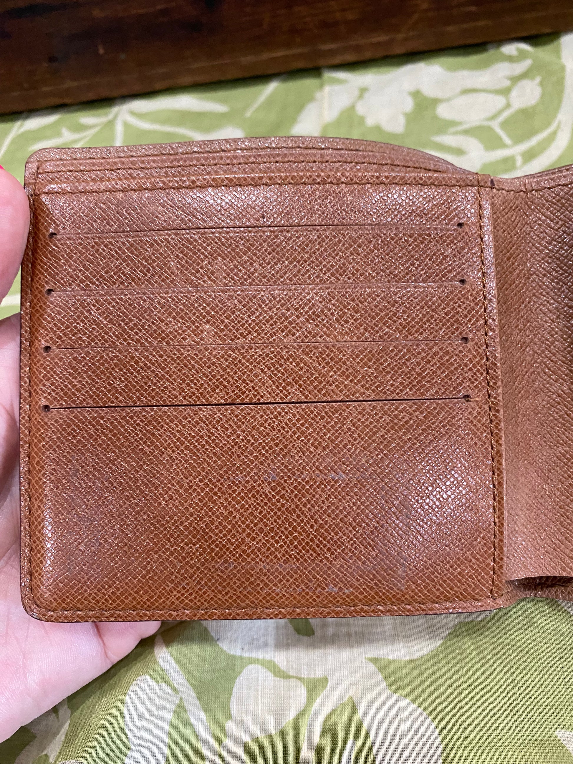 Canvas is free of cracking or tears, print is vibrant, glazing has some rubs/separation, interior has fading/scuffs/marks/bill compartments have dry peeling- no tackiness, no foul smells. Comes with vintage box.