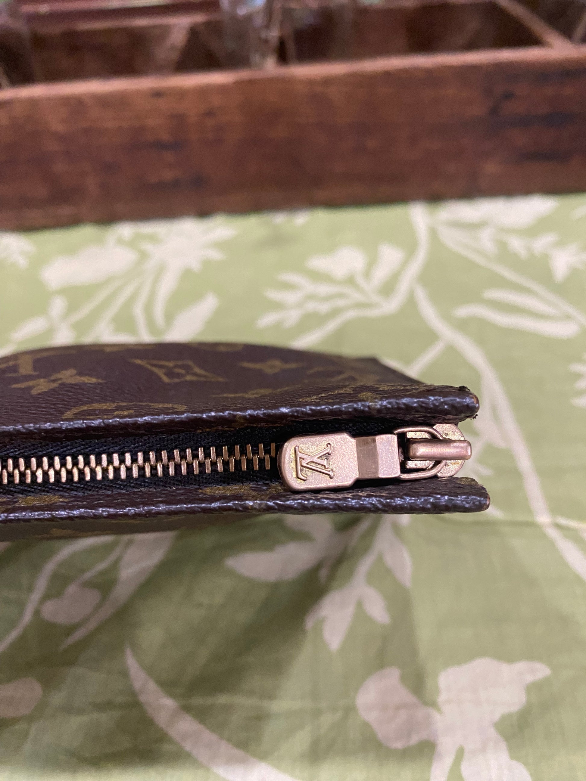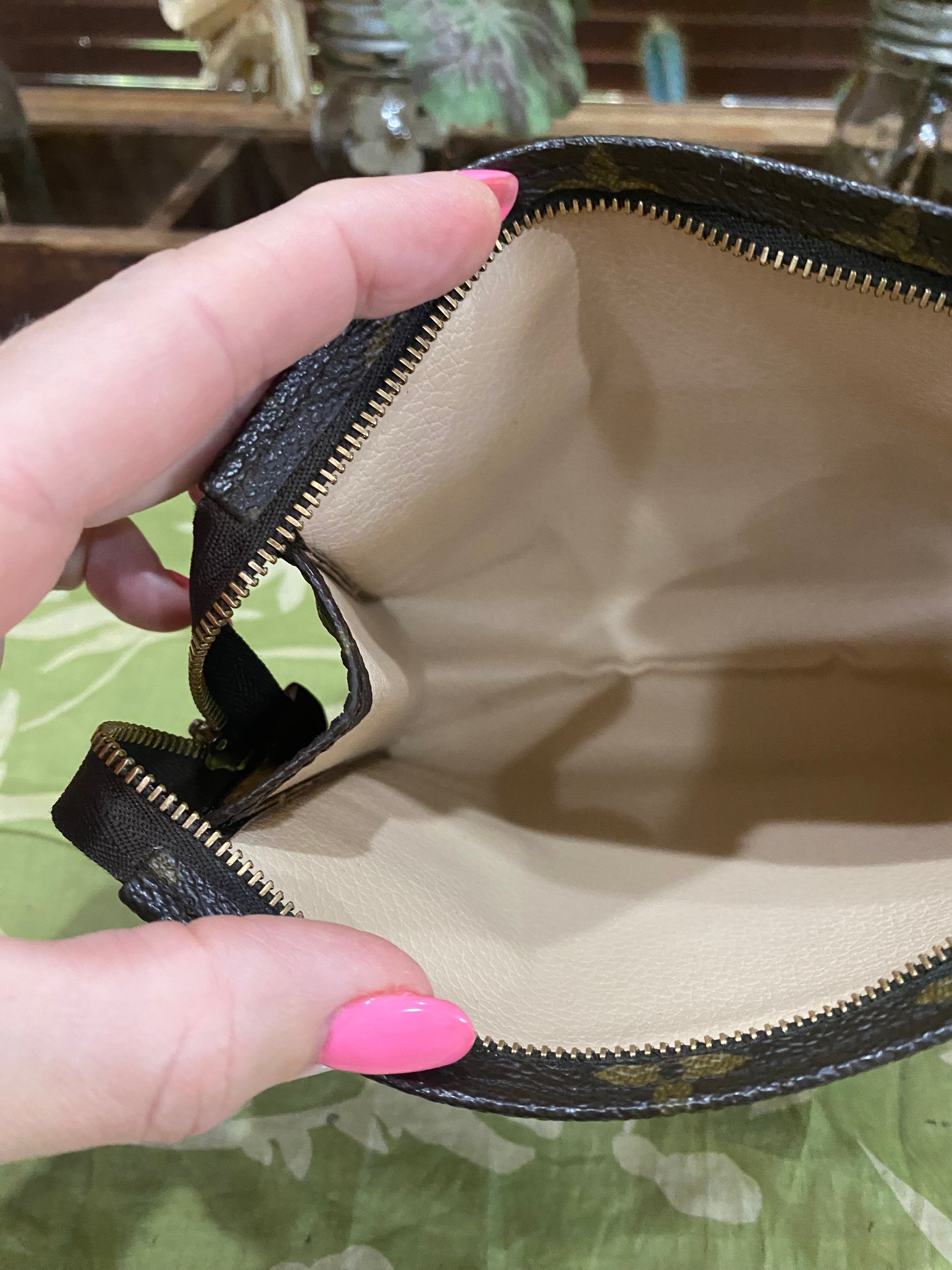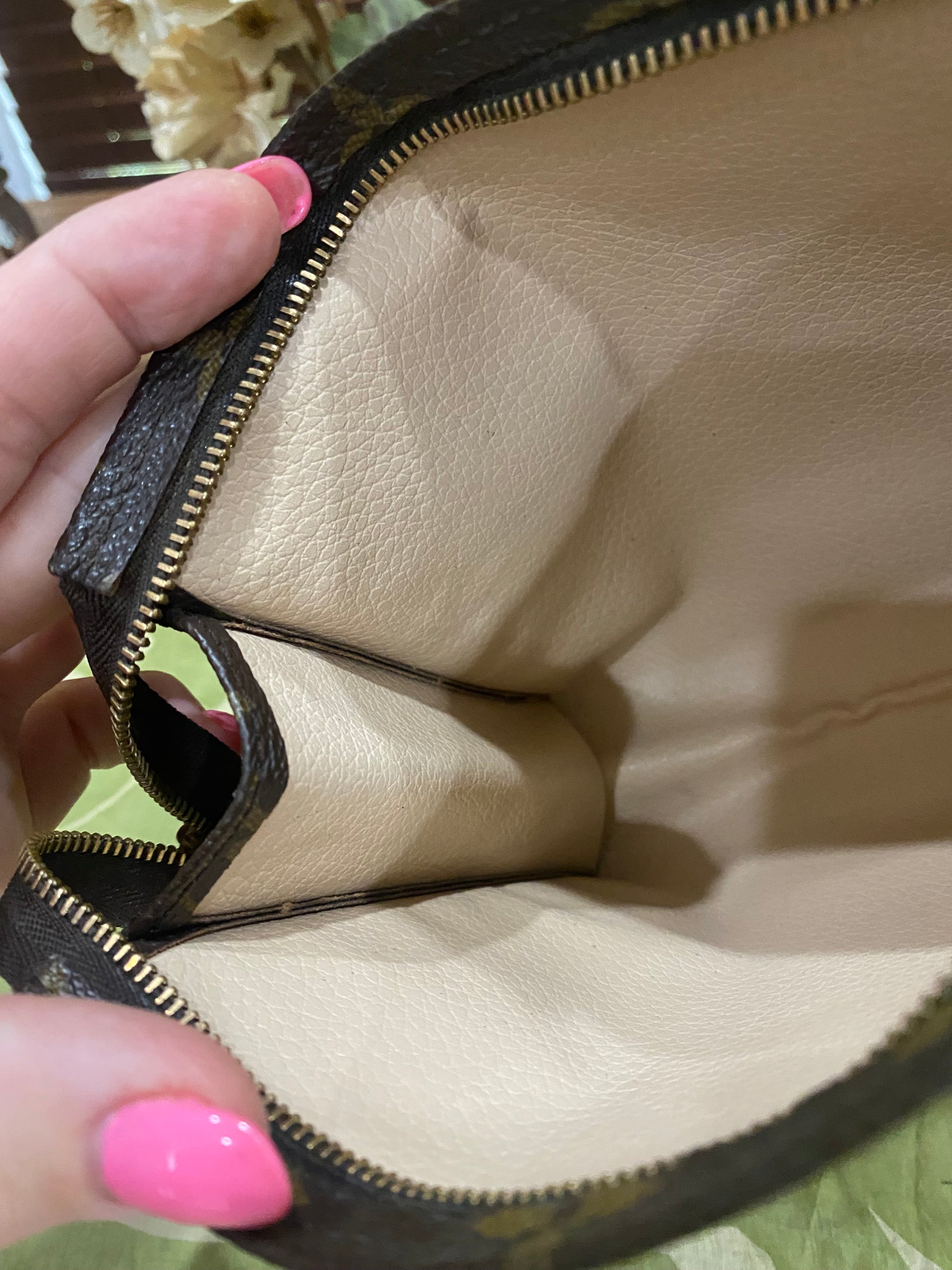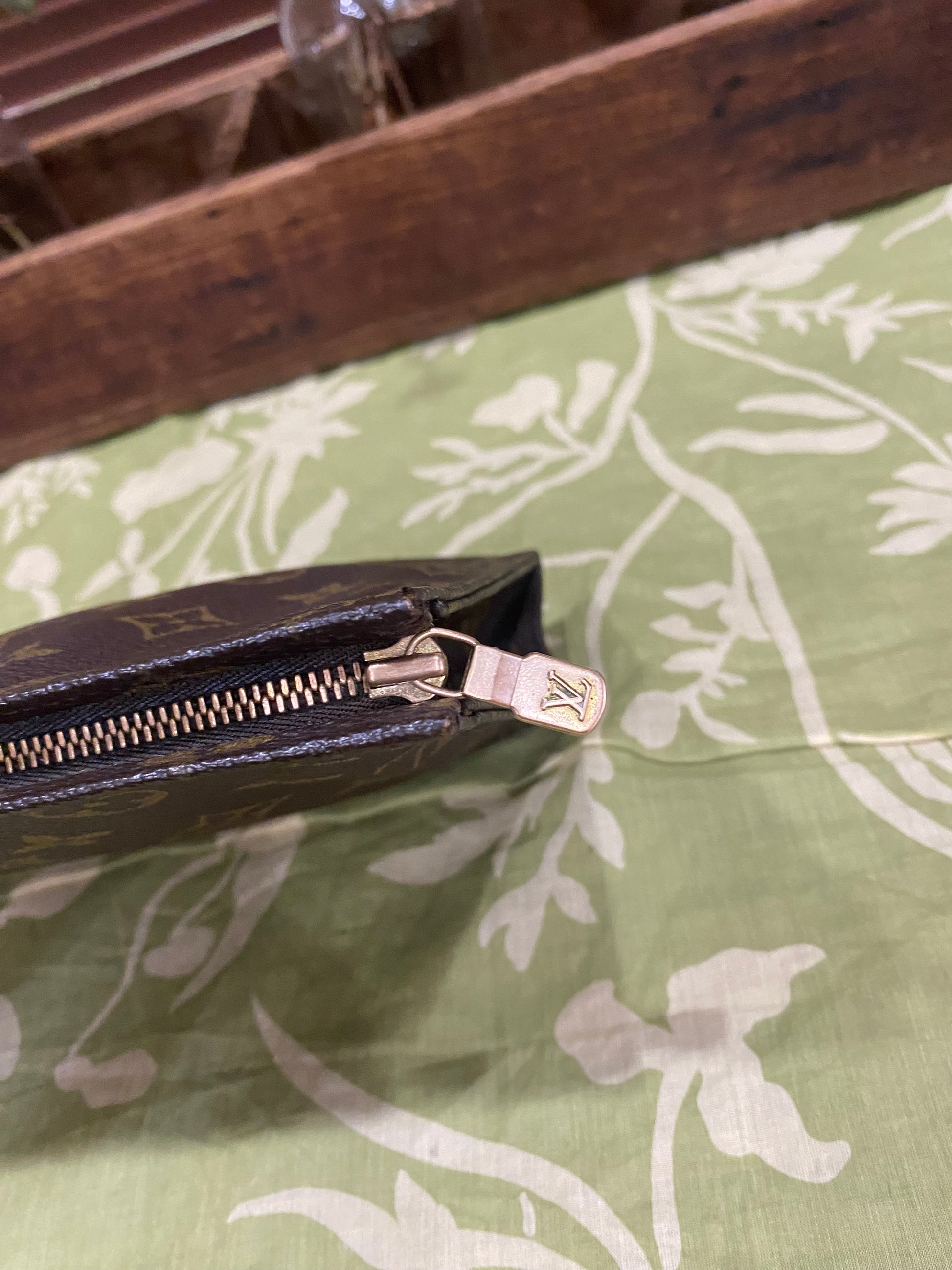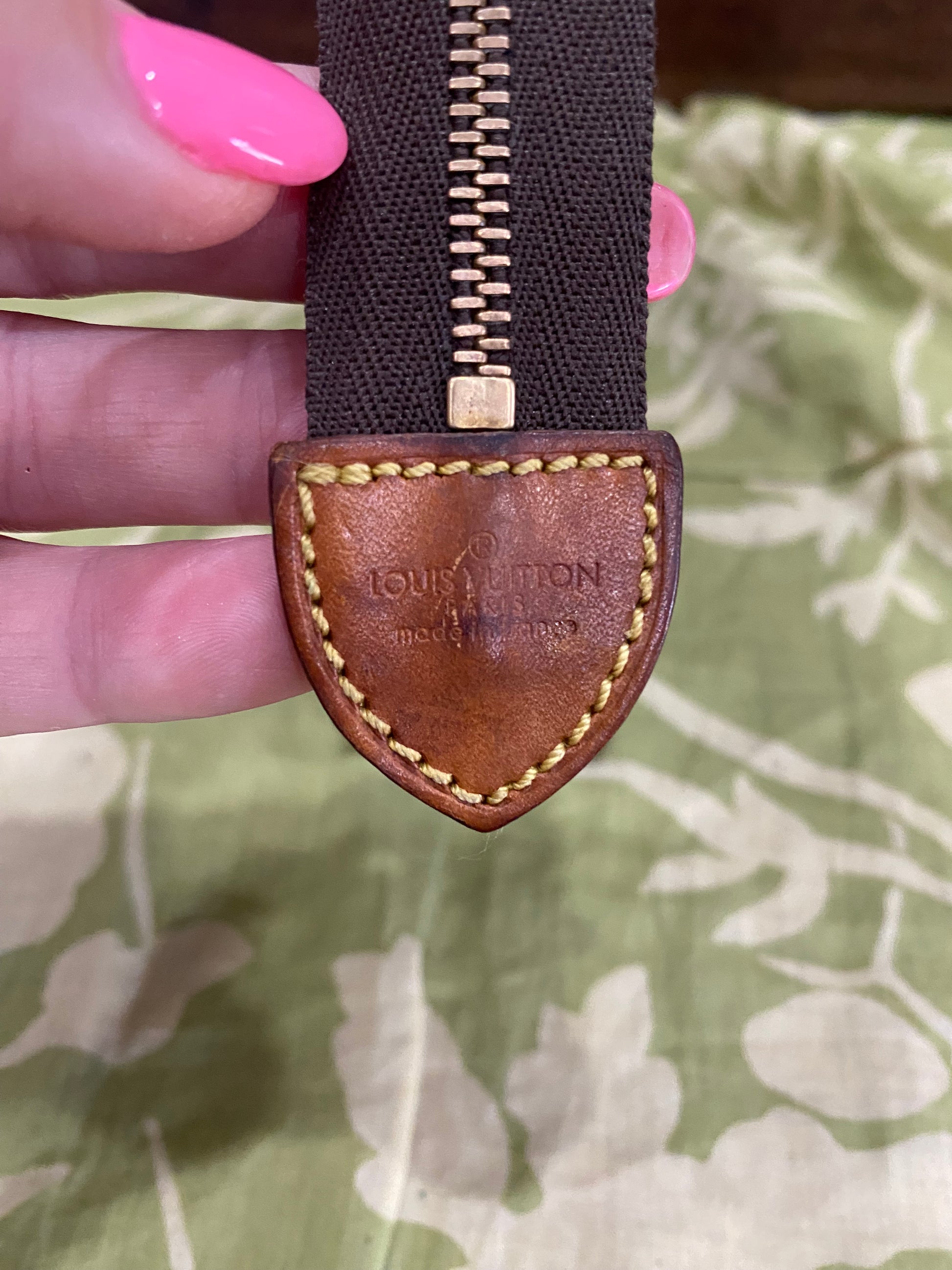 Canvas is free of cracking or tears, print is bright, zipper runs smooth, zipper has tarnish/metal discoloration, leather end tab is a darker patina and has dirt, interior shows signs of normal light use- no peeling or stickiness, no foul smells.