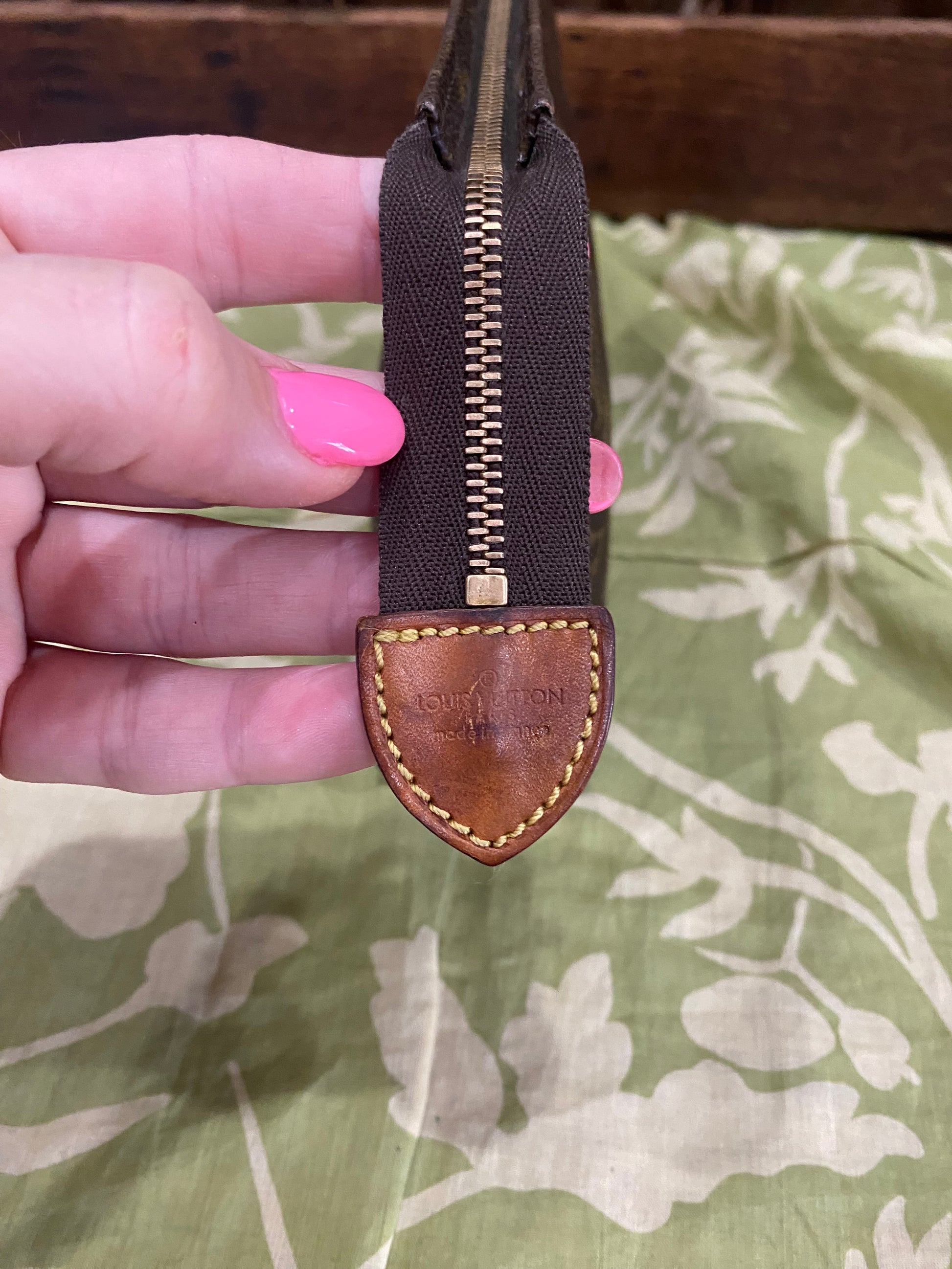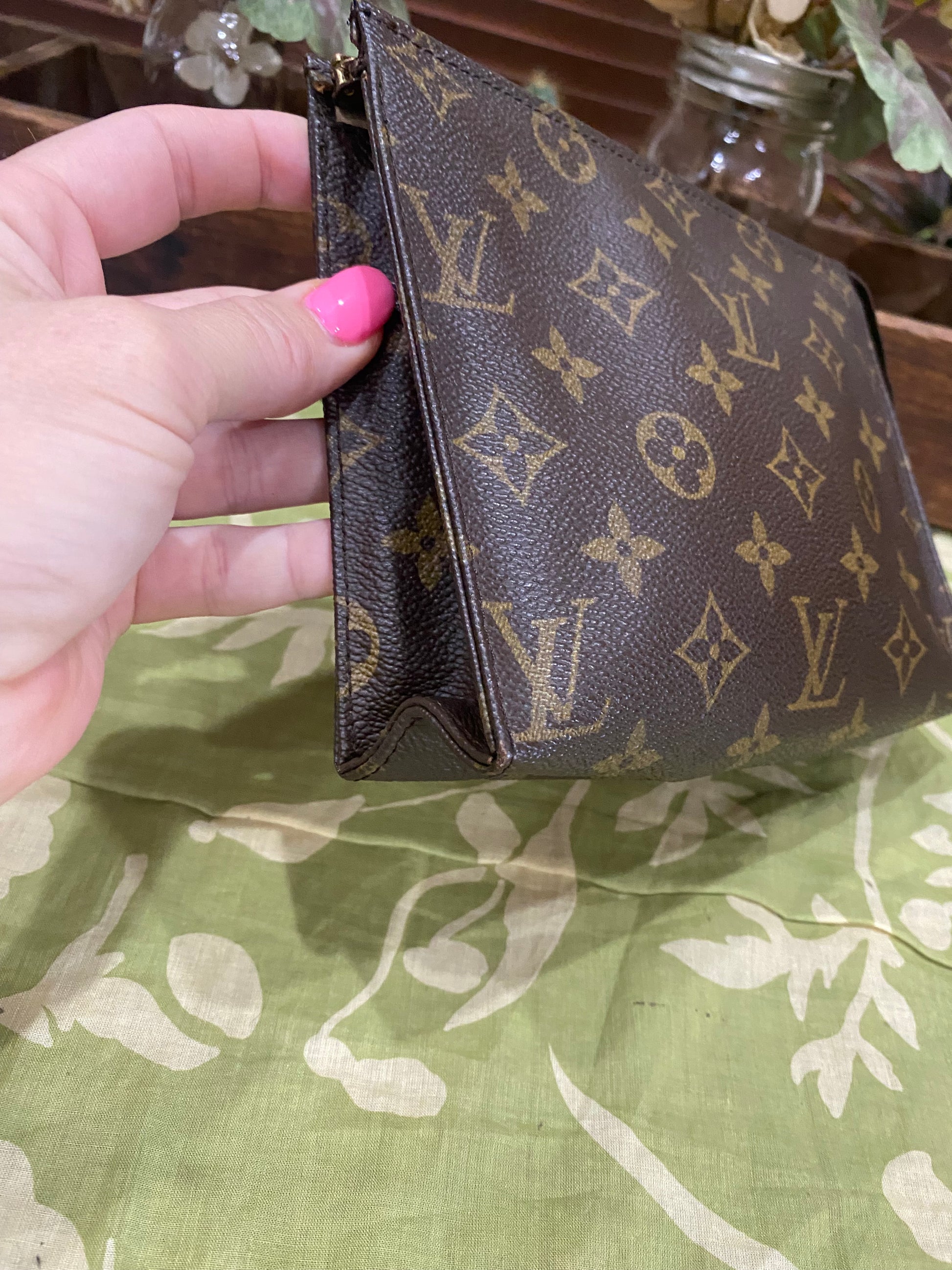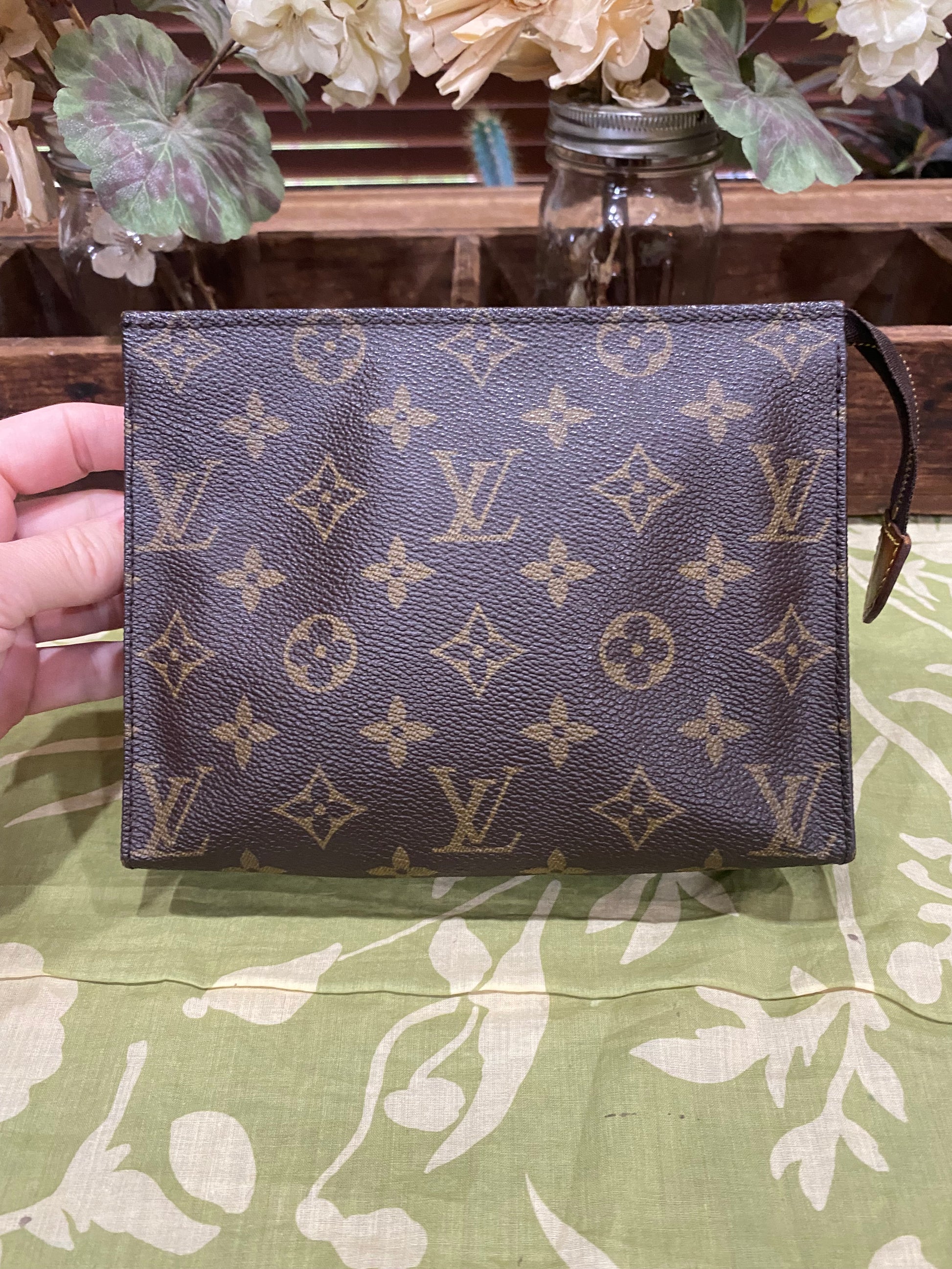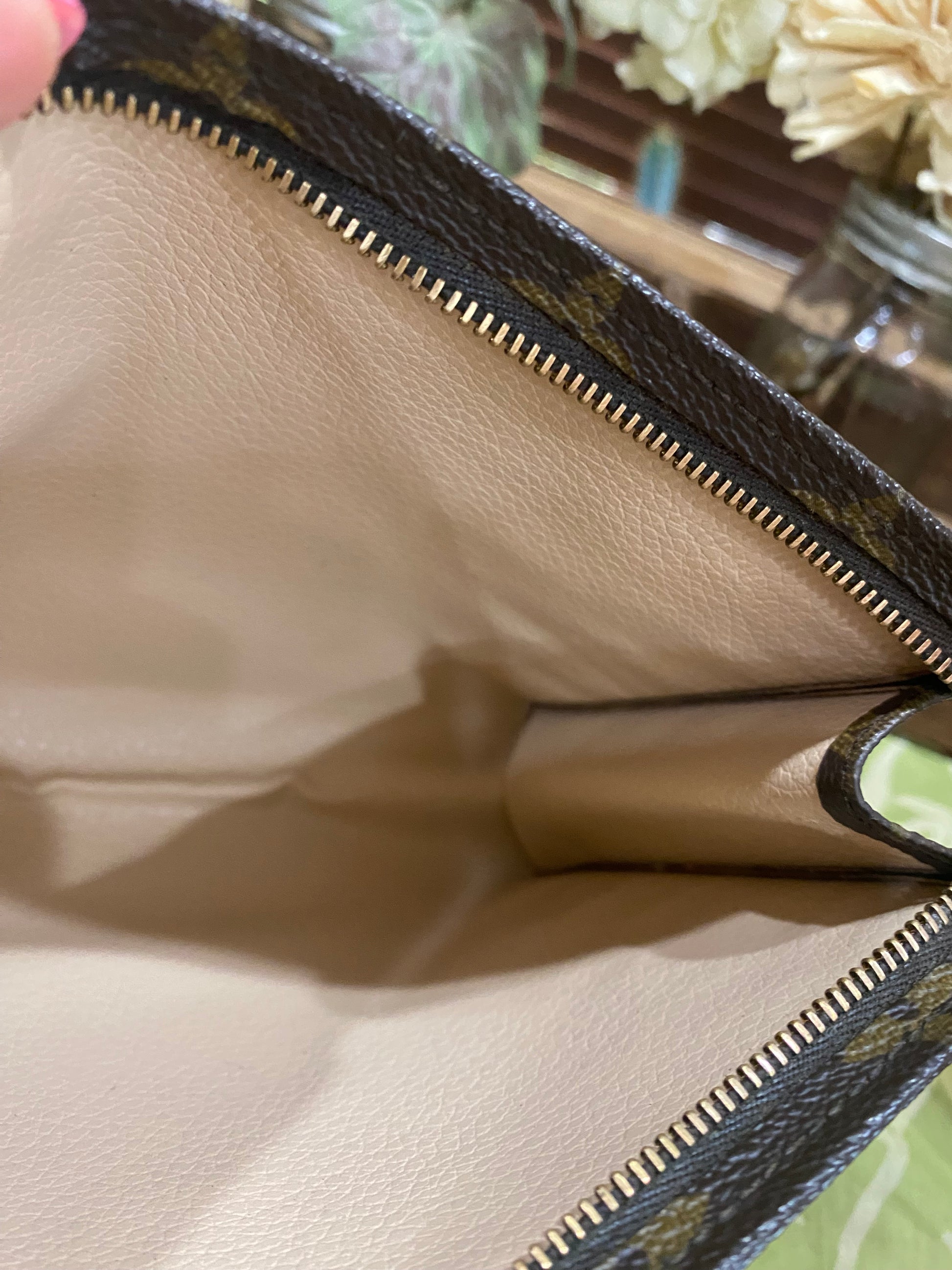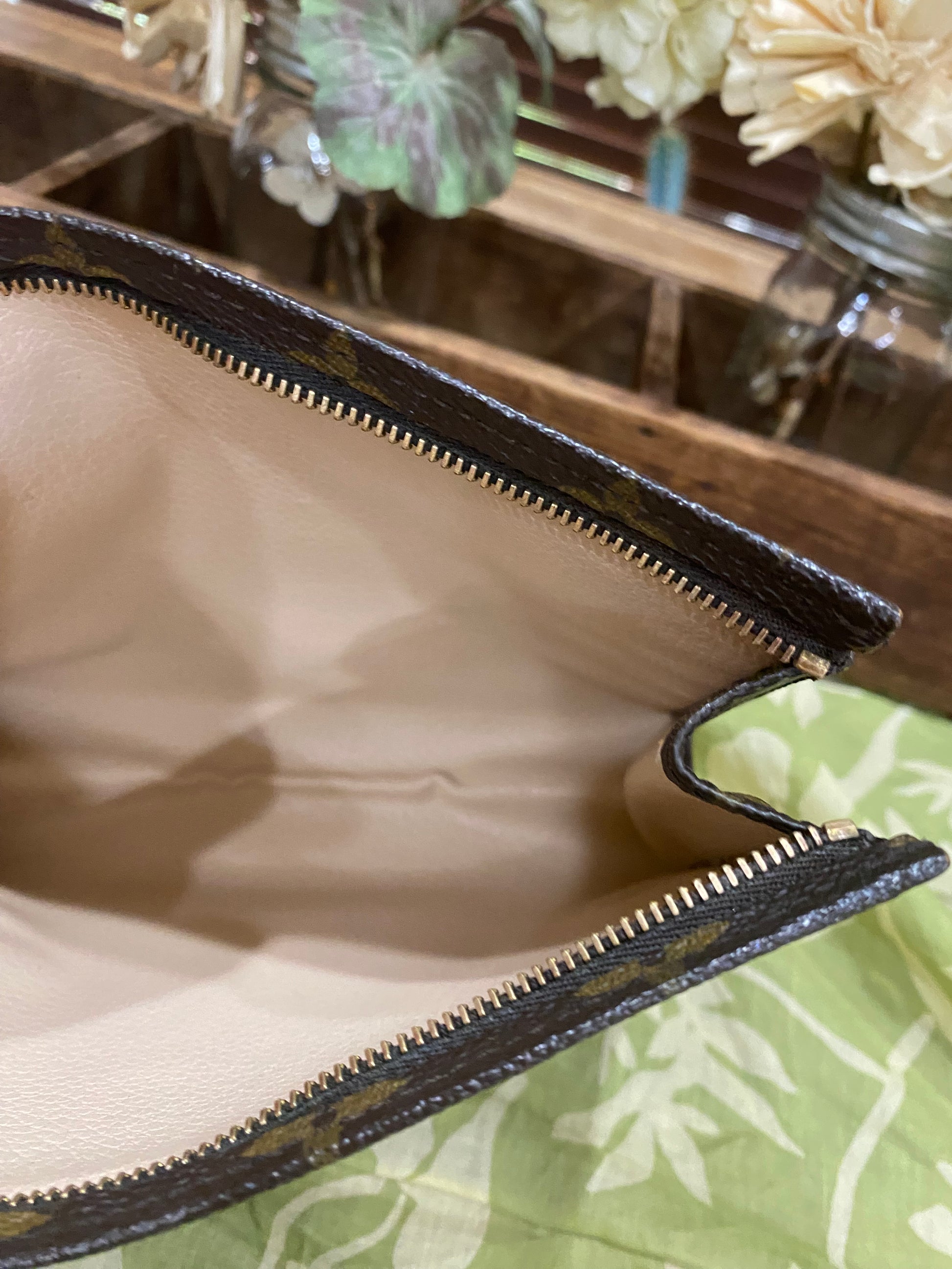 Canvas is free of cracking or tears, print is bright, zipper runs smooth, zipper has tarnish/metal discoloration, leather end tab is a darker patina and has dirt, interior shows signs of normal light use- no peeling or stickiness, no foul smells.