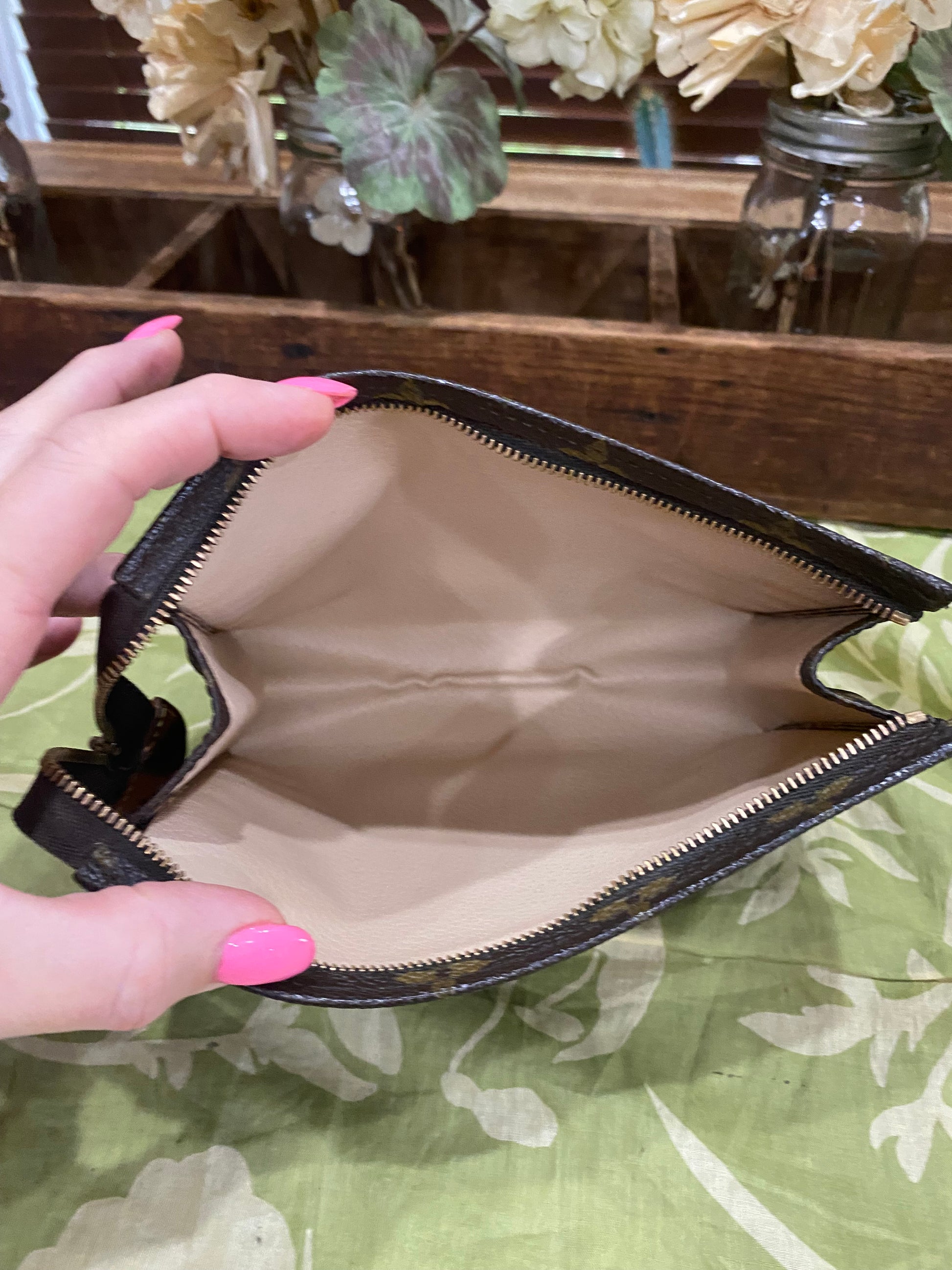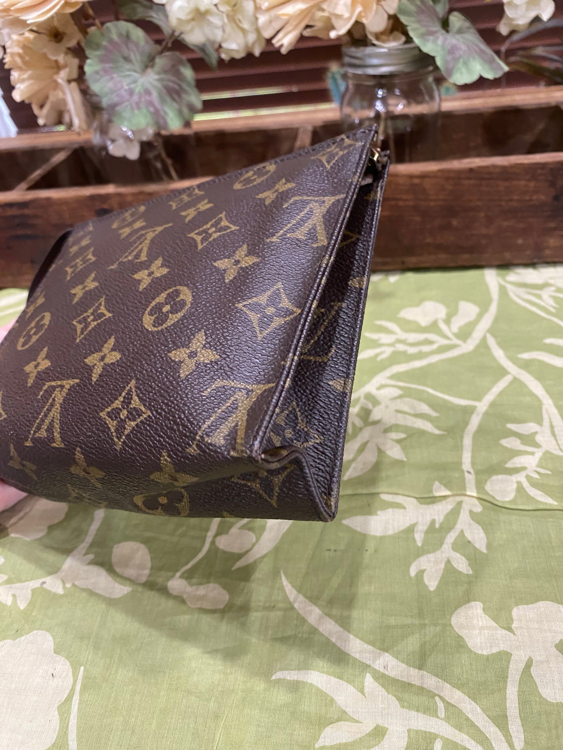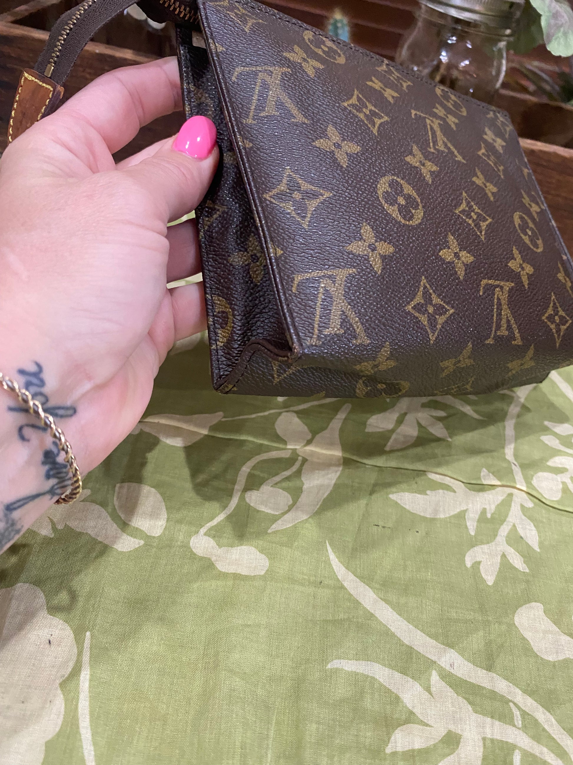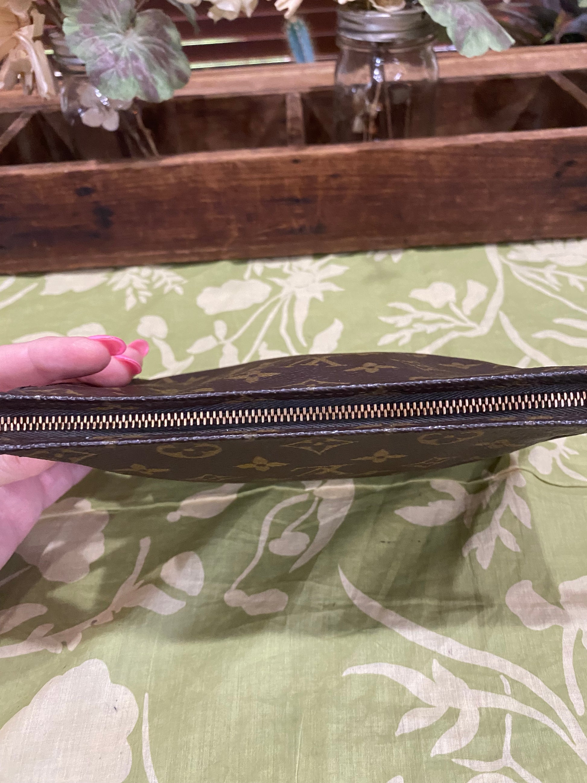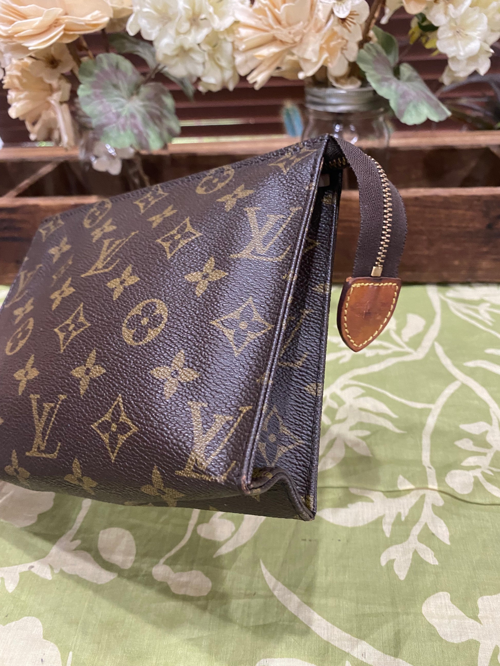 Canvas is free of cracking or tears, print is bright, zipper runs smooth, zipper has tarnish/metal discoloration, leather end tab is a darker patina and has dirt, interior shows signs of normal light use- no peeling or stickiness, no foul smells.