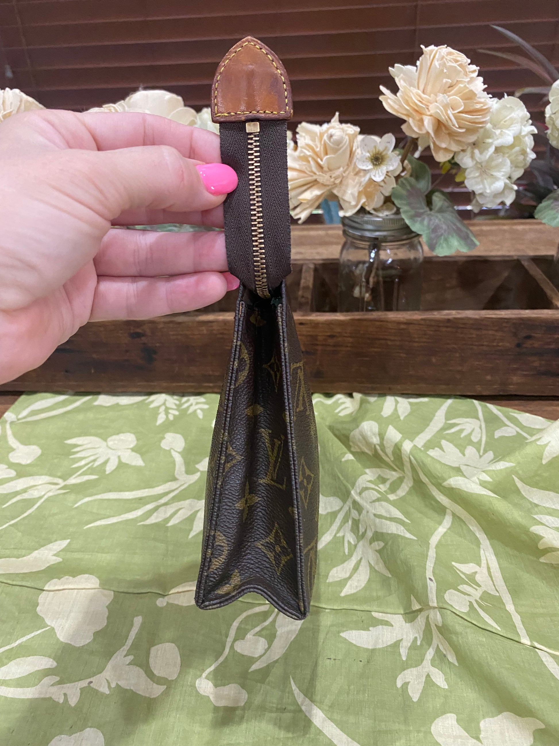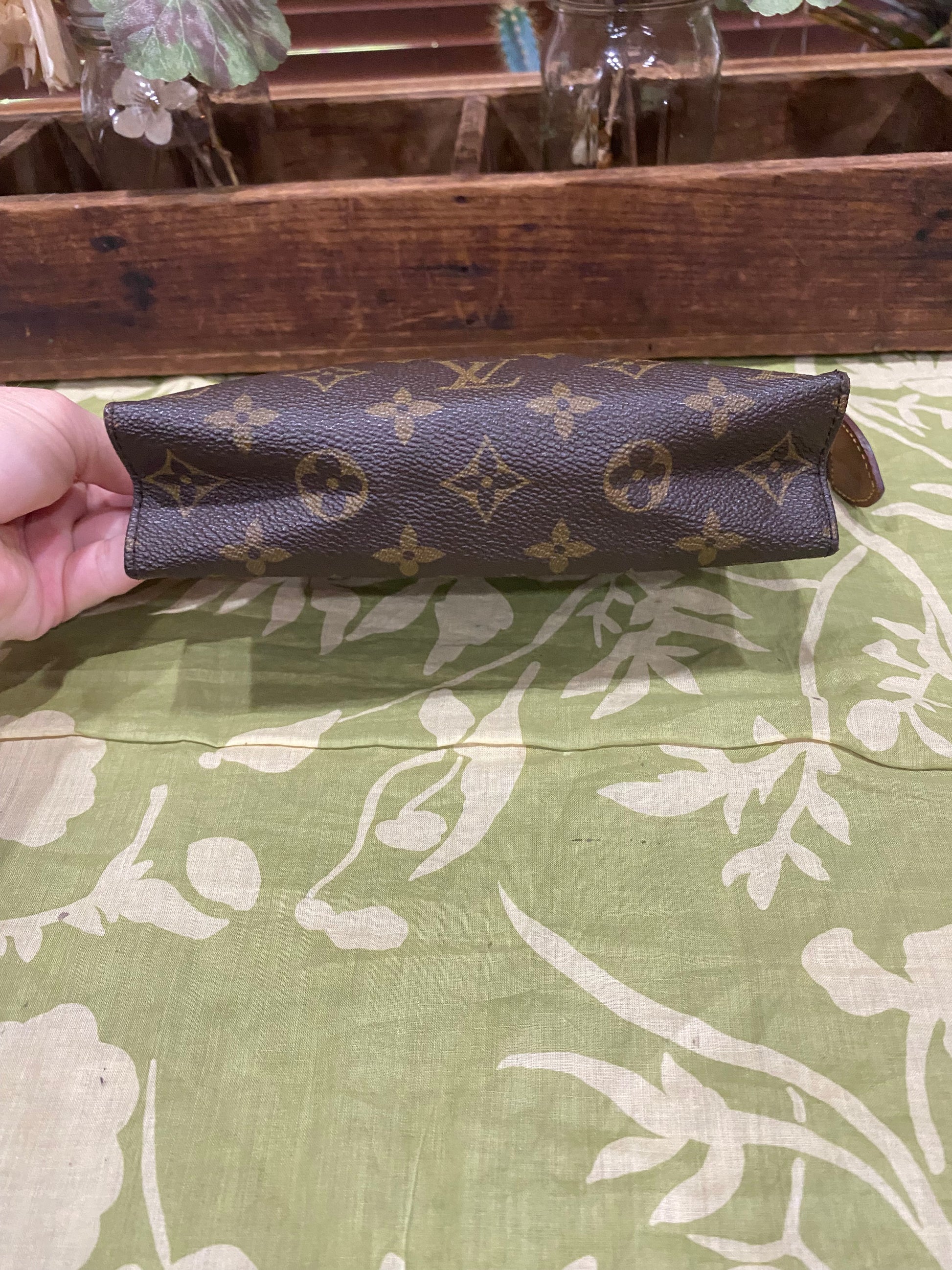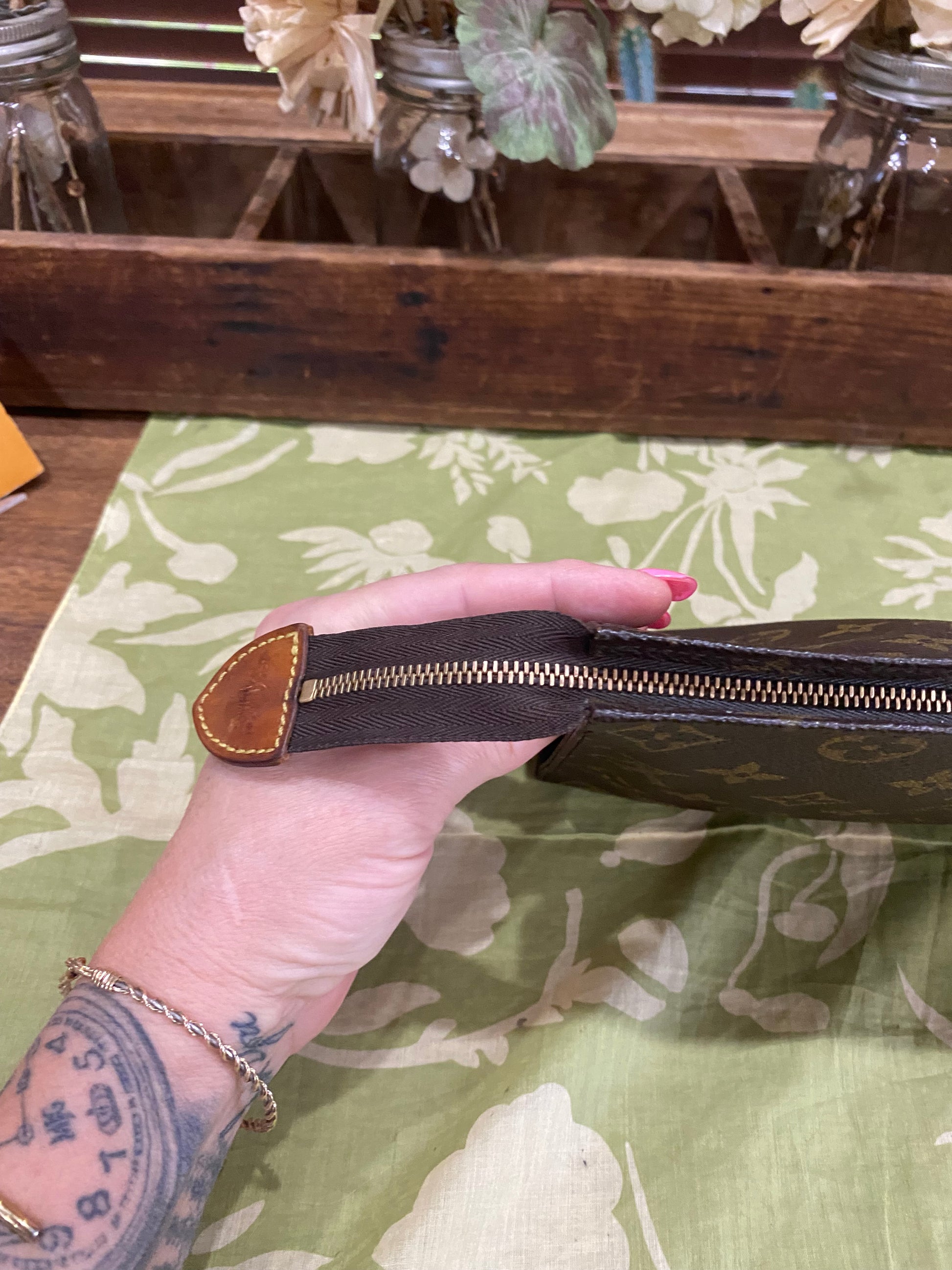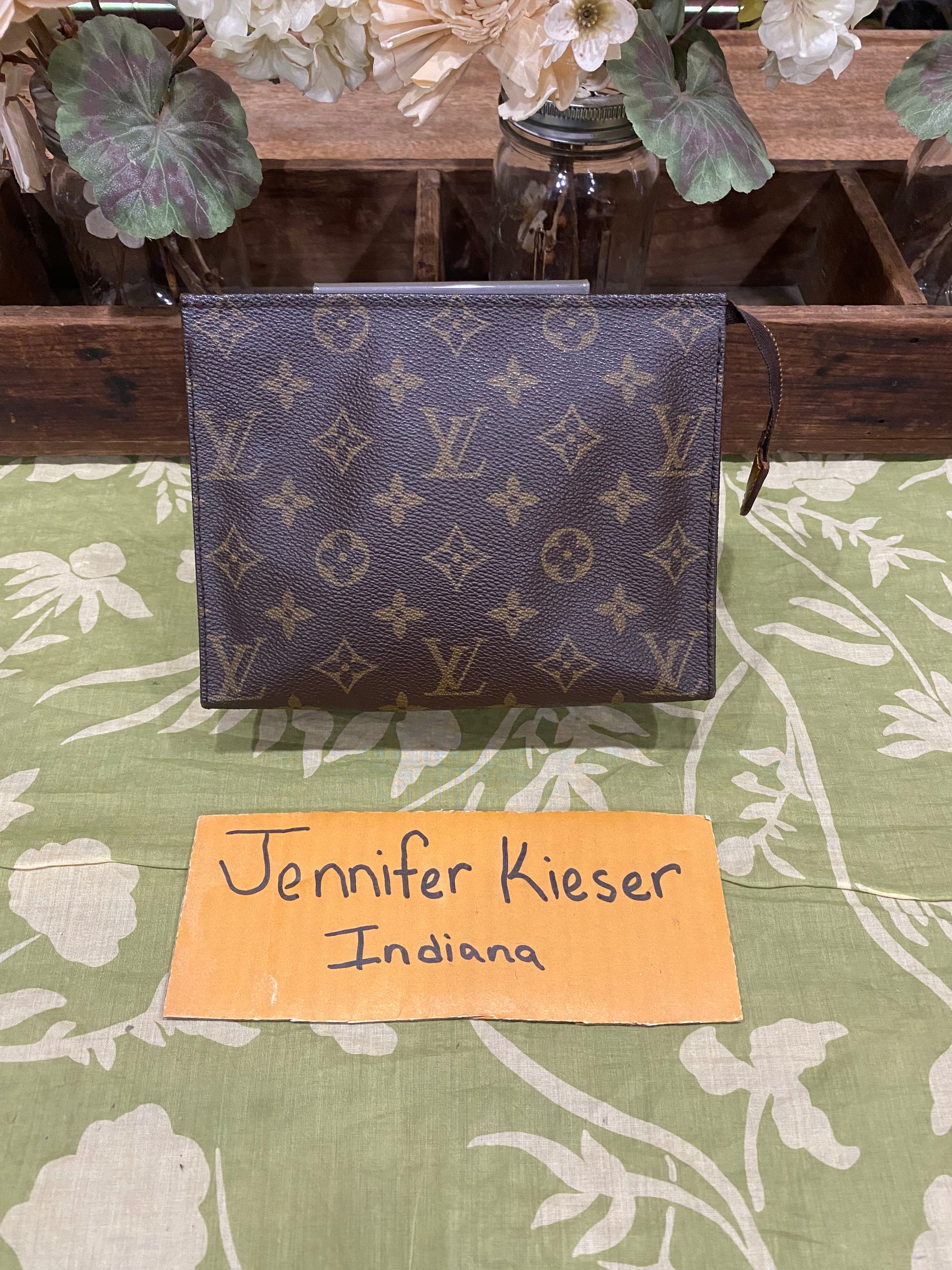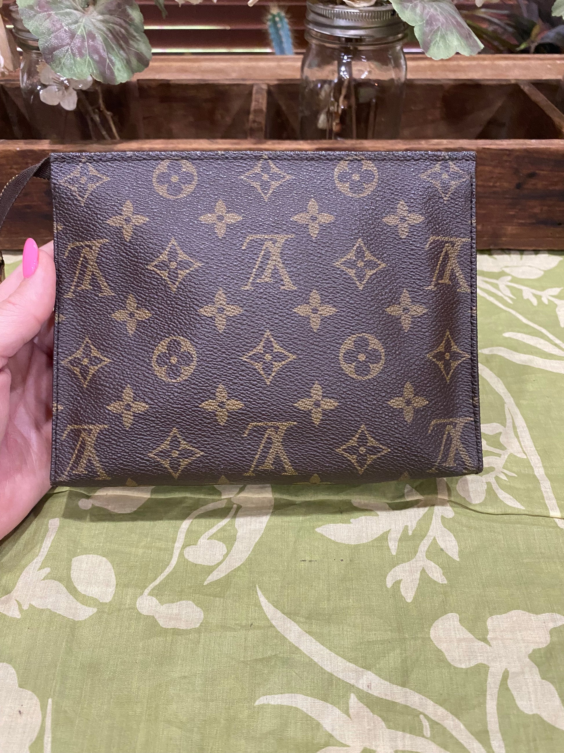 Canvas is free of cracking or tears, print is bright, zipper runs smooth, zipper has tarnish/metal discoloration, leather end tab is a darker patina and has dirt, interior shows signs of normal light use- no peeling or stickiness, no foul smells.