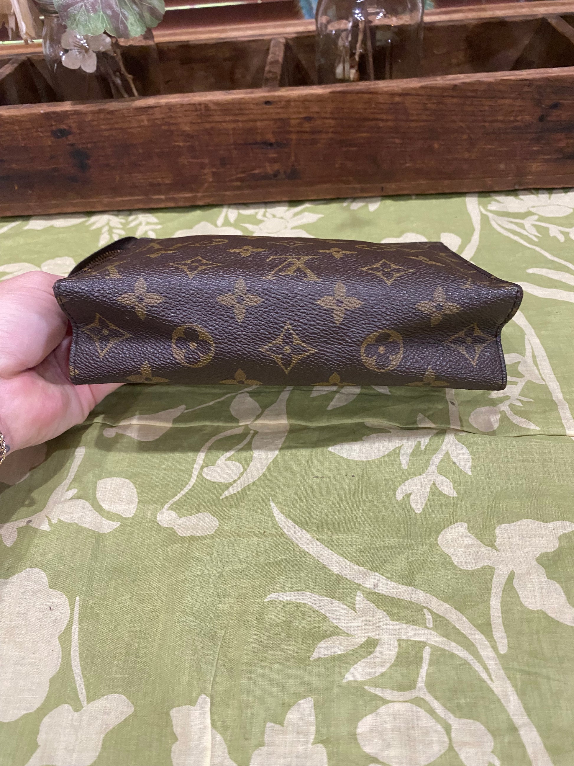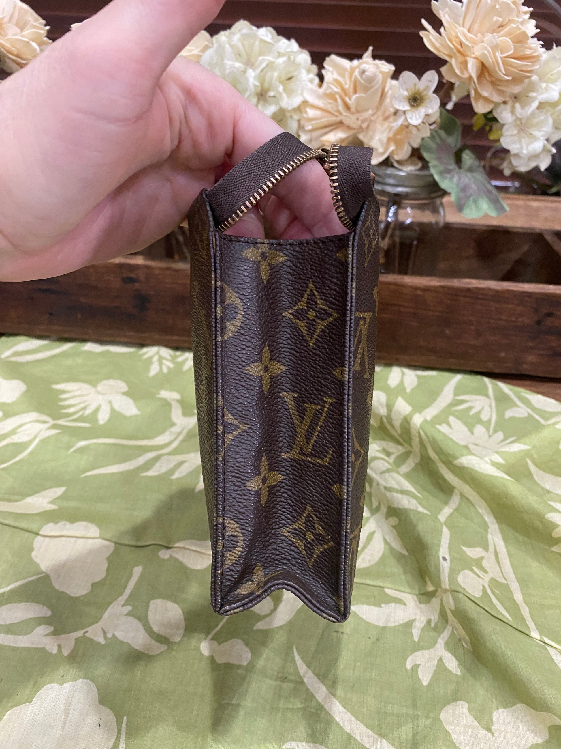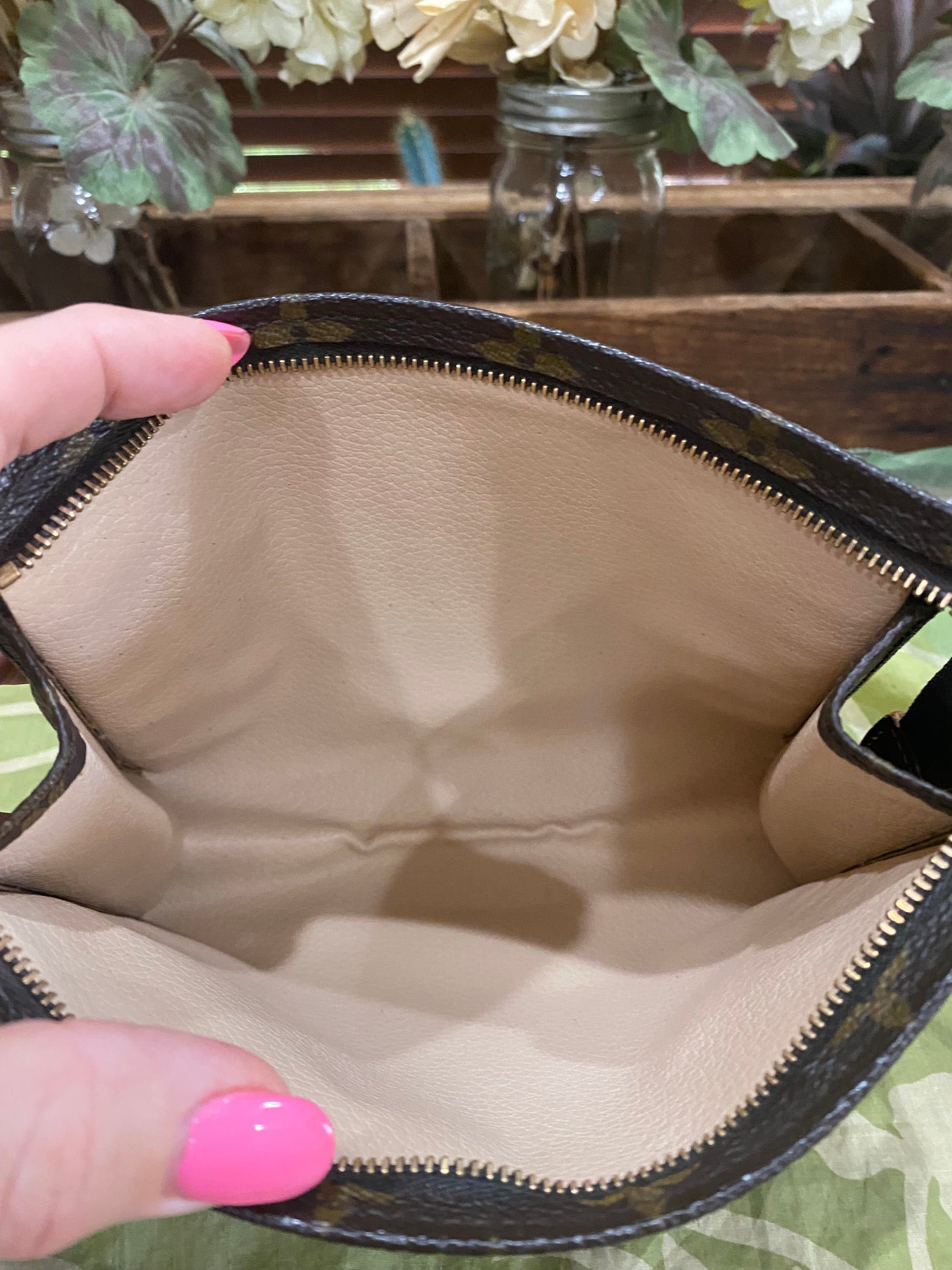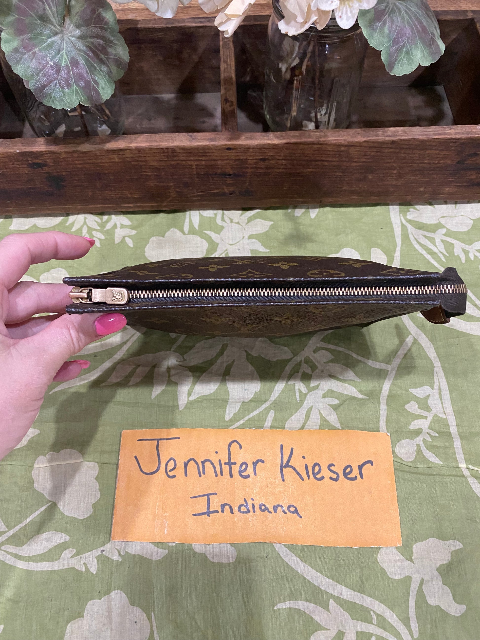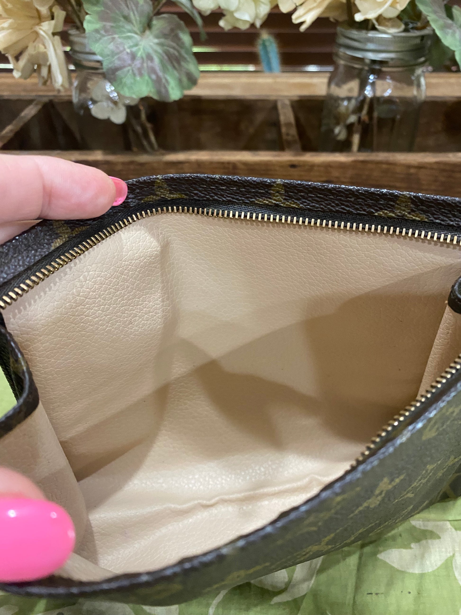 Canvas is free of cracking or tears, print is bright, zipper runs smooth, zipper has tarnish/metal discoloration, leather end tab is a darker patina and has dirt, interior shows signs of normal light use- no peeling or stickiness, no foul smells.