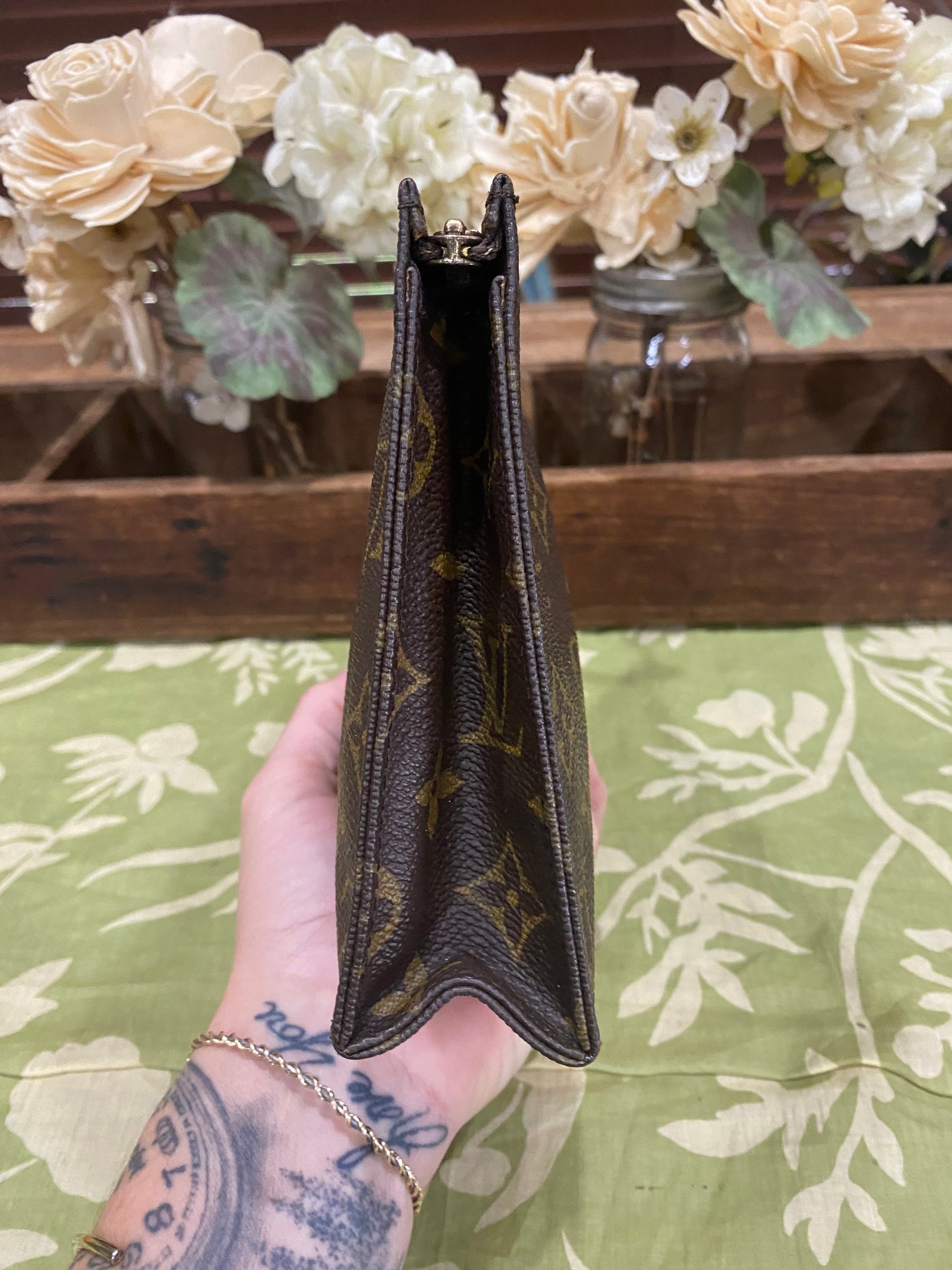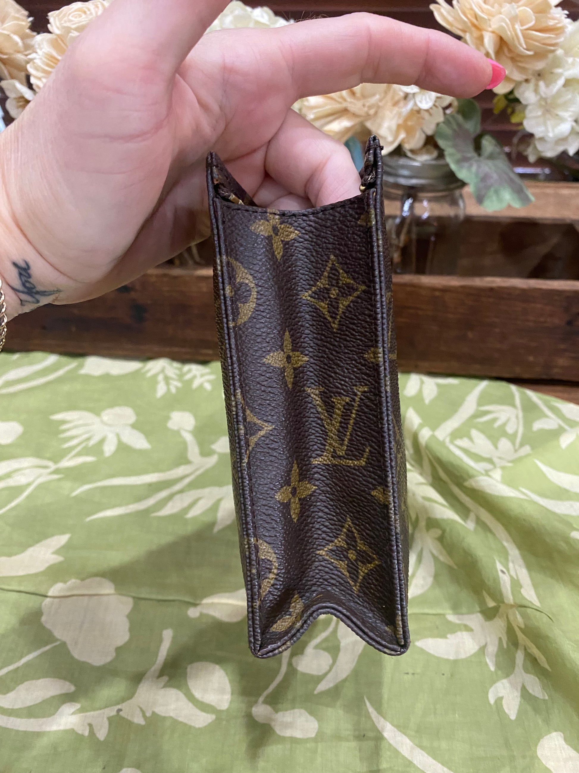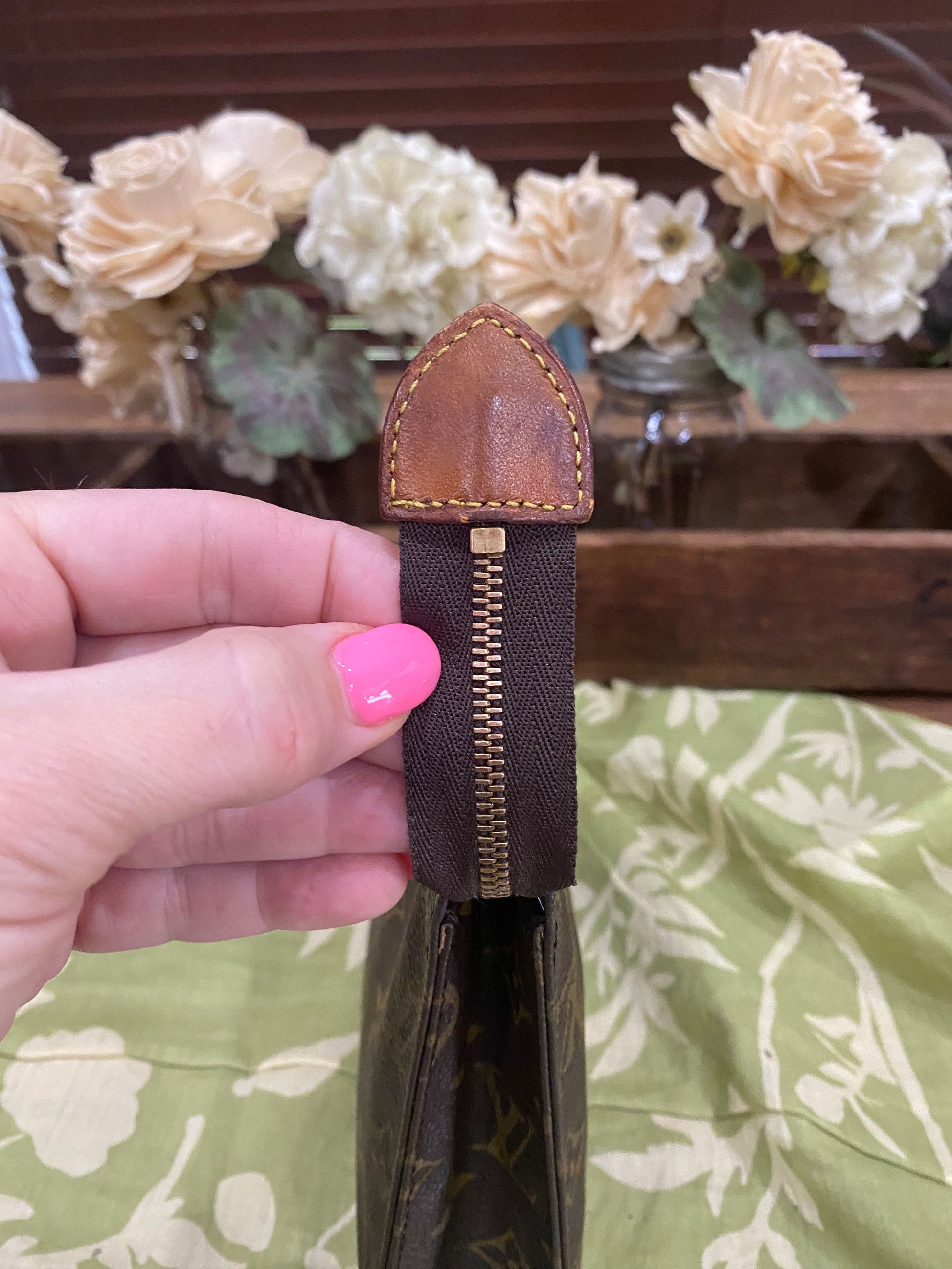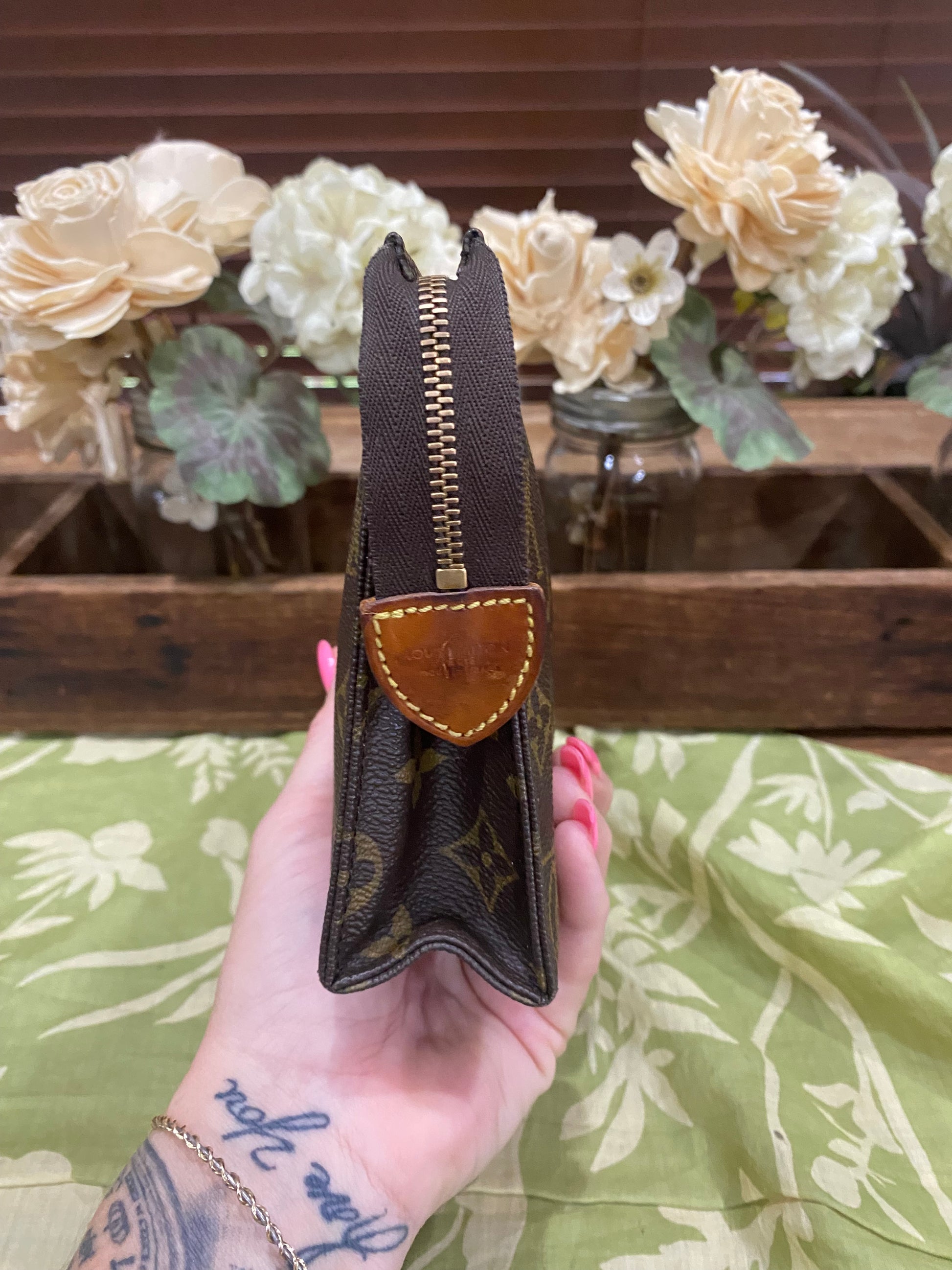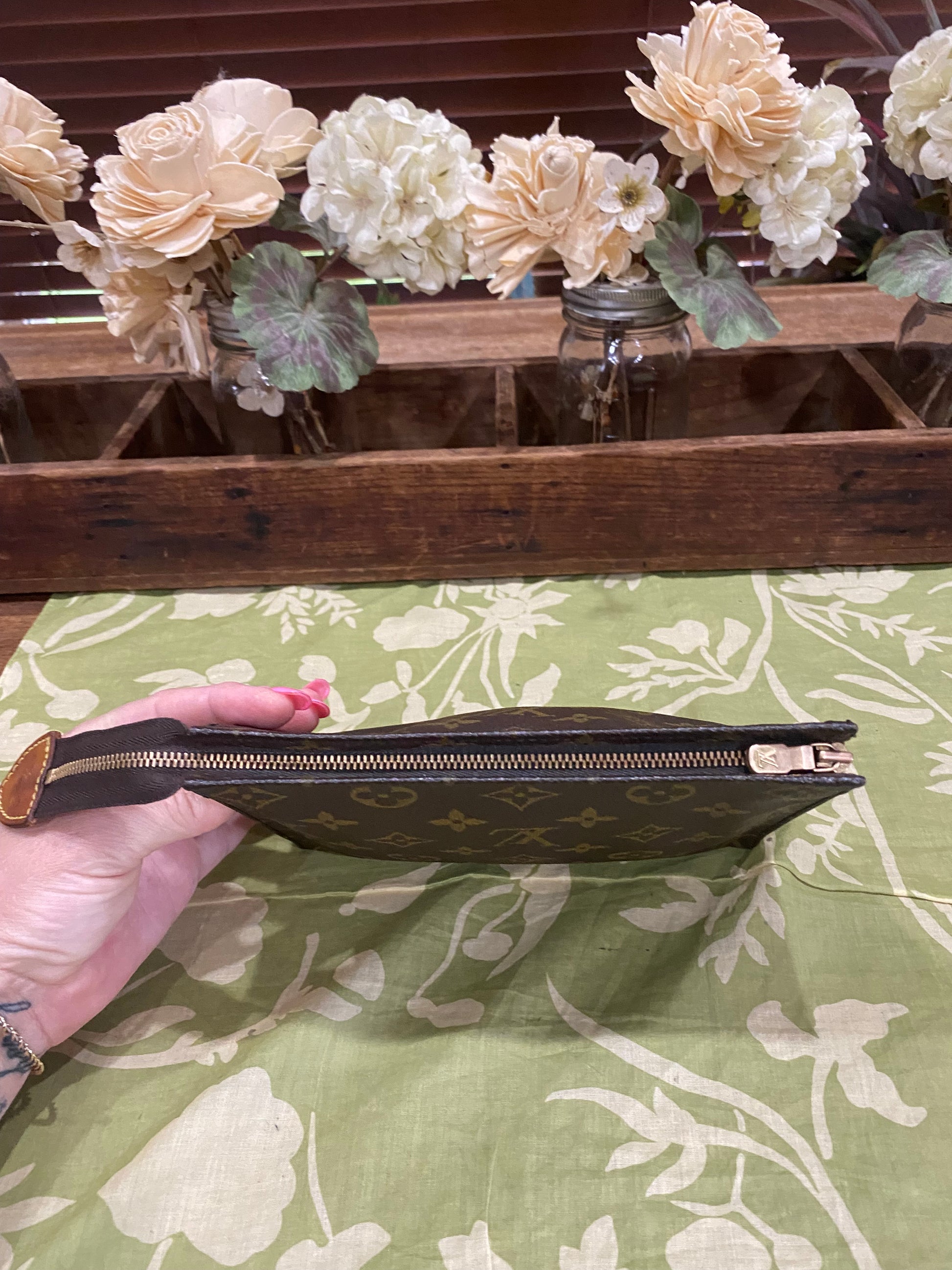 Canvas is free of cracking or tears, print is bright, zipper runs smooth, zipper has tarnish/metal discoloration, leather end tab is a darker patina and has dirt, interior shows signs of normal light use- no peeling or stickiness, no foul smells.