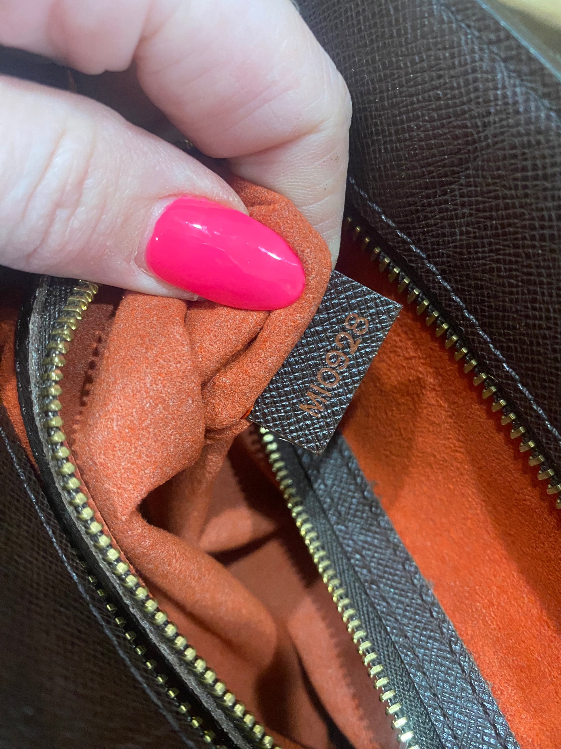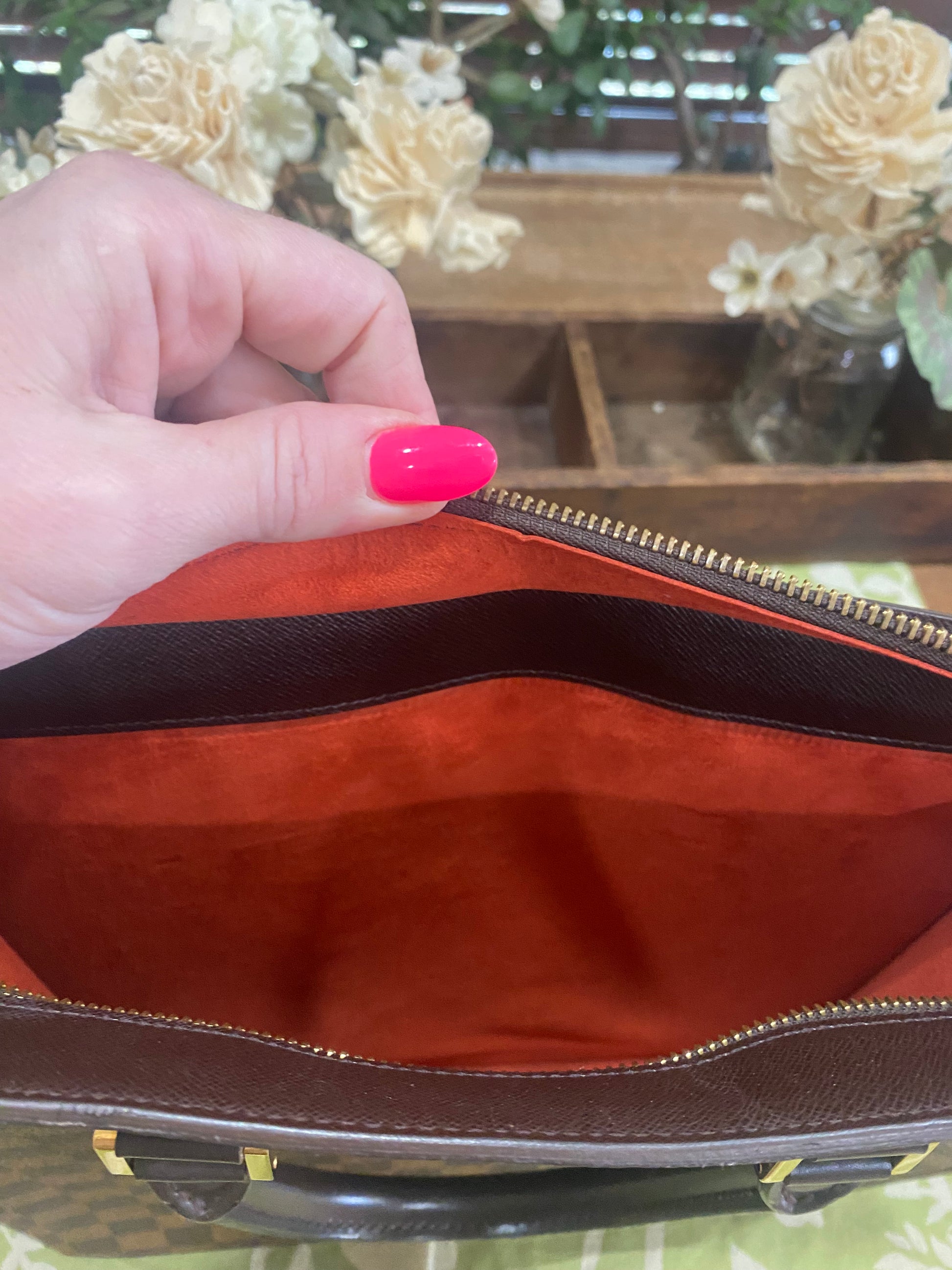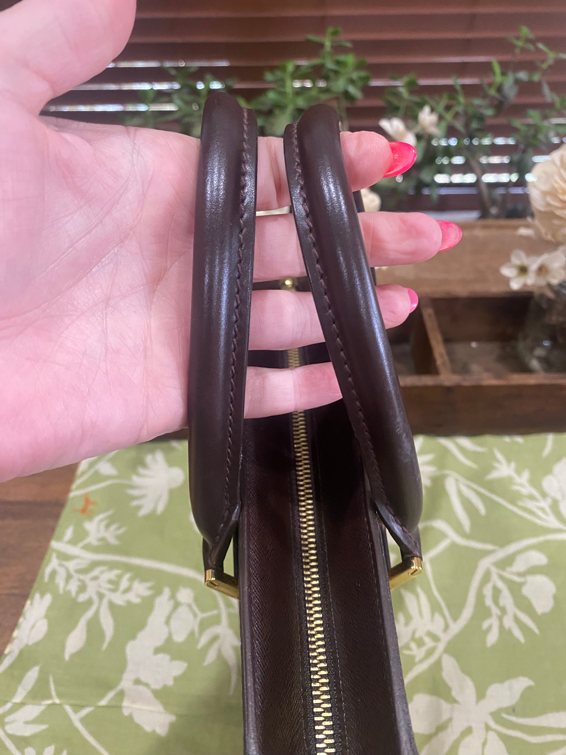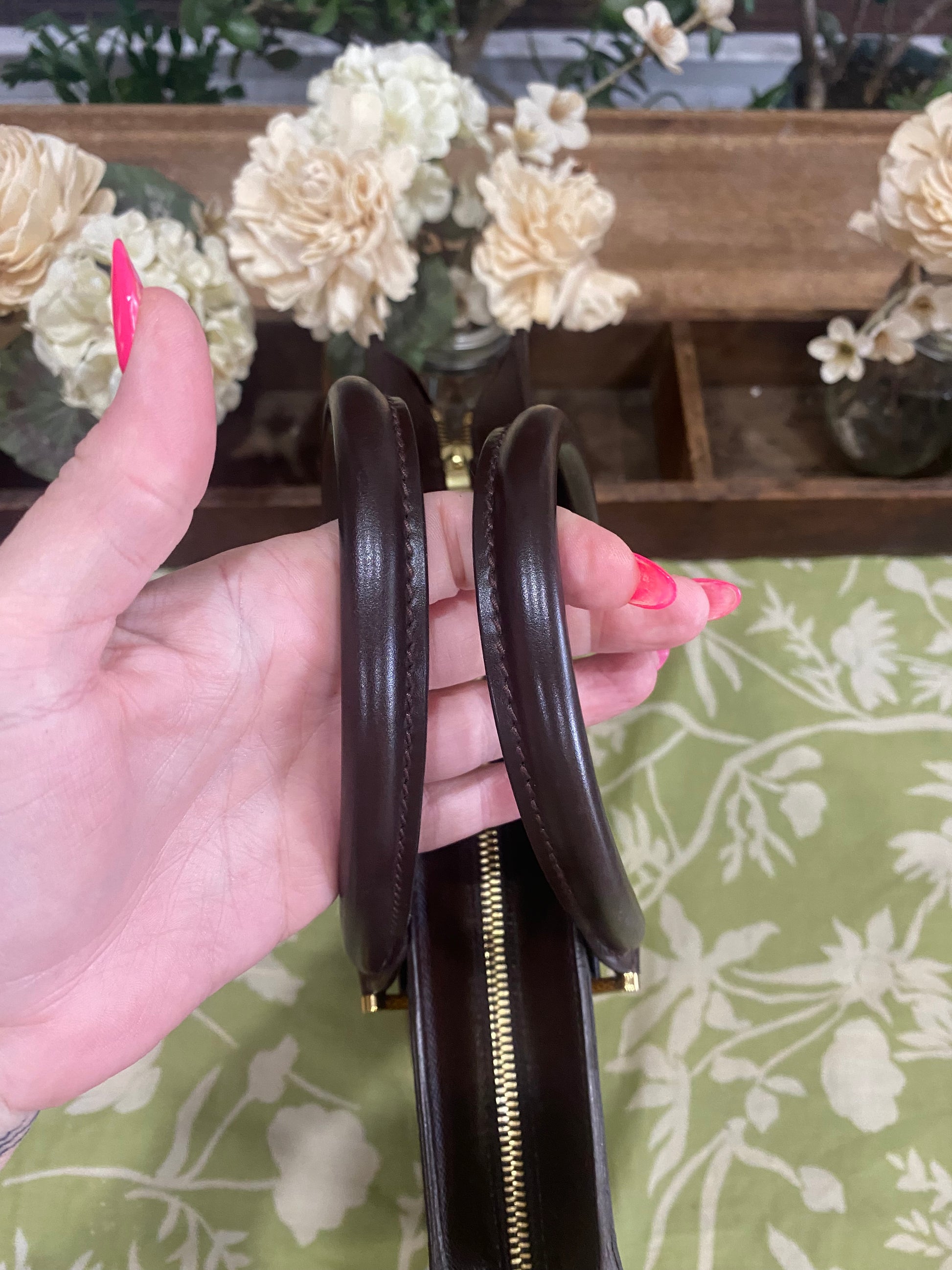 Canvas is stunning- no cracking or tears, print is vibrant, perfect structure, zipper runs smooth, hardware is shiny, glazing has some rubs-hardly noticeable and doesn’t affect use, interior shows signs of normal light wear-light stains/rubs, no foul smells.